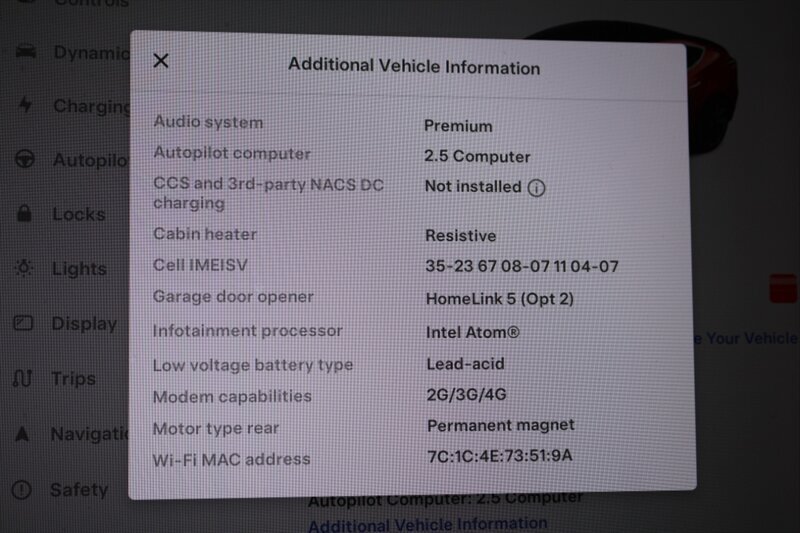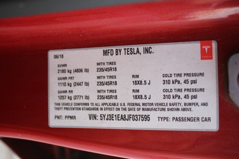 INSTALLED FEATURES: Air filtration, Front air conditioning: automatic climate control, Front air conditioning zones: dual, Rear vents: second row, Airbag deactivation: occupant sensing passenger, Front airbags: dual, Knee airbags: dual front, Side airbags: front, Side curtain airbags: front / rear, Antenna type: element, Auxiliary audio input: Bluetooth / USB, Internet radio app: TuneIn, Radio: FM / HD radio / touch screen display / voice operated, Radio data system, Total speakers: 7, Watts: 200, ABS: 4-wheel, Braking assist, Electronic brakeforce distribution, Electronic parking brake, Front brake diameter: 12.6, Front brake type: ventilated disc, Front brake width: 1.0, Power brakes, Rear brake diameter: 13.2, Rear brake type: ventilated disc, Rear brake width: 0.8, Regenerative braking system, Armrests: rear center with cupholders / rear folding, Center console trim: leatherette, Door trim: faux suede, Floor mat material: carpet, Floor material: cargo area carpet / carpet, Floor mats: front, Interior accents: metallic-tone / wood, Steering wheel trim: leatherette, Ambient lighting, Cargo area light, Cargo cover: hard, Center console: front console with armrest and storage, Cruise control, Cupholders: front / rear, Multi-function remote: panic alarm / proximity entry system / trunk release / vehicle and key memory, One-touch windows: 4, Power outlet(s): 12V front, Power steering: variable/speed-proportional, Power windows: lockout button, Push-button start, Reading lights: front / rear, Rearview mirror: auto-dimming, Remote engine start, Steering wheel mounted controls: audio / cruise control / multi-function / voice control, Storage: accessory hook / door pockets, Universal remote transmitter: Homelink - garage door opener, Vanity mirrors: dual illuminating, Axle ratio: 9.00, Drive mode selector, Electric charge cord: 240 volt, Electric motor battery type: lithium ion, Electric motor charger connector: Tesla (SAE J3400), Electric motor charging time (240V): 12 hours, Electric Motor HP: 258, Electric Motor Power Output (Kilowatts): 192, Electric Motor Torque: 317, EV battery capacity: 75 kWh, EV on-board charger rating: 7.7 kW, Door handle color: chrome, Front bumper color: body-color, Grille color: black, Mirror color: body-color with chrome accents, Rear bumper color: body-color, Rear spoiler: lip, Rear spoiler color: body-color, Rear trunk/liftgate: power operated, Window trim: chrome, Electric motor miles per charge: 310, Infotainment screen size: 15 in., Clock, Compass, Digital odometer, External temperature display, Fuel economy display: range, Multi-function display, Trip odometer, Warnings and reminders: low battery, Daytime running lights: LED, Exterior entry lights: approach lamps, Headlights: LED / auto delay off / auto on/off, Taillights: LED, Side mirror adjustments: manual folding / power, Side mirrors: driver side auto-dimming, Automatic emergency braking: front / front pedestrian, Automatic hazard warning lights, Blind spot safety: sensor/alert, Camera system: rearview, Child safety door locks, Child seat anchors: LATCH system, Crumple zones: front, Dash camera: front recording / rear recording / side recording, Emergency interior trunk release, Impact sensor: battery disconnect / post-collision safety system, Lane deviation sensors, Parking sensors: front / rear, Pre-collision warning system: audible warning / pedestrian detection / visual warning, Rearview monitor: in dash, Traffic sign recognition: adaptive speed limiting, Emergency locking retractors: front / rear, Front seatbelts: 3-point, Rear seatbelts: 3-point, Seatbelt force limiters: front, Seatbelt pretensioners: front, Seatbelt warning sensor: front, Driver seat manual adjustments: height / reclining / 6, Front headrests: integrated / 2, Front seat type: bucket, Passenger seat manual adjustments: height / reclining / 6, Rear headrests: fixed / 3, Rear seat folding: split, Rear seat type: 60-40 split bench, Upholstery: premium cloth, Anti-theft system: alarm / perimeter alarm / vehicle immobilizer, Power door locks: auto-locking, Hill holder control, Stability control, Traction control, Front shock type: twin-tube gas, Front spring type: coil, Front stabilizer bar, Front struts, Front suspension classification: independent, Front suspension type: double wishbone, Rear shock type: twin-tube gas, Rear spring type: coil, Rear stabilizer bar, Rear struts, Rear suspension classification: independent, Rear suspension type: multi-link, Navigation data: real time traffic, Navigation system: touch screen display / voice operated, Smart device app compatibility: Tesla App, Smart device app function: horn/light operation / lock operation / maintenance scheduling / maintenance status / security event/collision alert / vehicle location / window operation, Wi-Fi: hotspot compatible, Wireless data link: Bluetooth, Tire Pressure Monitoring System, Tire type: all season, Wheel covers: full, Wheels: aluminum alloy, Front wipers: rain sensing / speed sensitive / variable intermittent, Power windows: remotely operated / safety reverse, Tinted glass, Window defogger: rear