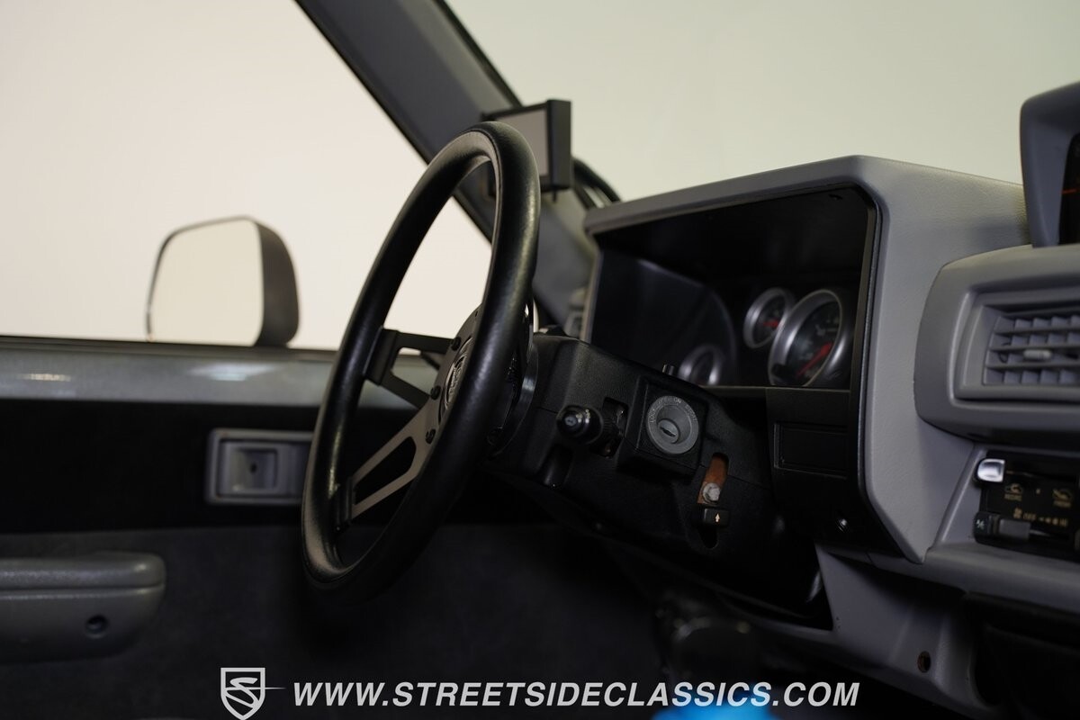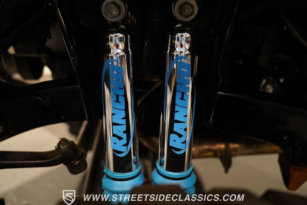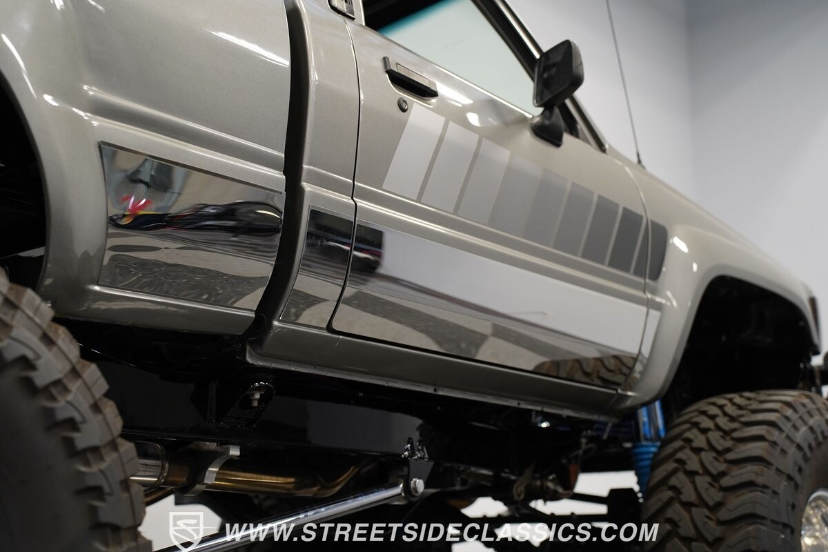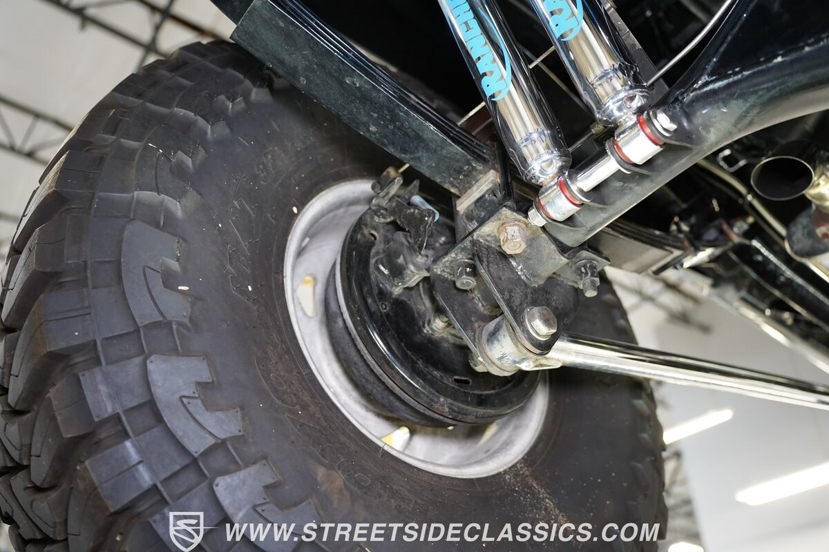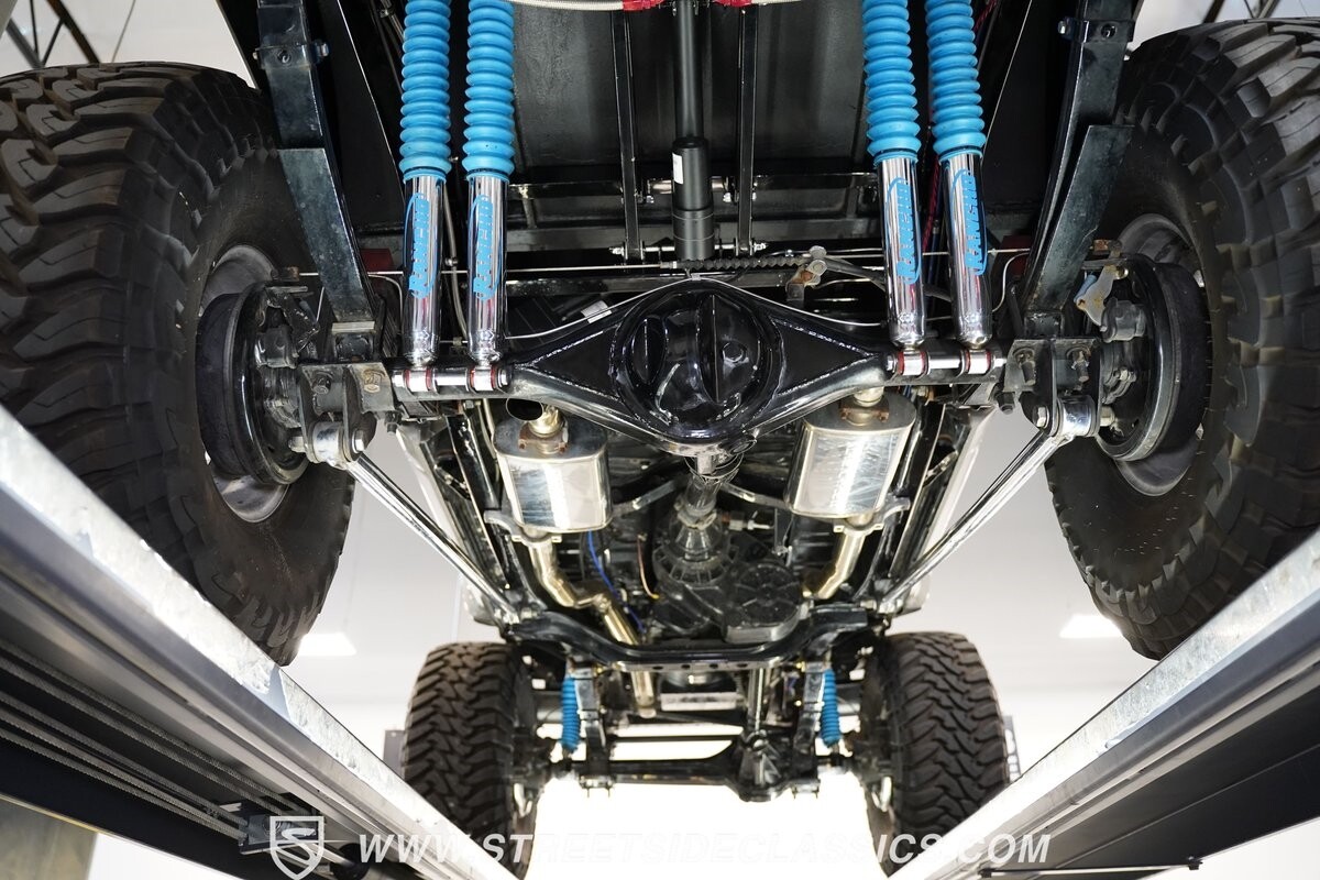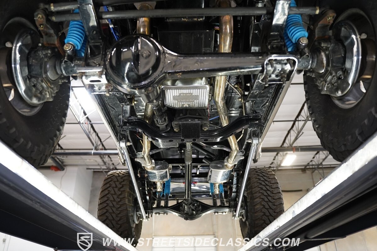 Pulling the custom hood pins and lifting the hood reveals a Chevrolet 350 cubic inch engine mated to a TH350 automatic transmission that sends power to factory Toyota front and rear axles. The detailed engine bay is equipped with Holley Sniper fuel injection, air conditioning, chrome alternator, Holley Sniper aluminum valve covers, serpentine belt system, chrome Edelbrock intake manifold, MSD ignition components, aluminum radiator, aluminum catch can and more. The custom exhaust comes through the long tube headers and hugs the frame with small mufflers leading to a dump just in front of the rear axle.