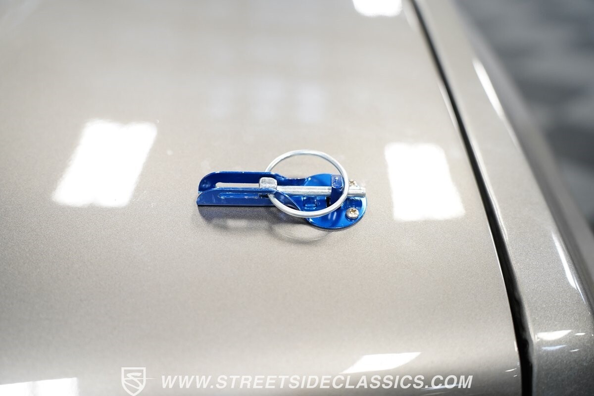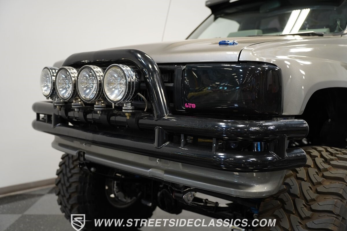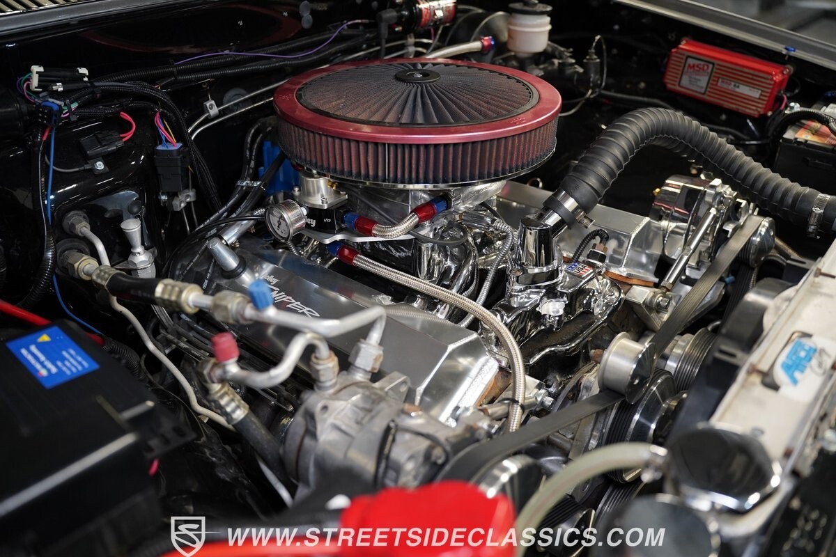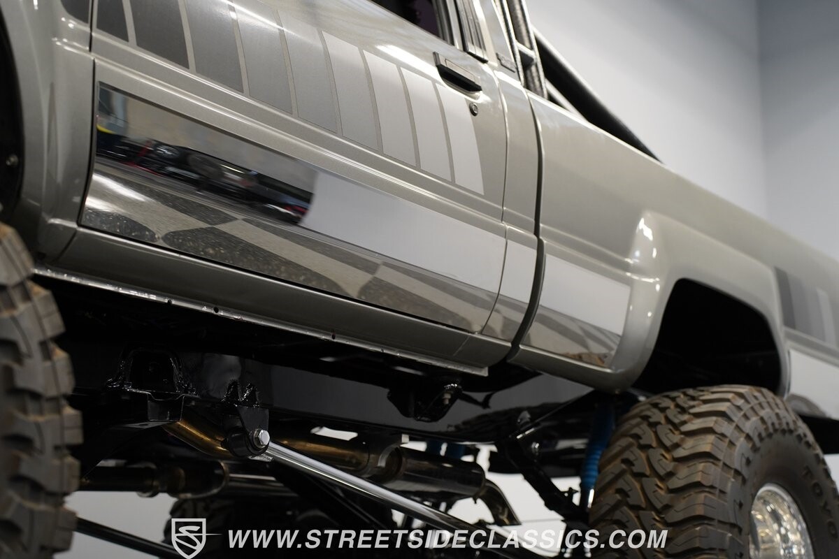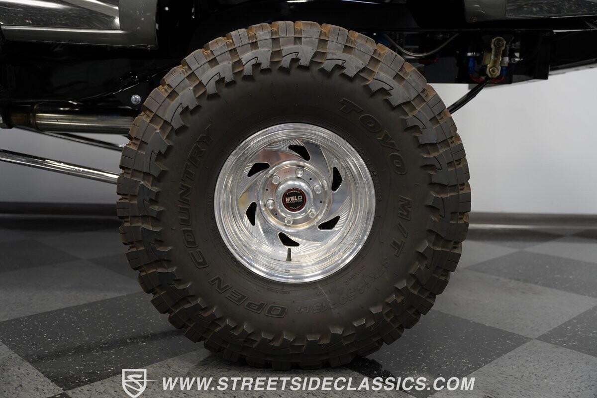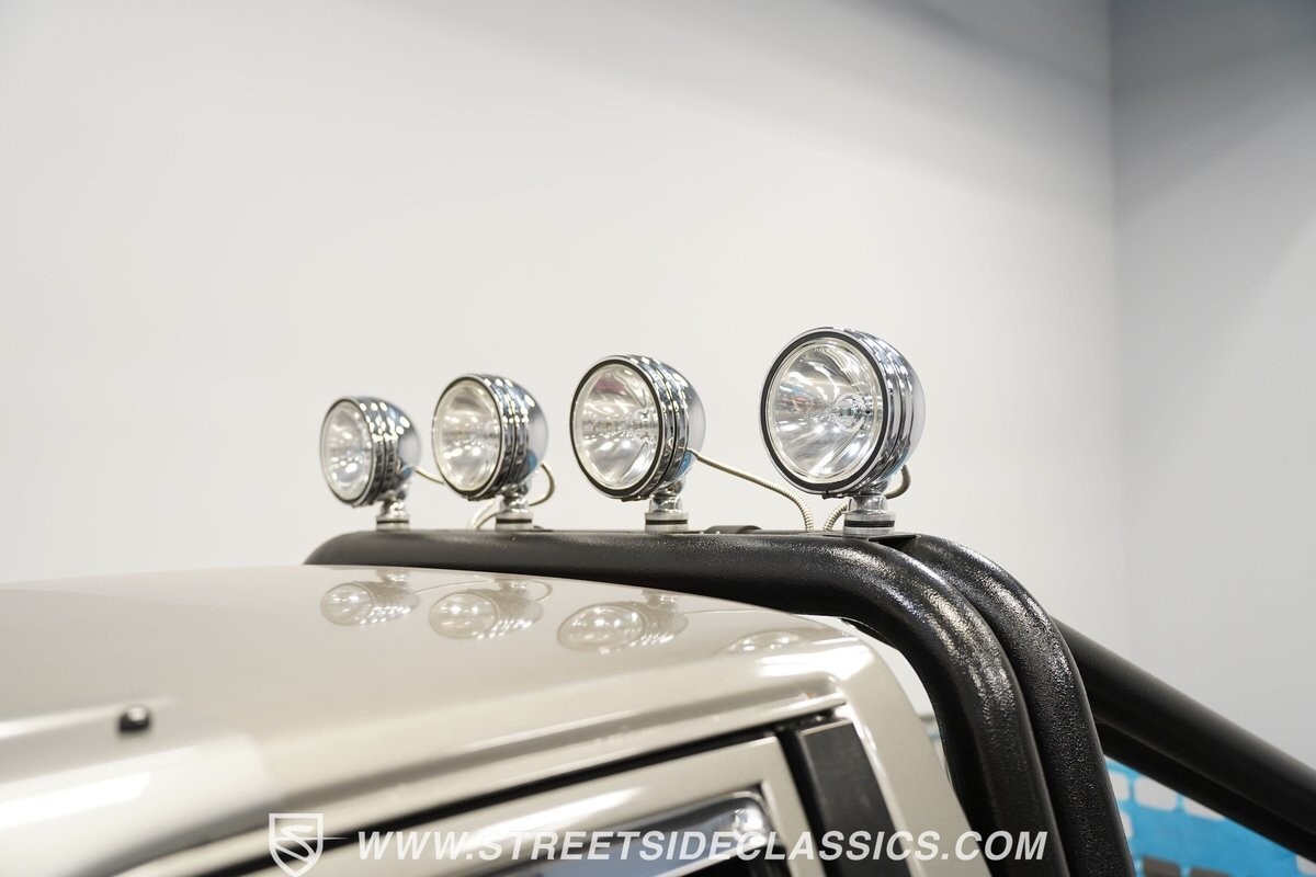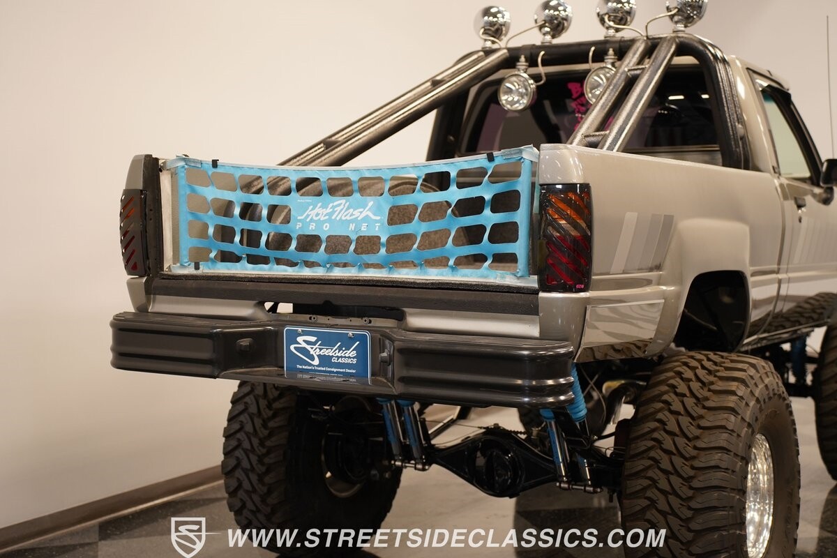 Pulling the custom hood pins and lifting the hood reveals a Chevrolet 350 cubic inch engine mated to a TH350 automatic transmission that sends power to factory Toyota front and rear axles. The detailed engine bay is equipped with Holley Sniper fuel injection, air conditioning, chrome alternator, Holley Sniper aluminum valve covers, serpentine belt system, chrome Edelbrock intake manifold, MSD ignition components, aluminum radiator, aluminum catch can and more. The custom exhaust comes through the long tube headers and hugs the frame with small mufflers leading to a dump just in front of the rear axle.