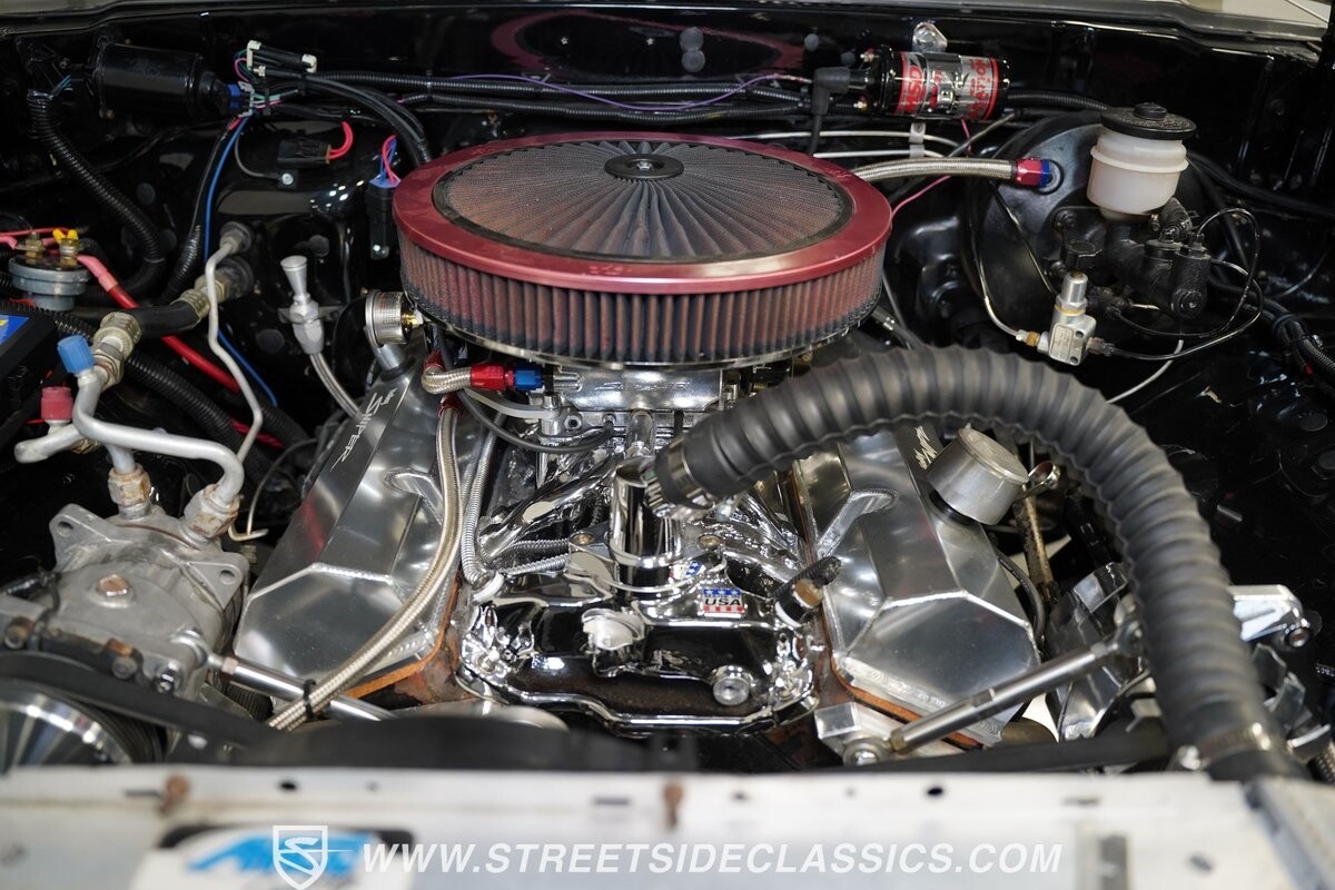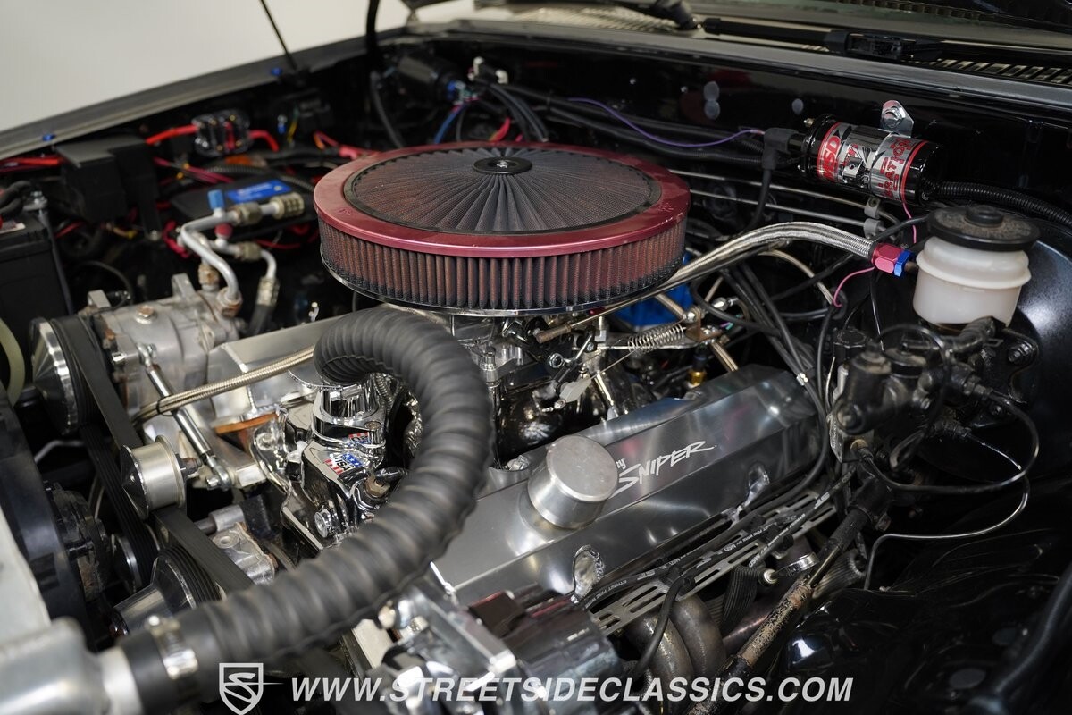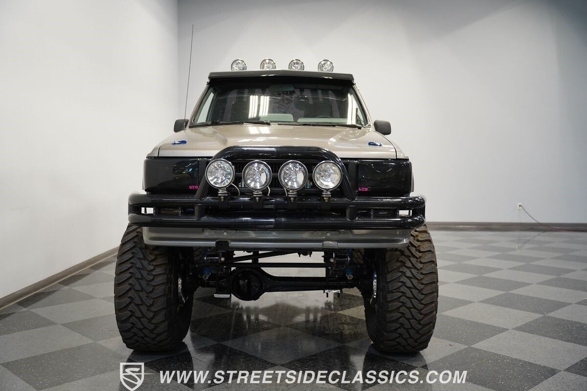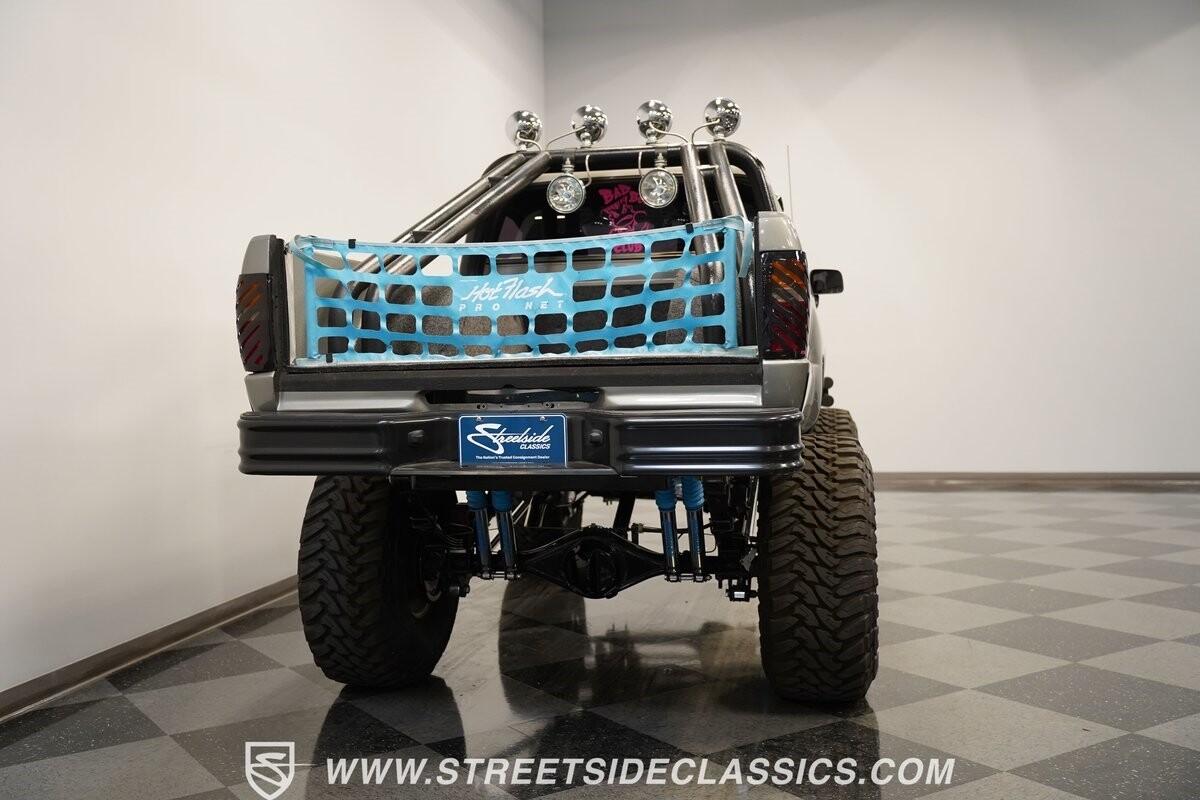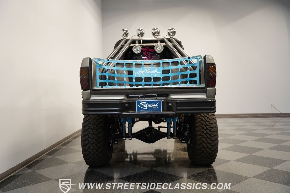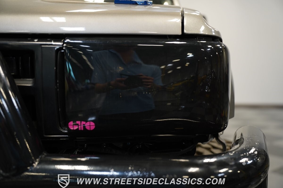 Pulling the custom hood pins and lifting the hood reveals a Chevrolet 350 cubic inch engine mated to a TH350 automatic transmission that sends power to factory Toyota front and rear axles. The detailed engine bay is equipped with Holley Sniper fuel injection, air conditioning, chrome alternator, Holley Sniper aluminum valve covers, serpentine belt system, chrome Edelbrock intake manifold, MSD ignition components, aluminum radiator, aluminum catch can and more. The custom exhaust comes through the long tube headers and hugs the frame with small mufflers leading to a dump just in front of the rear axle.