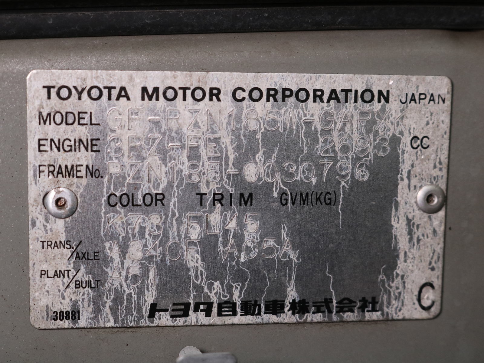 104,623 kilometers Introduced in 1984, the first generation Toyota Hilux Surf was designed and built on the frame of the two door Hilux pickup truck by removing the rear wall and then mounting a canopy on the bed. This was the first step in transitioning to a more family friendly, multi-use vehicle and, with comfort and safety at the forefront, future generations were manufactured with a more sophisticated steel wagon body. The third generation, as represented here, brought with it a renewed chassis including a larger wheelbase and treads to further improve stability and ride comfort. The previously available two-door option was discontinued, and the Hilux Surf was sold exclusively as a four-door vehicle with a top-hinged tailgate. In Japan, the third generation model was offered with three different choices of engine: Options included the gasoline powered 3.4 Liter V6 and 2.7 Liter I4, or a diesel powered 3.0 Liter I4. All units were powered by a part-time 4-wheel drive and utilized either a 4-speed automatic transmission, or a 5-speed manual transmission, depending on the trim level. Production continued into the year 2009, where the Toyota Hilux Surf’s 25 year run came to a close. Third party pre-purchase inspections are welcomed and encouraged. All vehicles sold by Duncan come with a clean U.S. title.