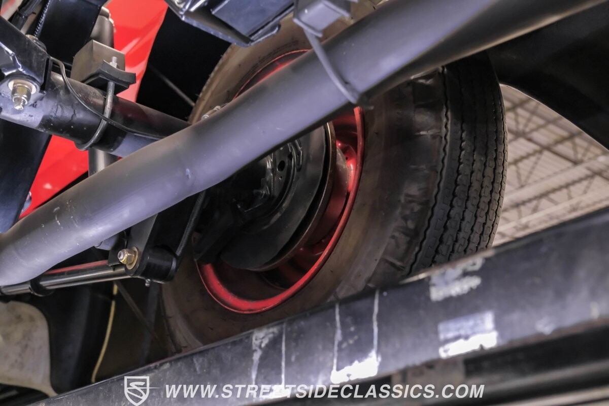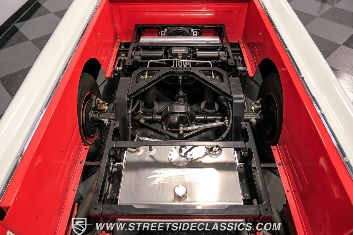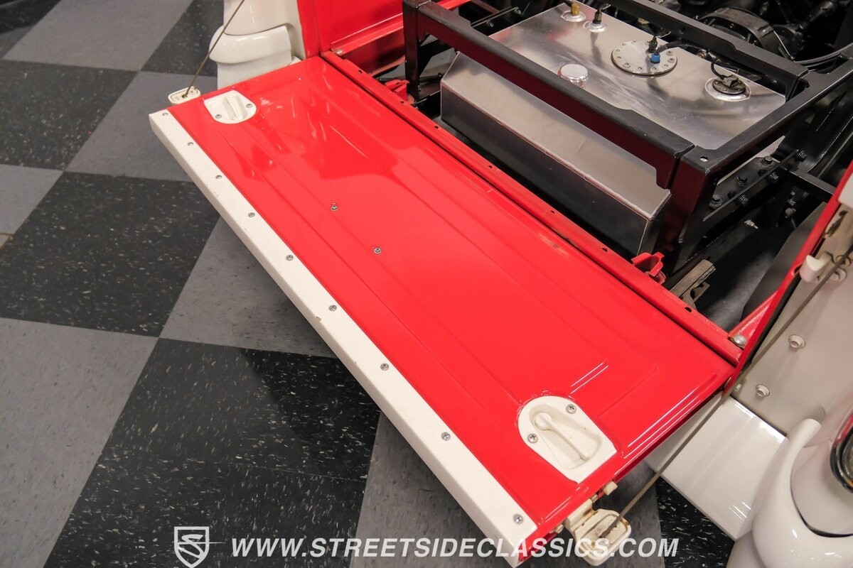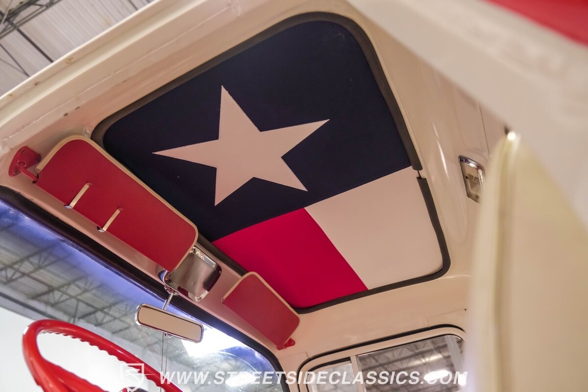 Inside, the Gypsy Red interior pays homage to the truck's roots while incorporating modern comforts. The bench seat, wrapped in vinyl, offers a classic look with improved support. A Dakota Digital gauge cluster provides precise readouts, while the Vintage Air system keeps the cabin comfortable. The Texas flag headliner adds a unique touch, complementing the red and white color scheme that flows throughout the interior.