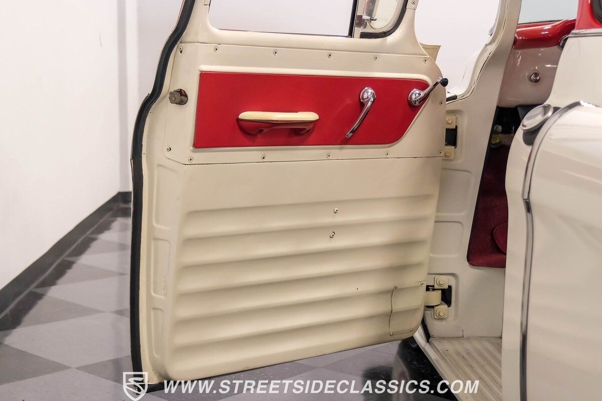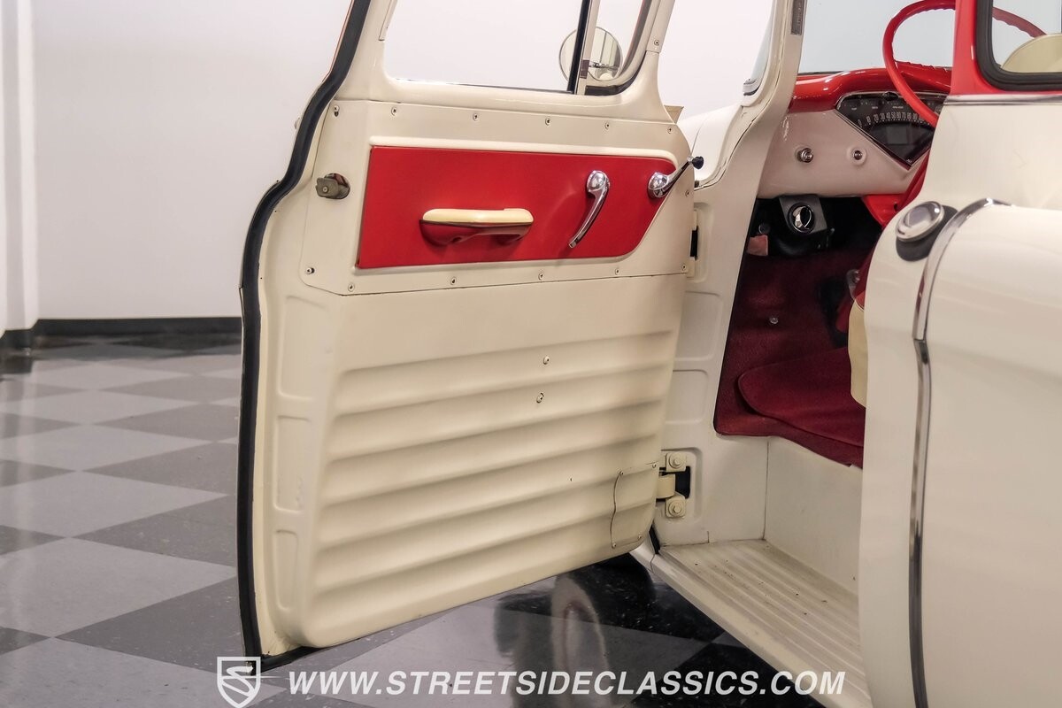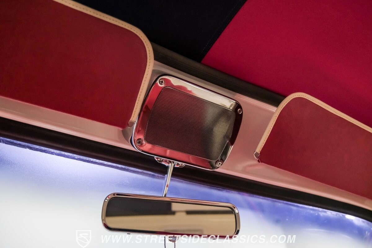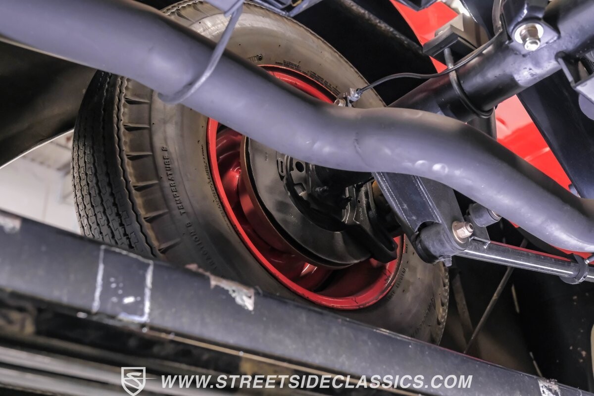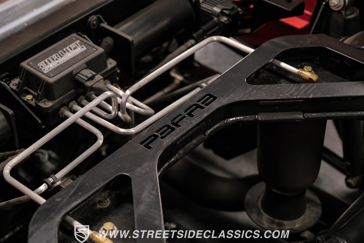 Inside, the Gypsy Red interior pays homage to the truck's roots while incorporating modern comforts. The bench seat, wrapped in vinyl, offers a classic look with improved support. A Dakota Digital gauge cluster provides precise readouts, while the Vintage Air system keeps the cabin comfortable. The Texas flag headliner adds a unique touch, complementing the red and white color scheme that flows throughout the interior.