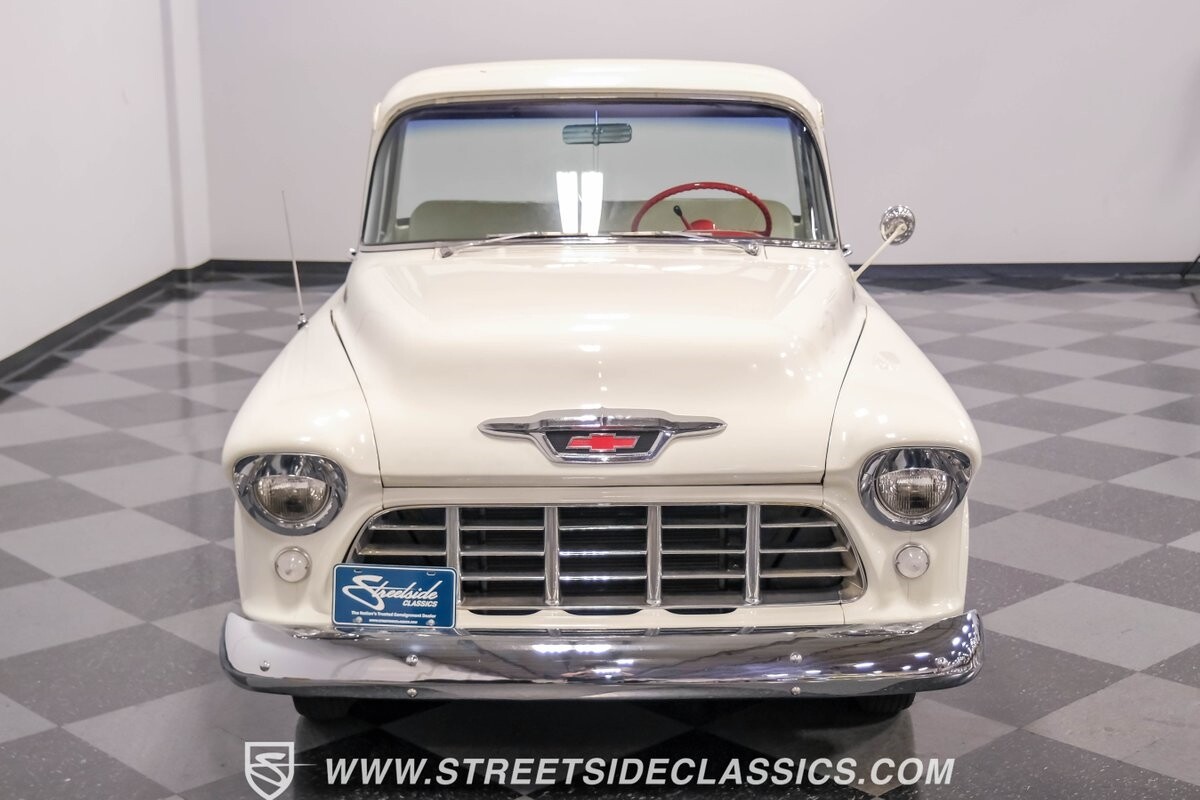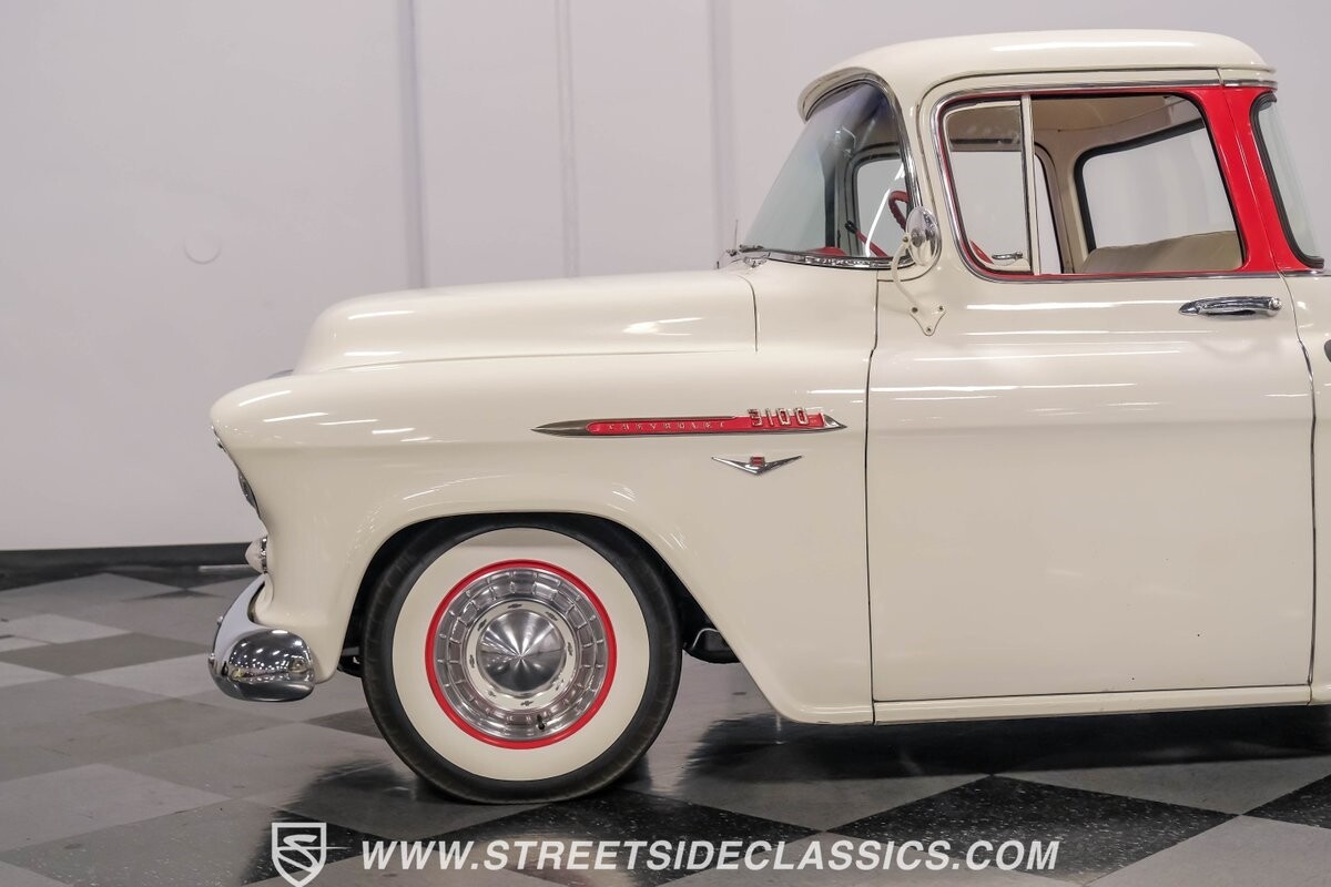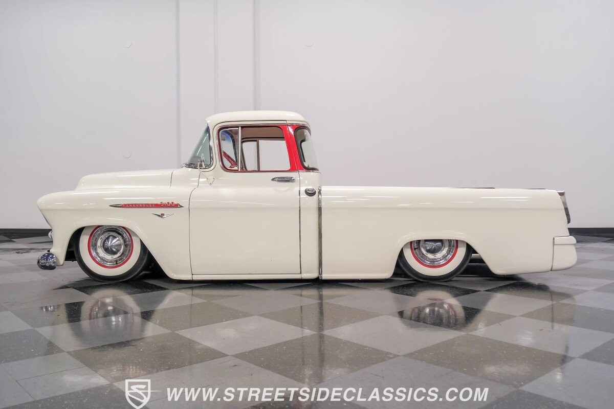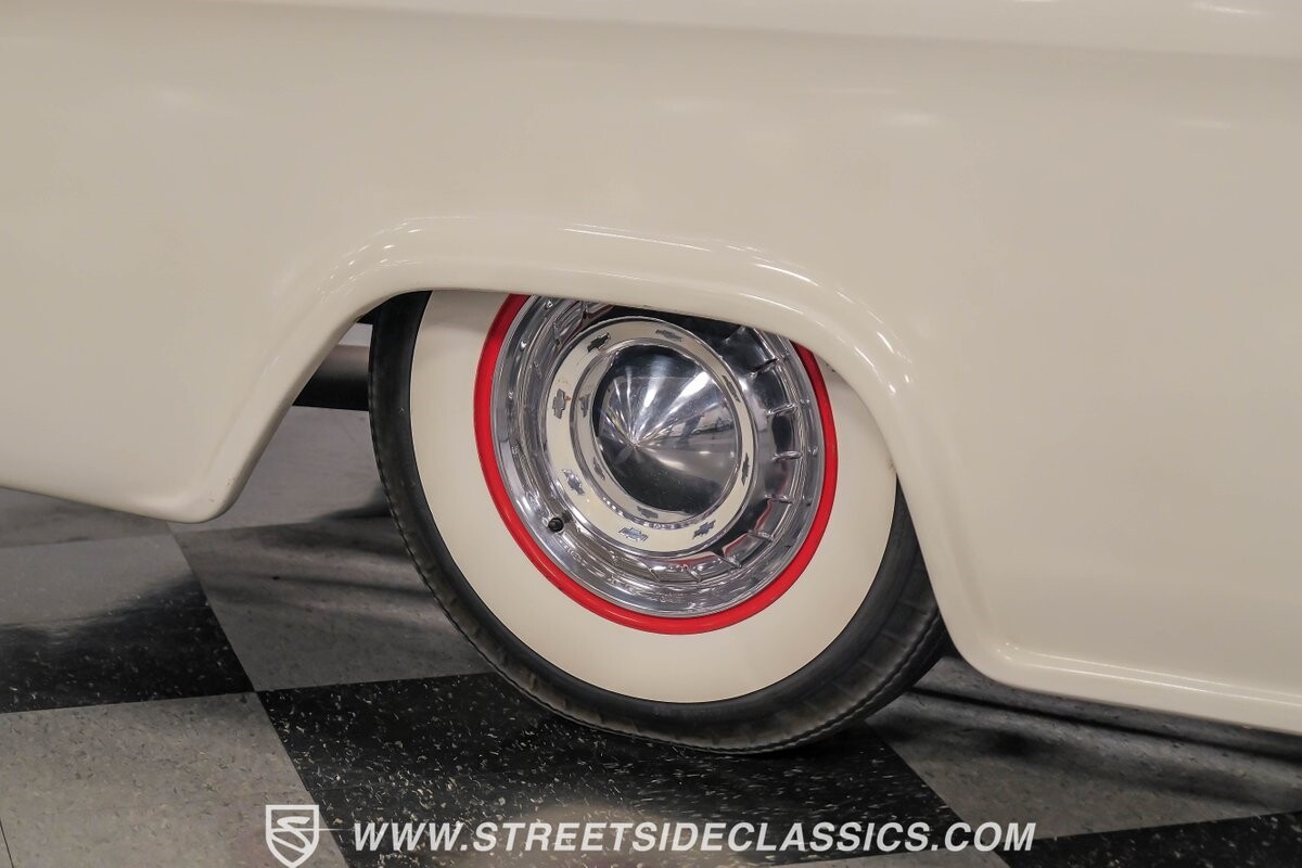 This 1955 Chevrolet 3100 Cameo Restomod showcases the evolution of an American classic. The India Ivory paint job gleams under the sun, accentuating the truck's iconic lines. Rolling on 15" wheels wrapped in 6.70R15 American Classic wide whitewall tires, this Chevy strikes a perfect balance between vintage appeal and modern performance. The custom PBFAB suspension, featuring tubular A-arms and air-ride suspension at all four corners, provides a stance that's ready for both show and go.