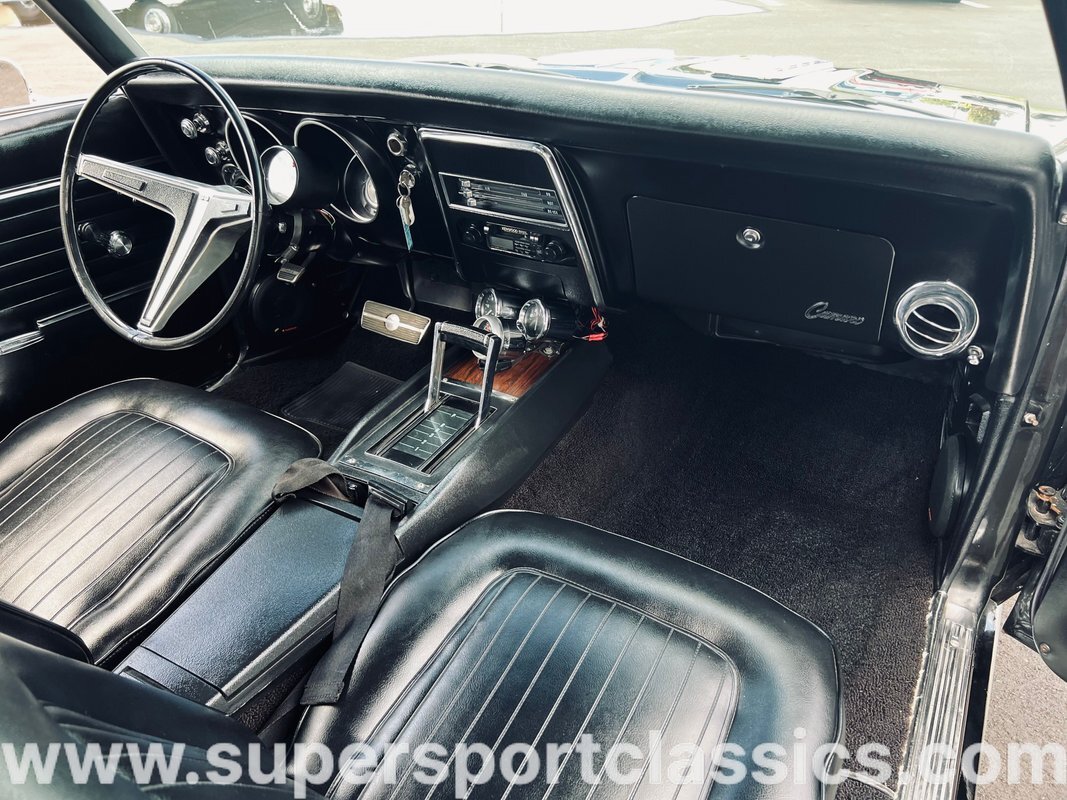 This Beautiful Black 1968 Chevrolet Camaro is equipped with a 383 Stroker v8 and auto transmission, Power Steering, Wilwood Power Disc Brakes, Upgraded Intake Manifold, Upgraded Carburetor, Upgraded Headers, Upgraded MSD Ignition, Aluminum Heads, Aluminum Radiator and Electric Fan, Upgraded Center Console Performance Gauge Cluster, Original Wood Trim Center Console, Original Leather Bucket Seats, Leather Rear Bench Seat, US Mag Chrome Wheels, Cowl Induction Hood, and much more!
