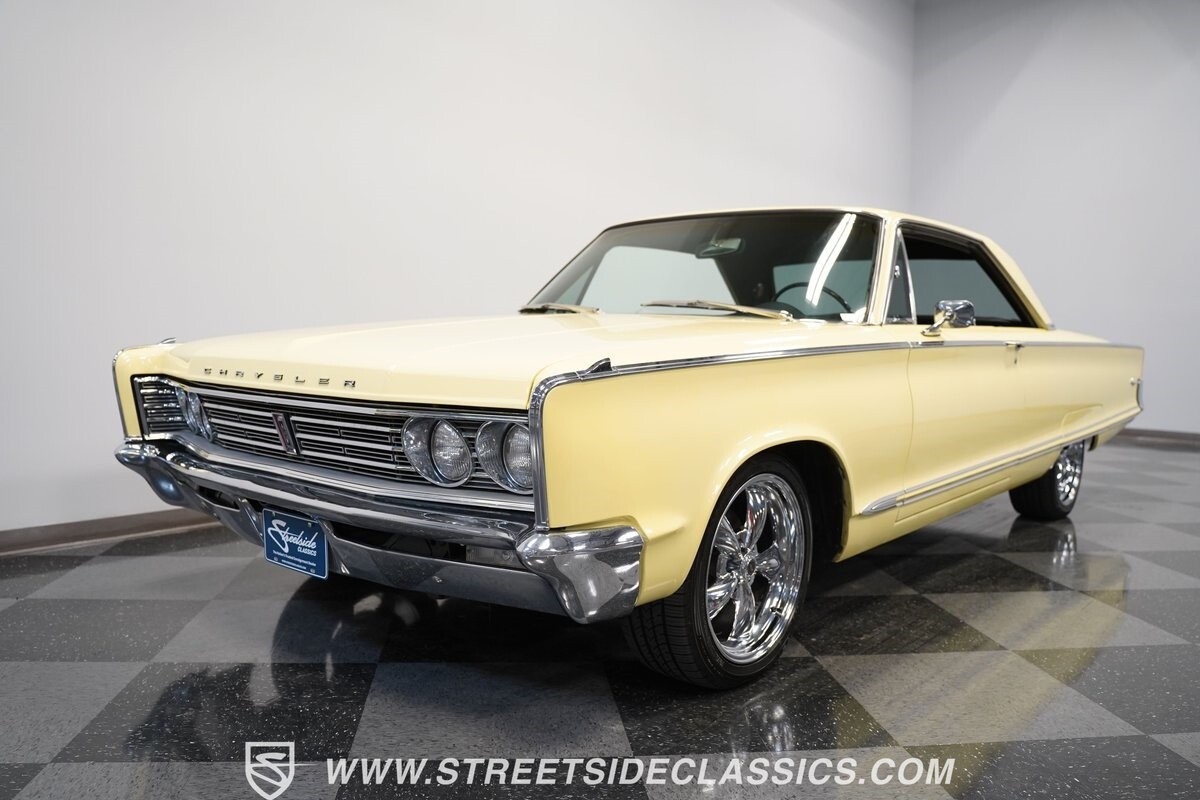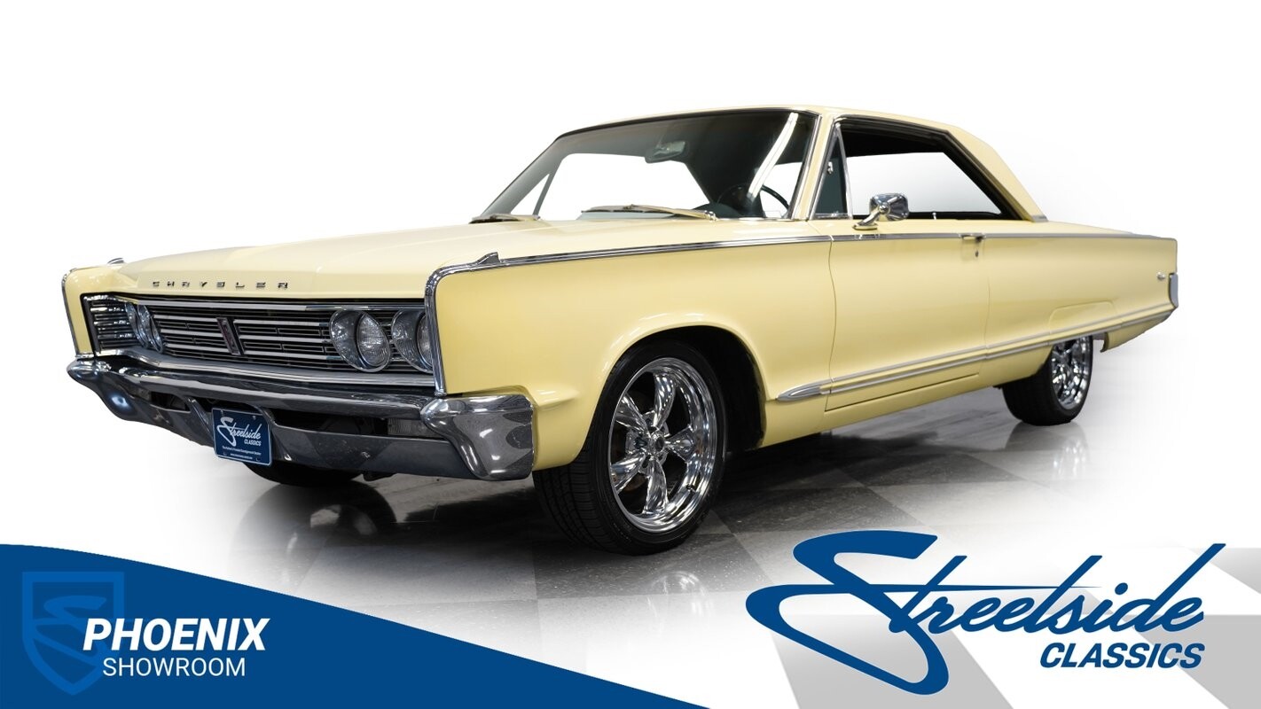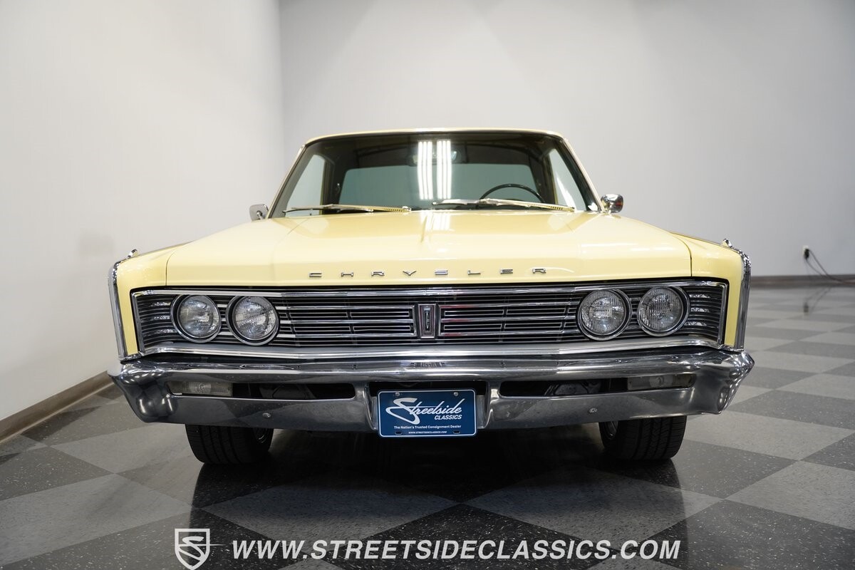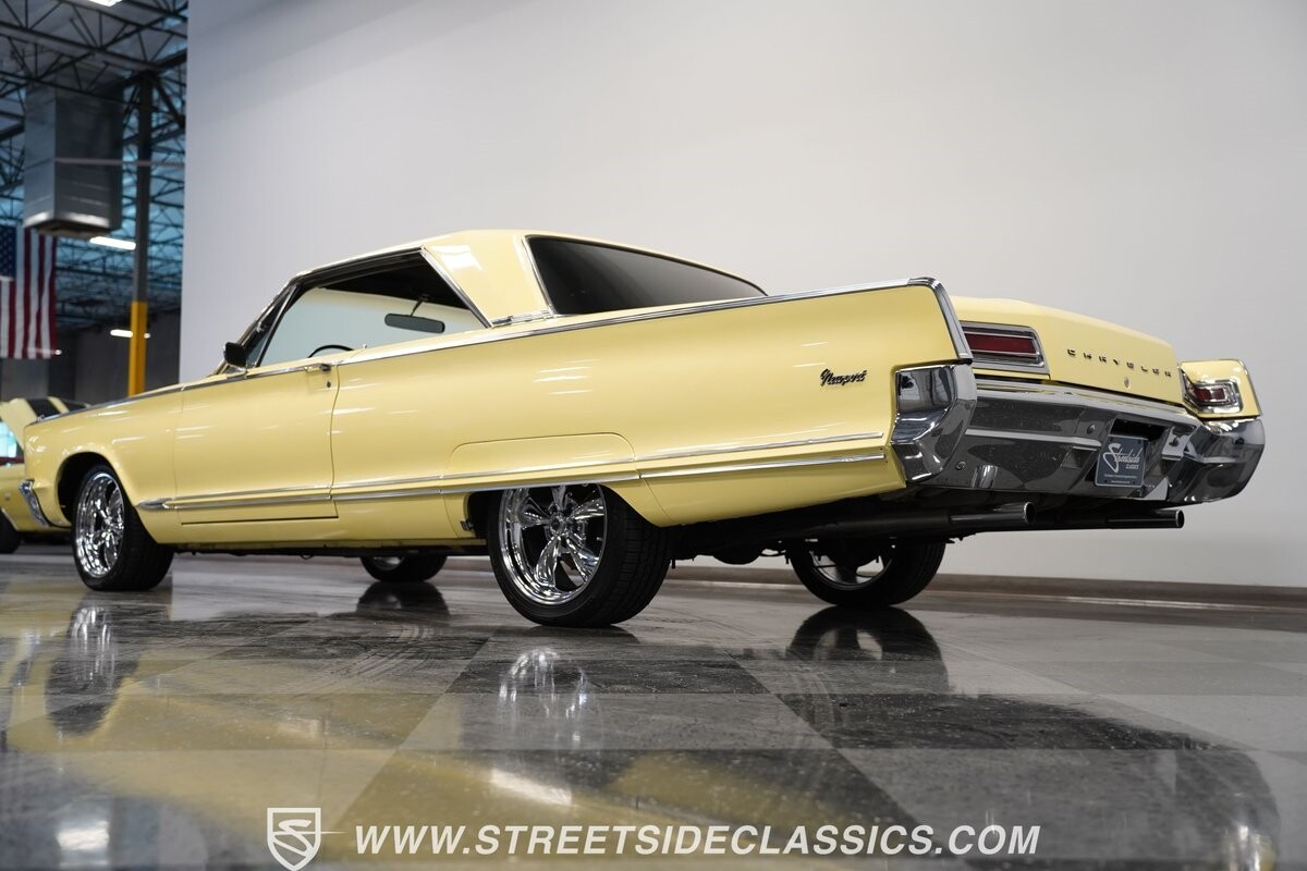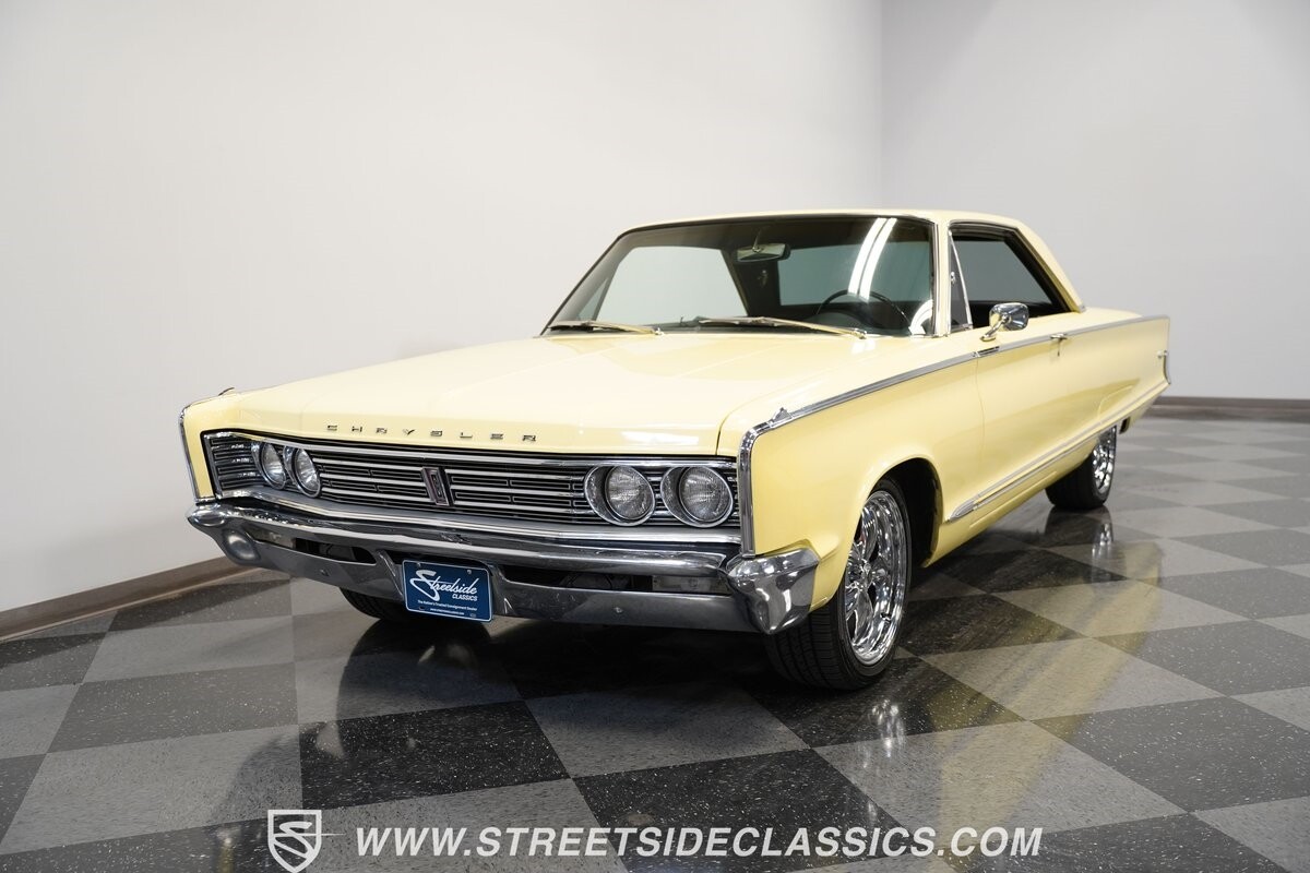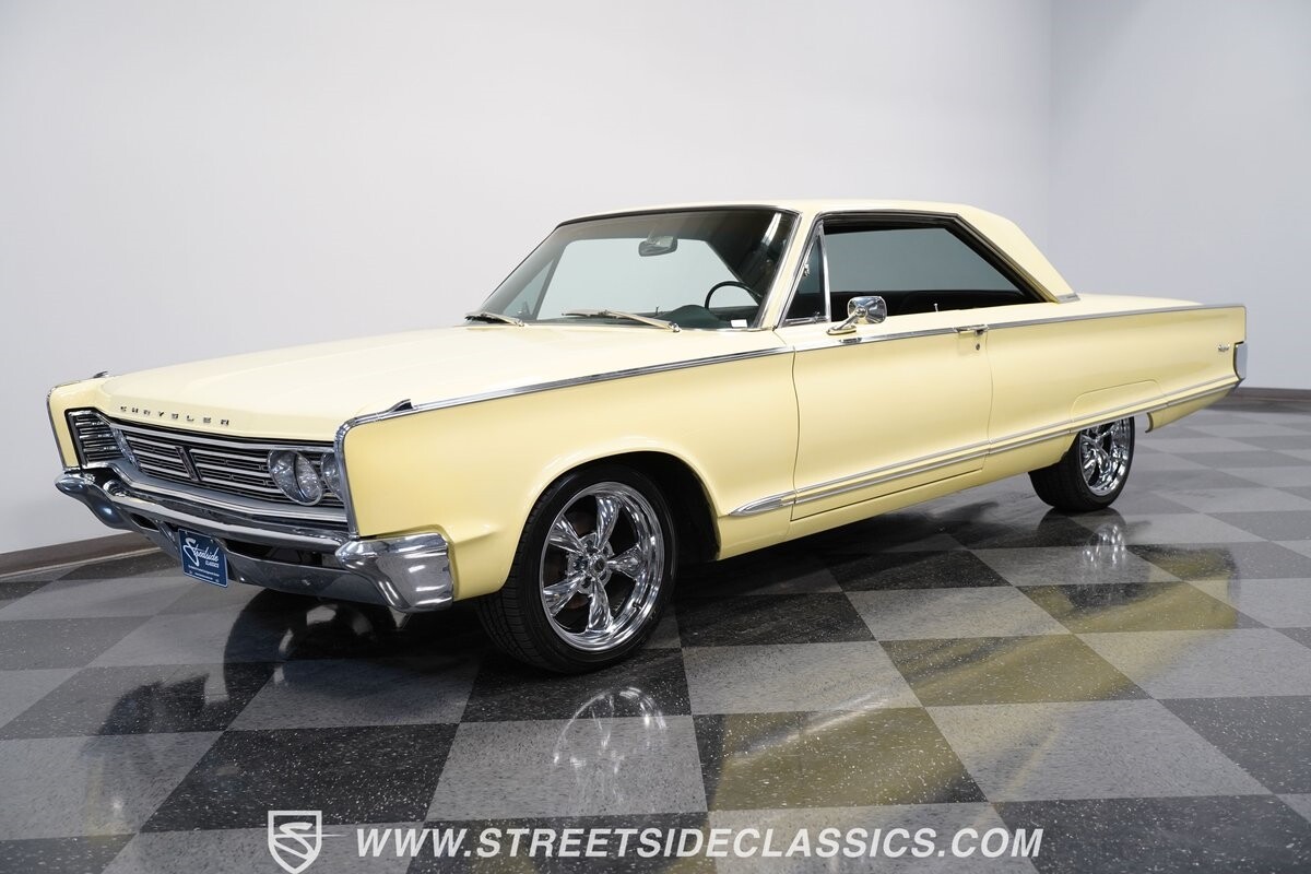This 1966 Chrysler Newport, clad in Daffodil Yellow, stands as a prime example of mid-century American automotive design. Its broad, commanding presence on the road is accentuated by 18-inch chrome American Racing wheels, wrapped in Falken Pro G5 235/45R18 tires. This vehicle is not only a nod to Chrysler's commitment to elegance and power but also a practical choice for anyone seeking a mix of style and reliability.