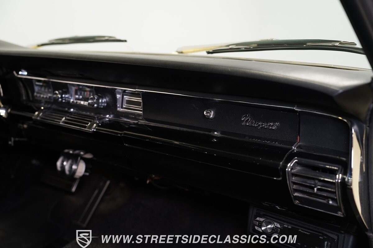 Inside, this Newport offers a spacious black vinyl interior that complements its exterior's bold hue. The bench seats provide a comfortable ride for both driver and passengers, while the original dashboard retains the classic charm of the 60s. Modern amenities, including air conditioning converted to 134, and an AM/FM CD changer with an auxiliary input, ensure that the ride is as enjoyable as it is stylish. The column shifter adds a touch of nostalgia, seamlessly integrated into the Newport's timeless design.