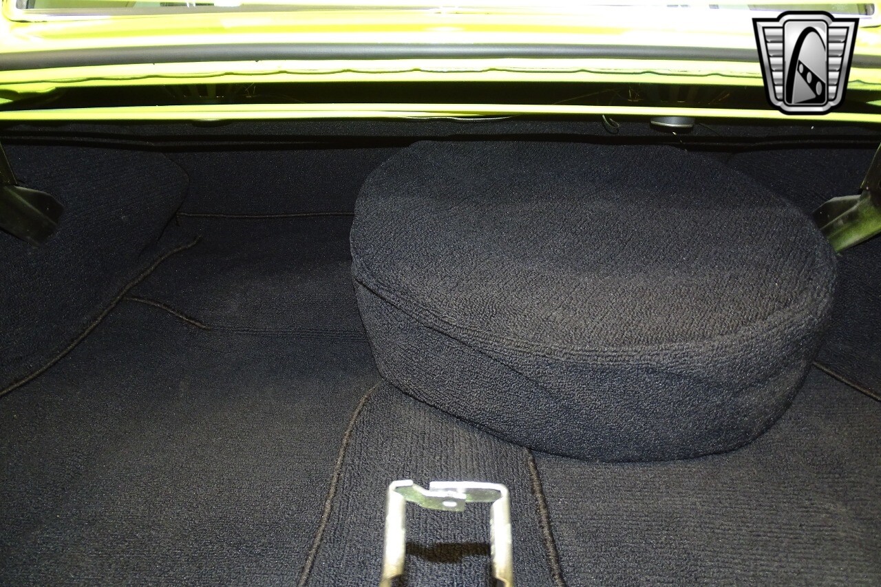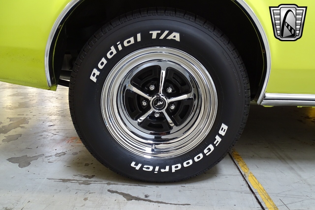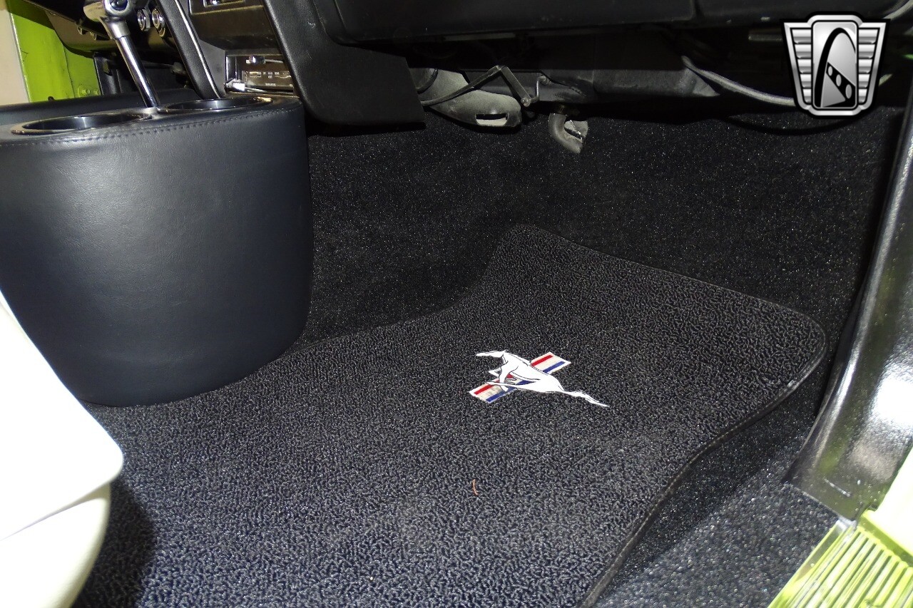 The Mustang's interior is as impressive as its exterior. The white vinyl interior is a perfect contrast to the bright lime exterior, creating a striking visual combination. The car also features an AM/FM radio, allowing you to enjoy your favorite tunes as you cruise down the road.