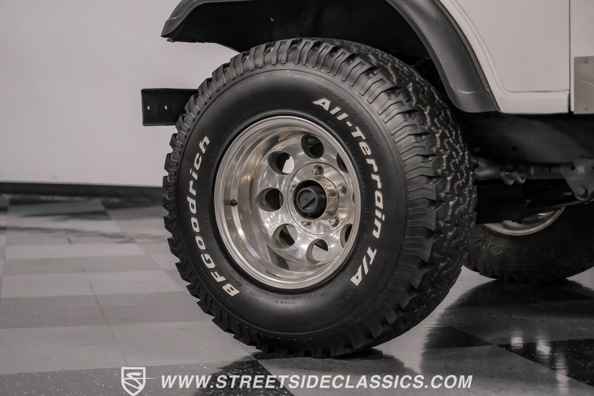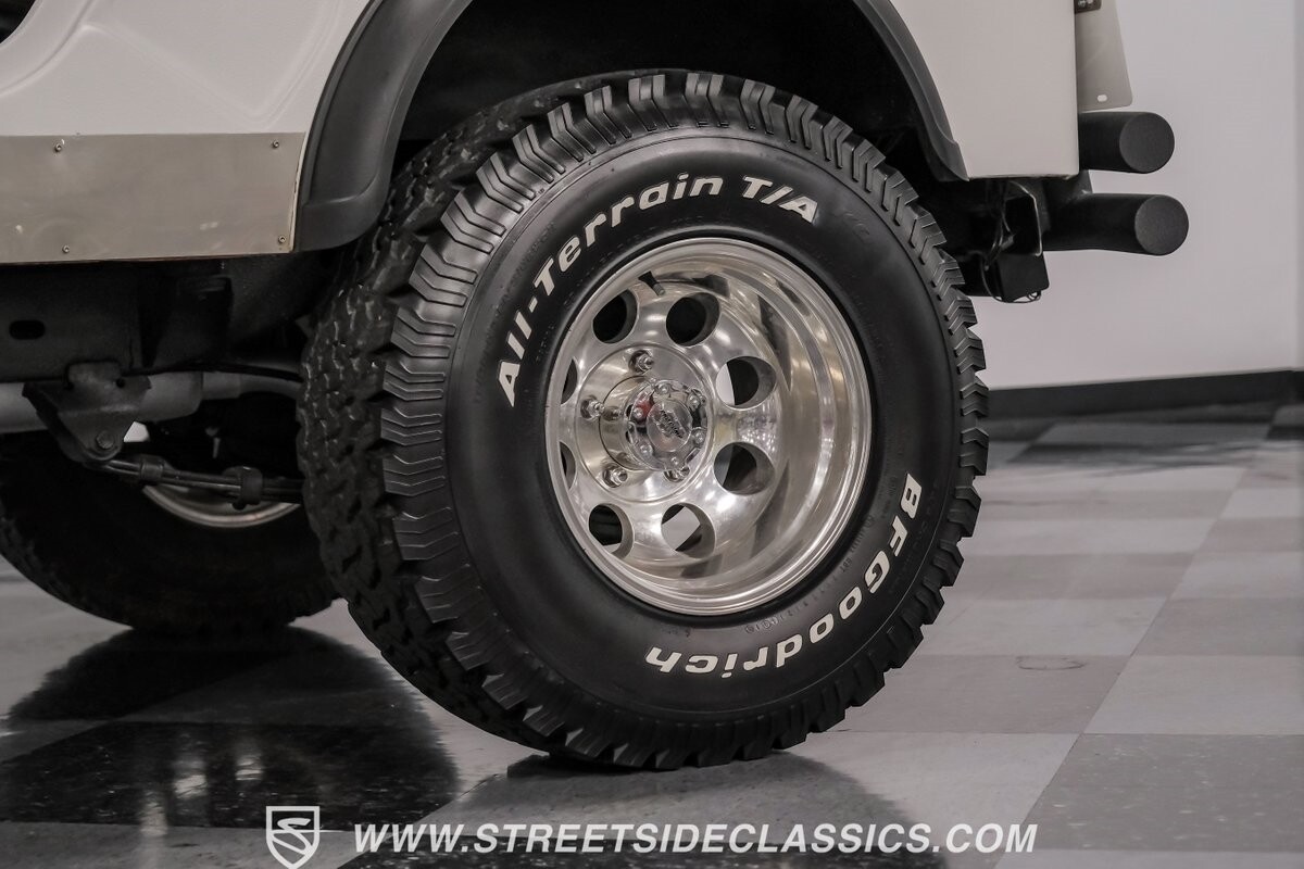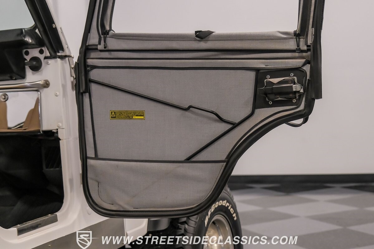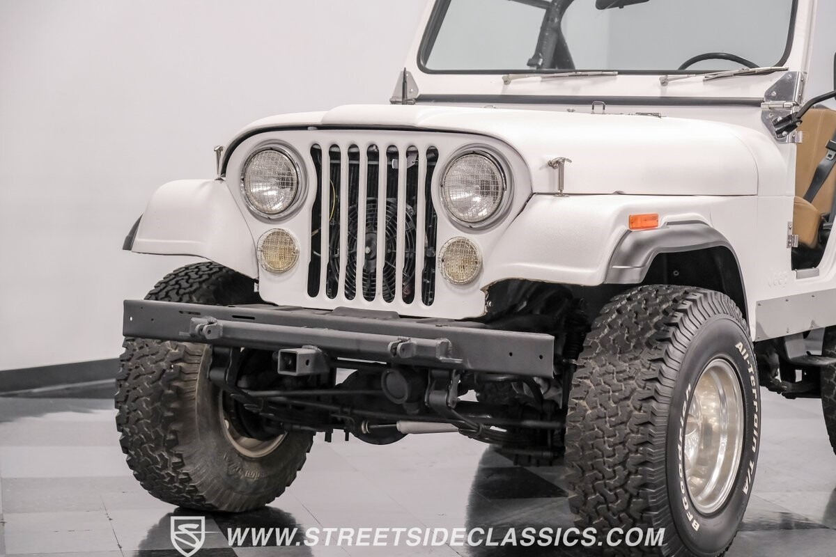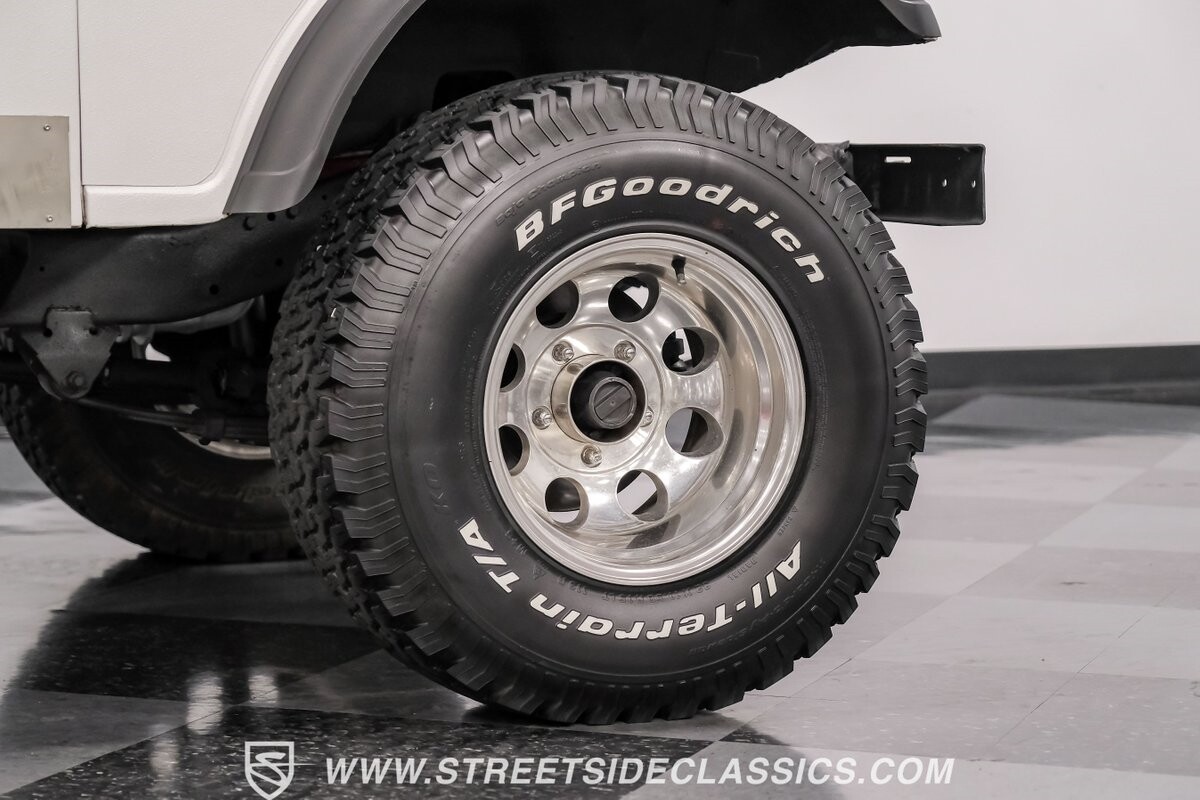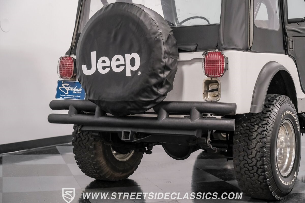 From a time when adventure was bold and the trails were calling, this 1981 Jeep CJ5 rumbles onto the scene with its rugged stance and no-nonsense attitude. Bathed in a White Rhino-Lined style paint for extra toughness, it sits proudly on 15" ProComp wheels wrapped in capable 32x11.50R15 BFG tires. A newer soft top promises shelter on changing days. The roll bar stands tall, ready for open-air explorations, while the aftermarket front and rear bumpers hint at its readiness to spend life conquering the unpaved, if that is where life takes you.