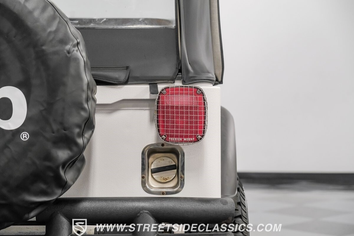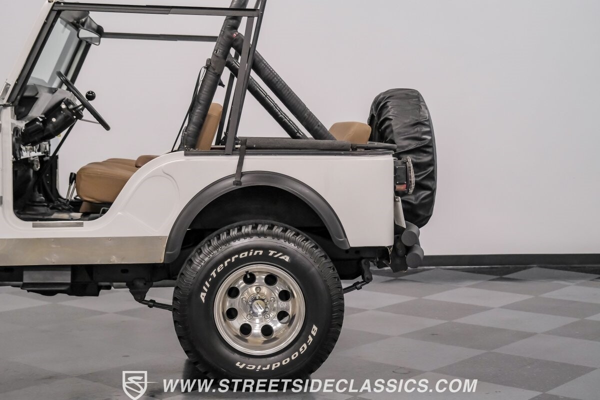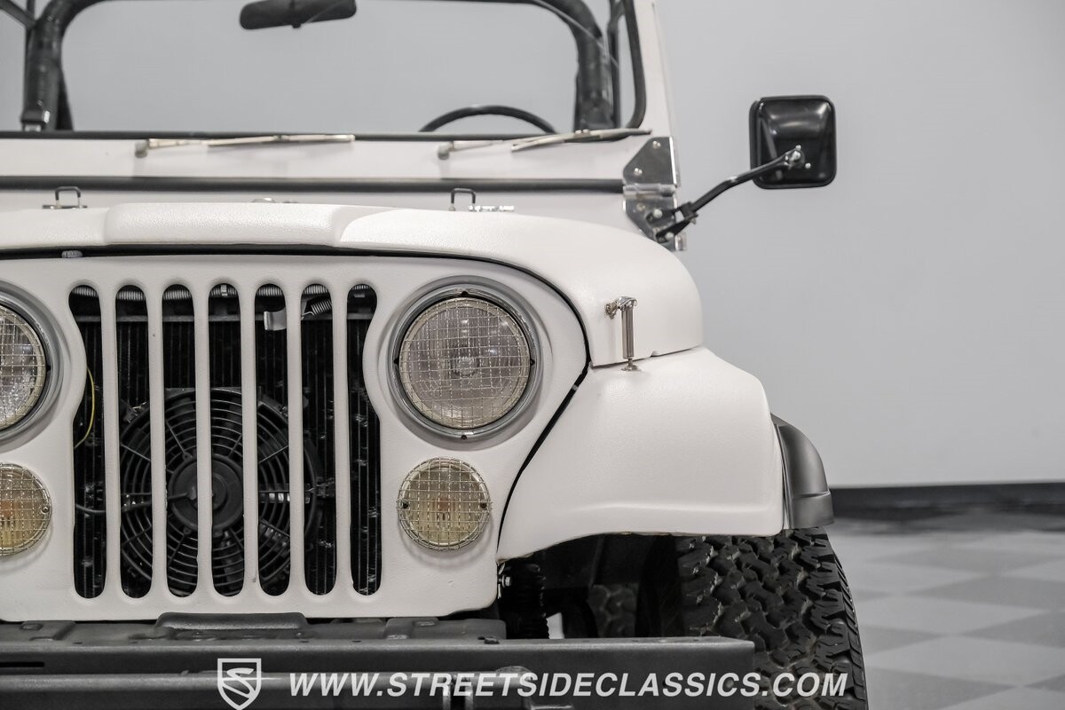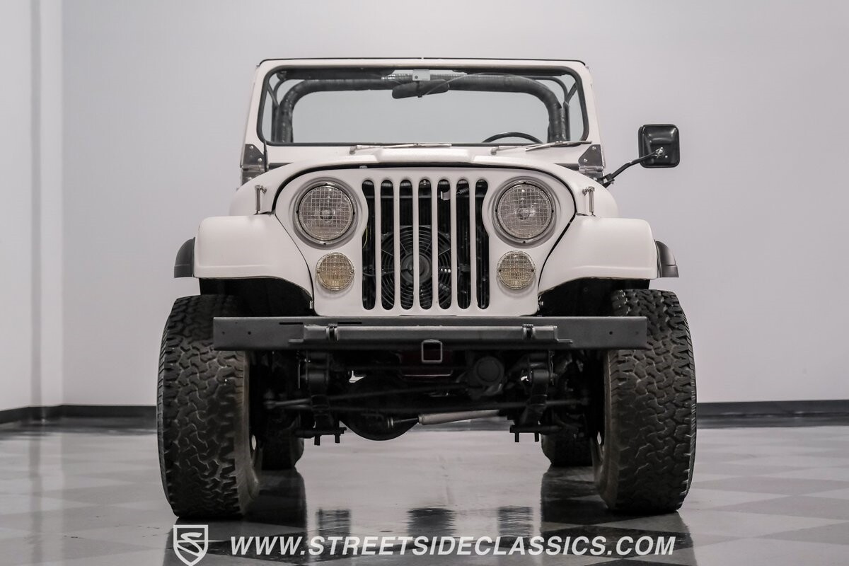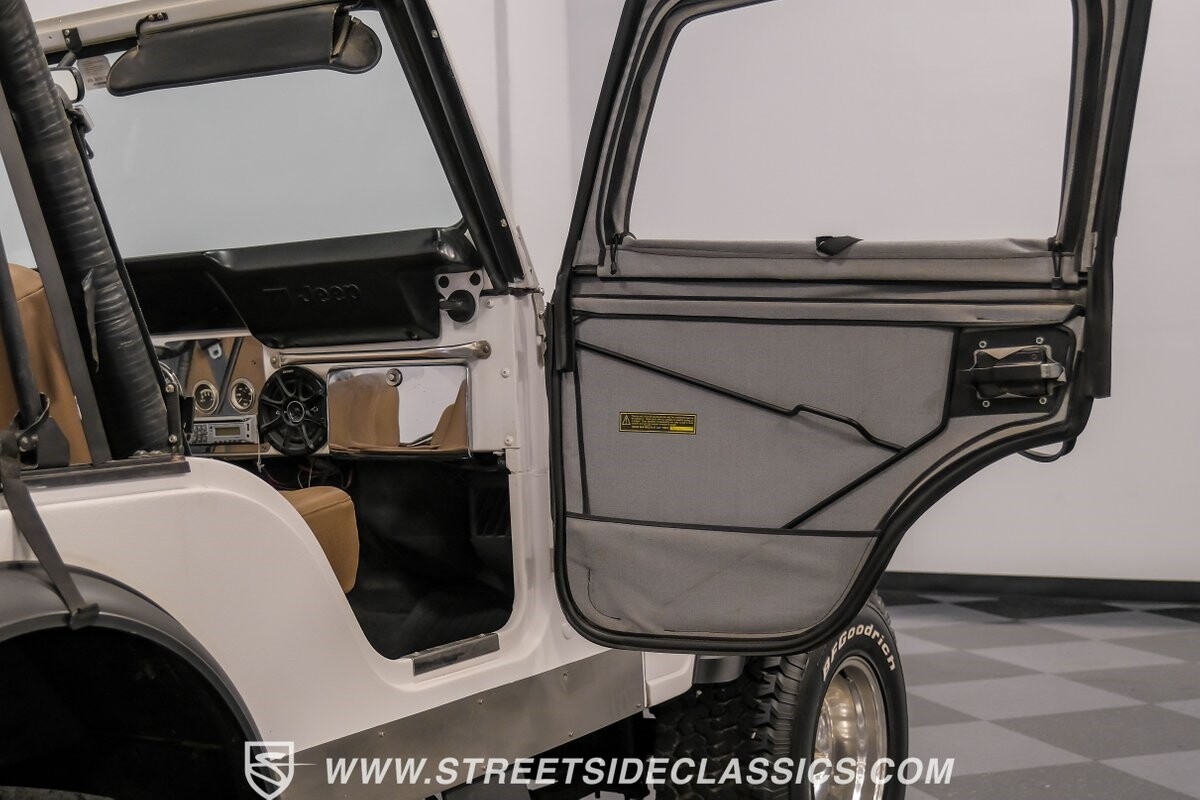From a time when adventure was bold and the trails were calling, this 1981 Jeep CJ5 rumbles onto the scene with its rugged stance and no-nonsense attitude. Bathed in a White Rhino-Lined style paint for extra toughness, it sits proudly on 15" ProComp wheels wrapped in capable 32x11.50R15 BFG tires. A newer soft top promises shelter on changing days. The roll bar stands tall, ready for open-air explorations, while the aftermarket front and rear bumpers hint at its readiness to spend life conquering the unpaved, if that is where life takes you.