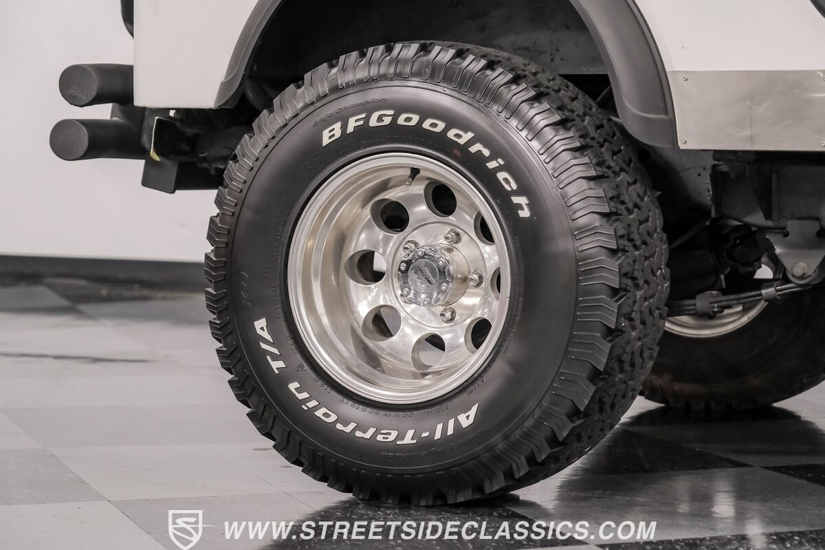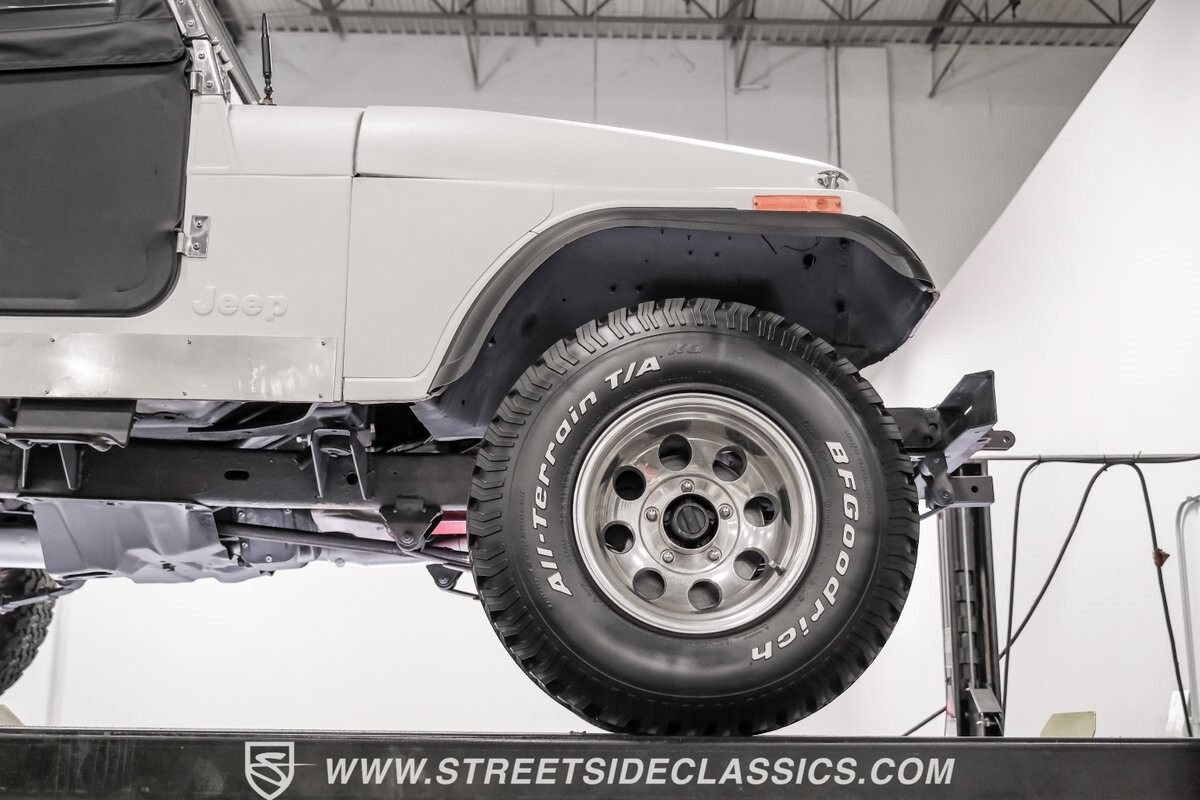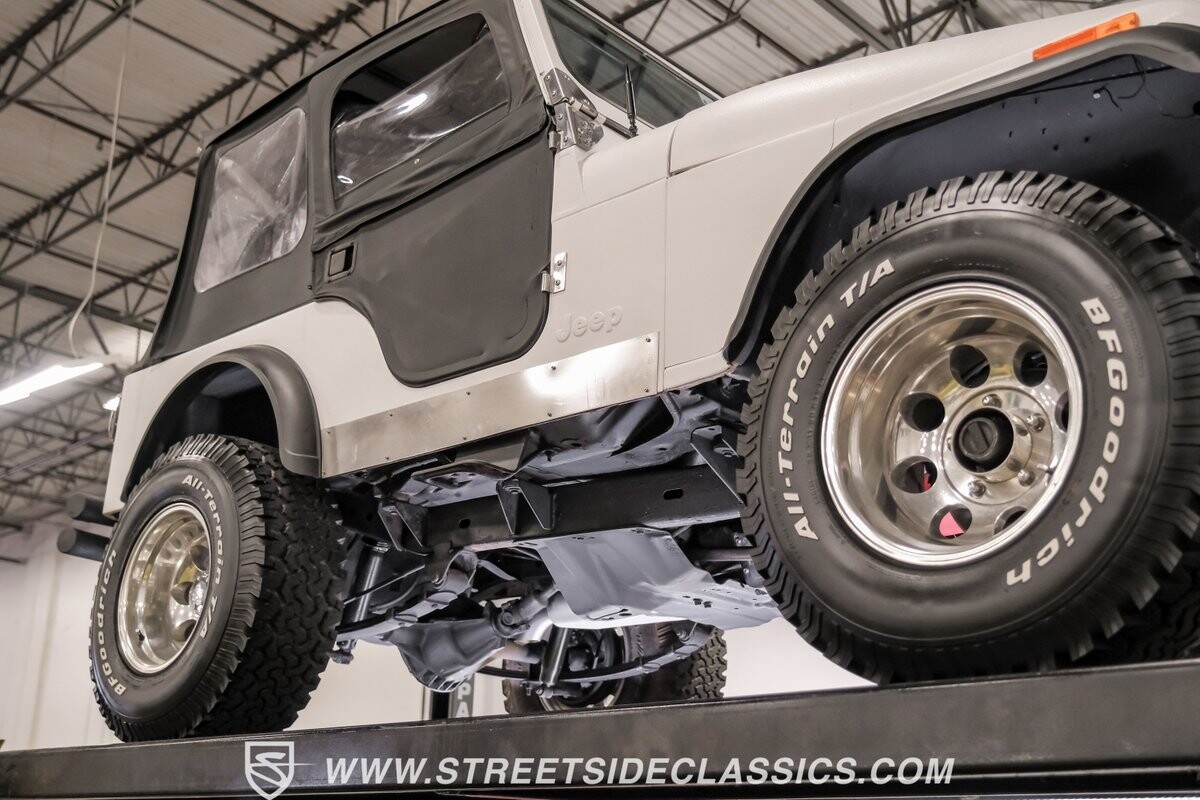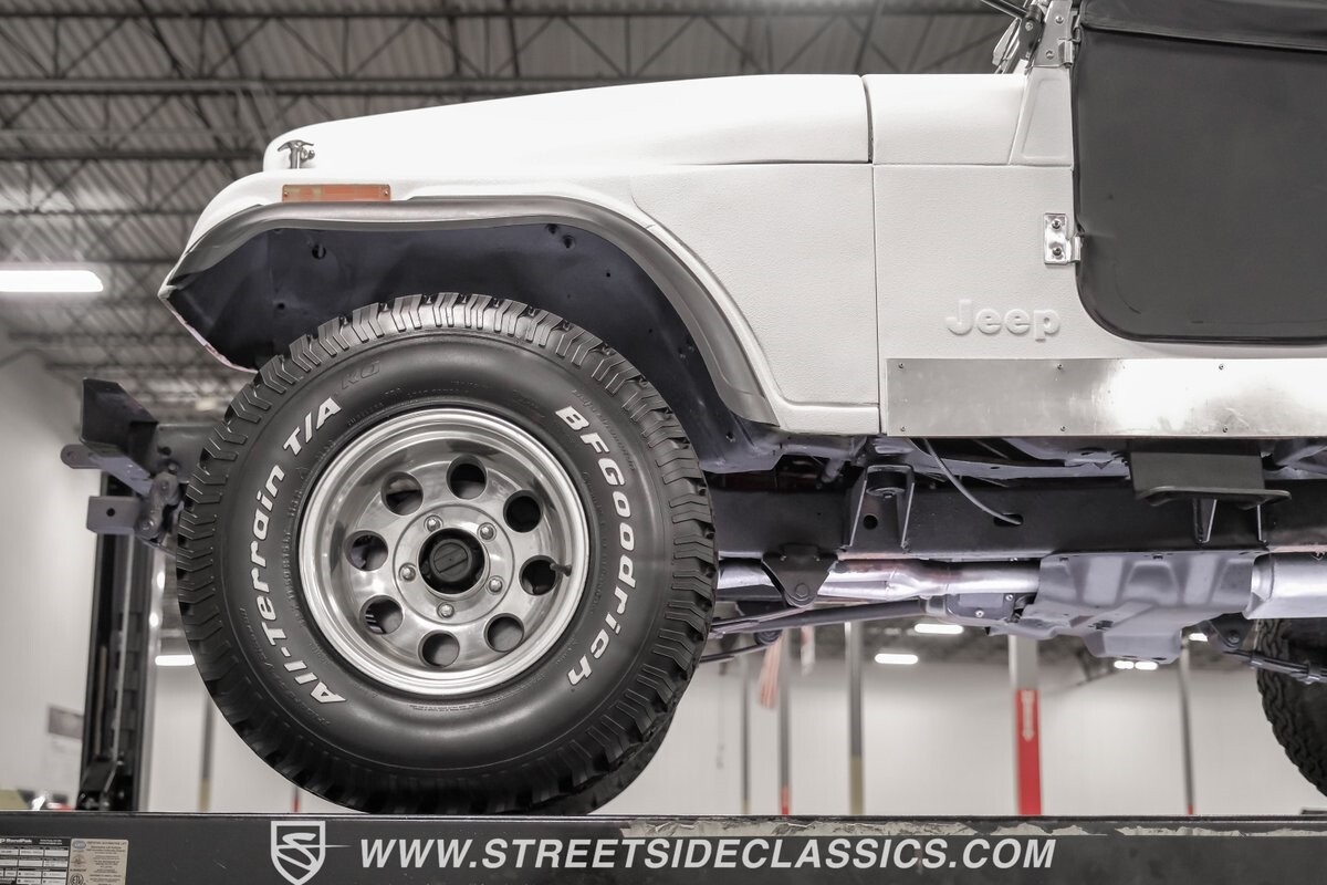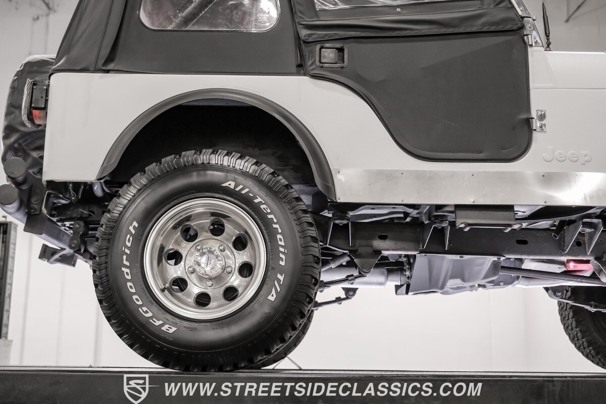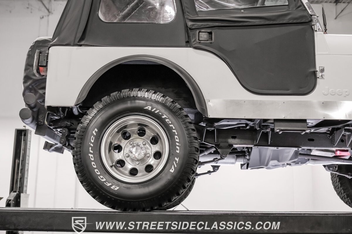From a time when adventure was bold and the trails were calling, this 1981 Jeep CJ5 rumbles onto the scene with its rugged stance and no-nonsense attitude. Bathed in a White Rhino-Lined style paint for extra toughness, it sits proudly on 15" ProComp wheels wrapped in capable 32x11.50R15 BFG tires. A newer soft top promises shelter on changing days. The roll bar stands tall, ready for open-air explorations, while the aftermarket front and rear bumpers hint at its readiness to spend life conquering the unpaved, if that is where life takes you.