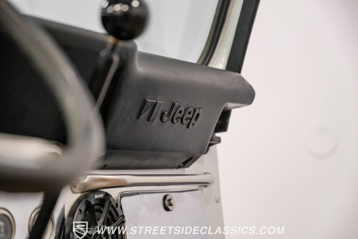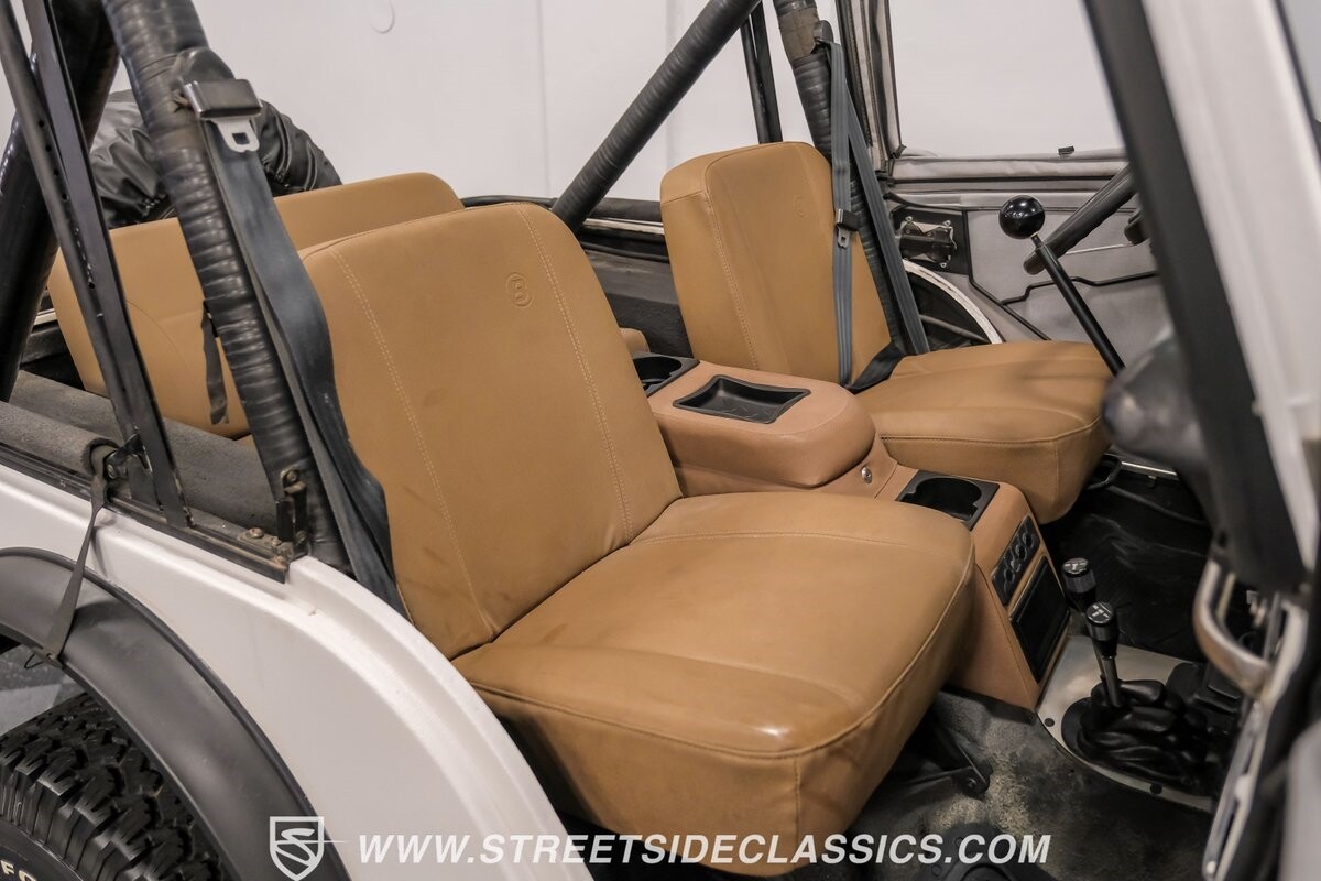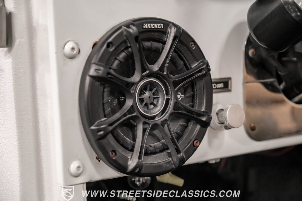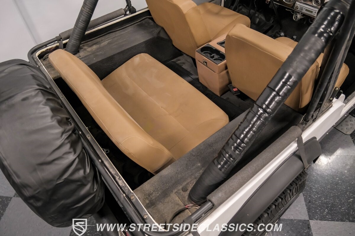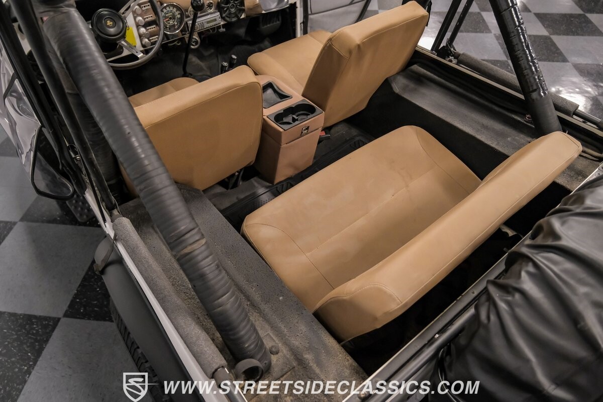 Inside, the Jeep has a tan interior with vinyl bucket seats that suggest comfort with a no-nonsense approach. The floor-mounted shifter and center console enhance the interior's functionality, making it evident that this vehicle is built for driving pleasure. An updated stereo with Kicker speakers integrated into the dash hints at modern touches discreetly woven into the classic fabric of this vehicle. The updated tilt column and seat belts ensure safety without compromising the Jeep's classic feel.