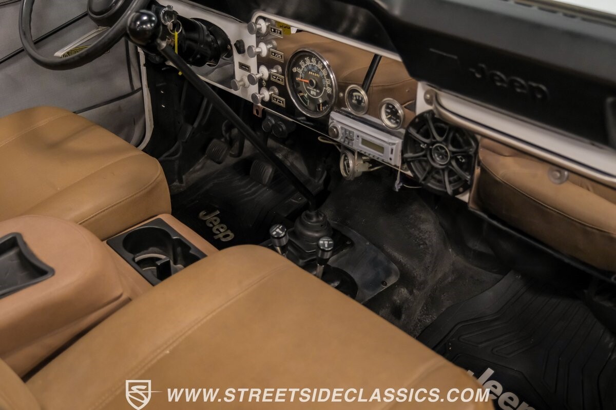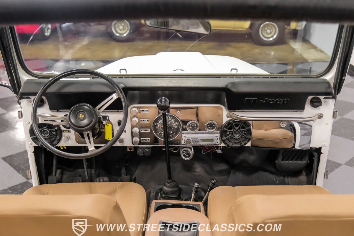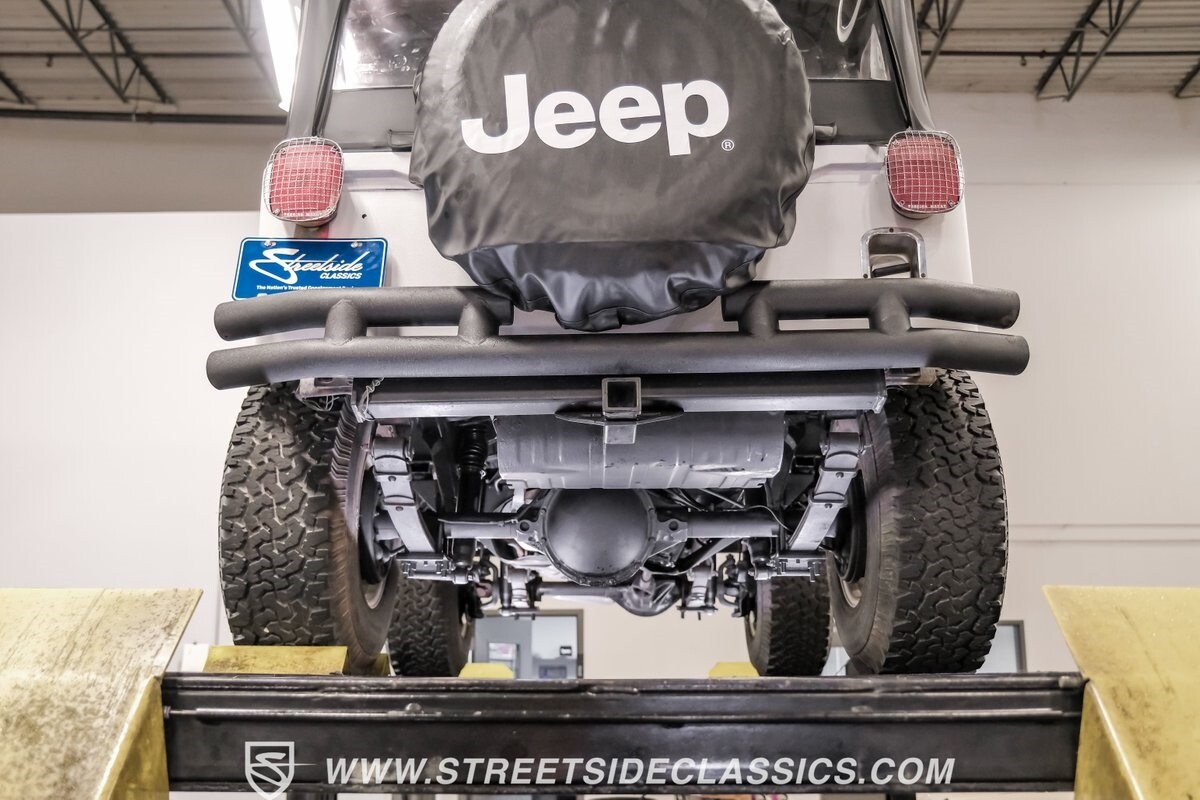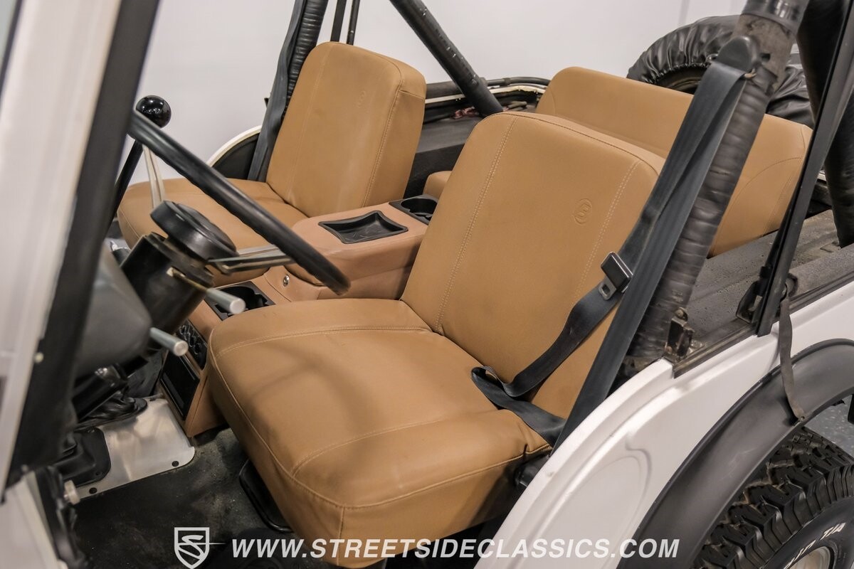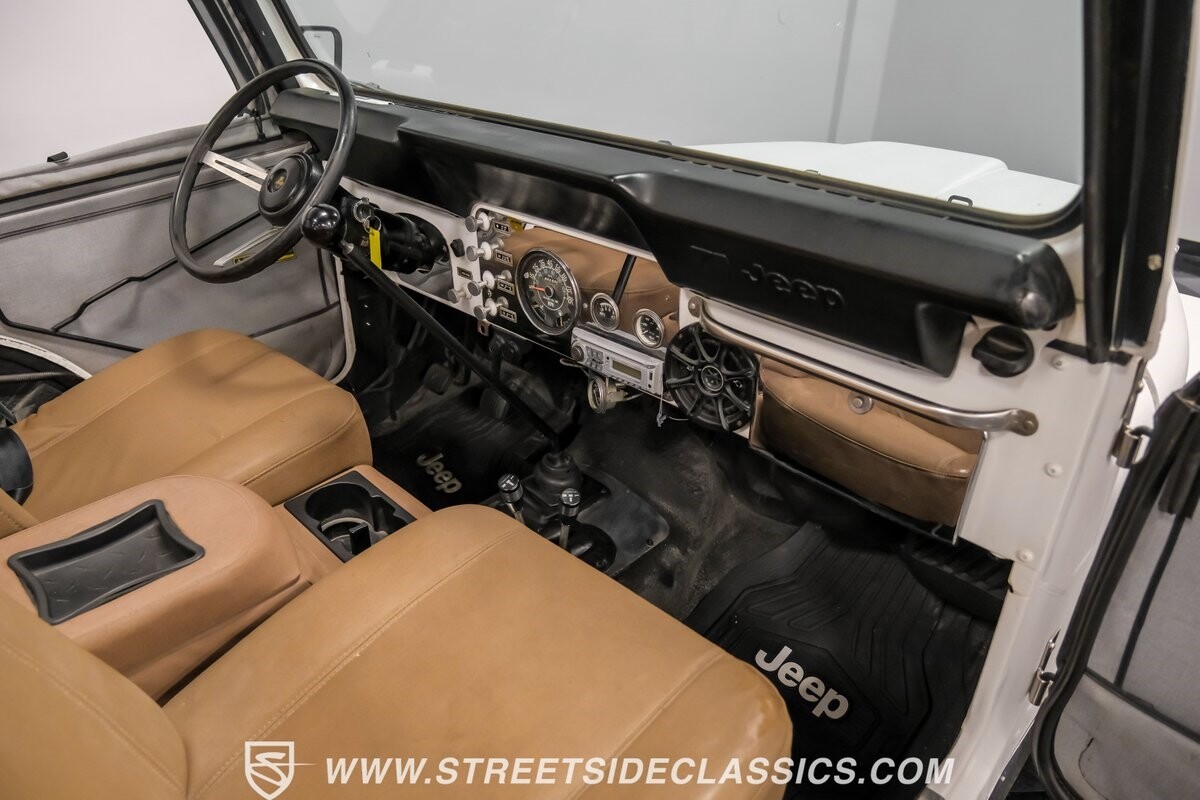 Inside, the Jeep has a tan interior with vinyl bucket seats that suggest comfort with a no-nonsense approach. The floor-mounted shifter and center console enhance the interior's functionality, making it evident that this vehicle is built for driving pleasure. An updated stereo with Kicker speakers integrated into the dash hints at modern touches discreetly woven into the classic fabric of this vehicle. The updated tilt column and seat belts ensure safety without compromising the Jeep's classic feel.