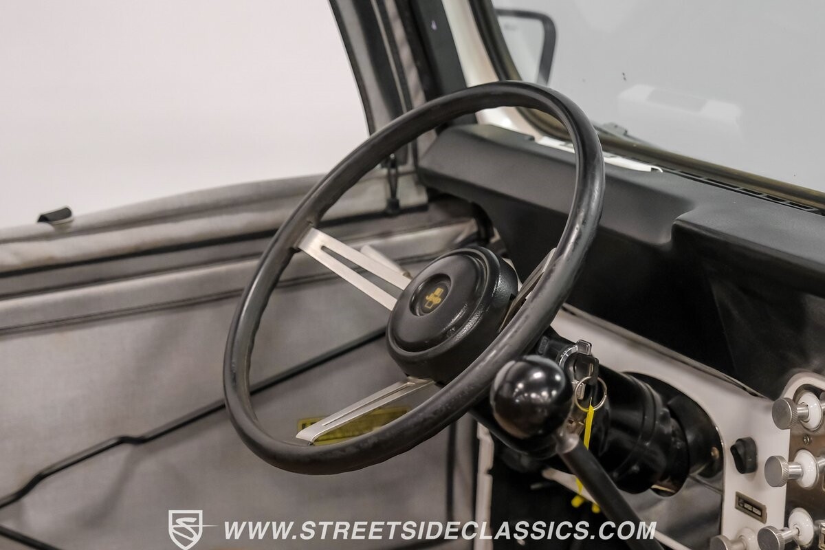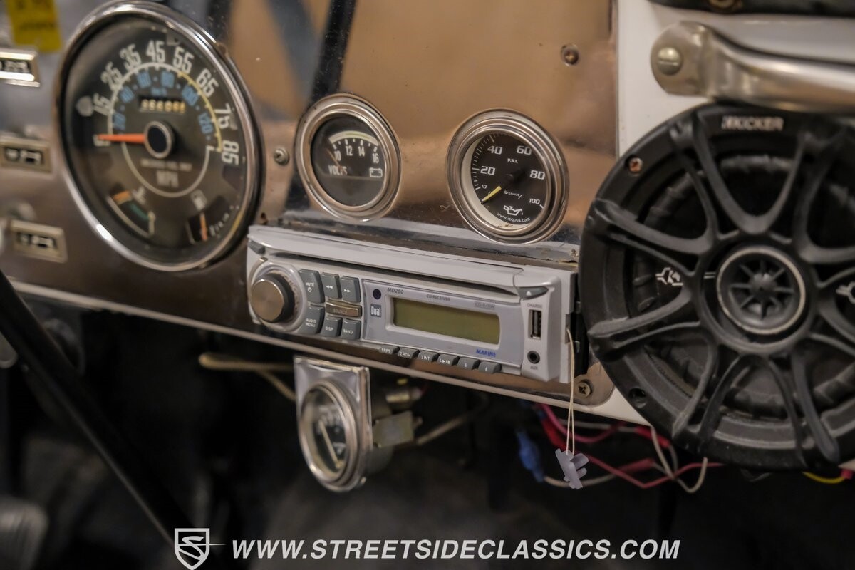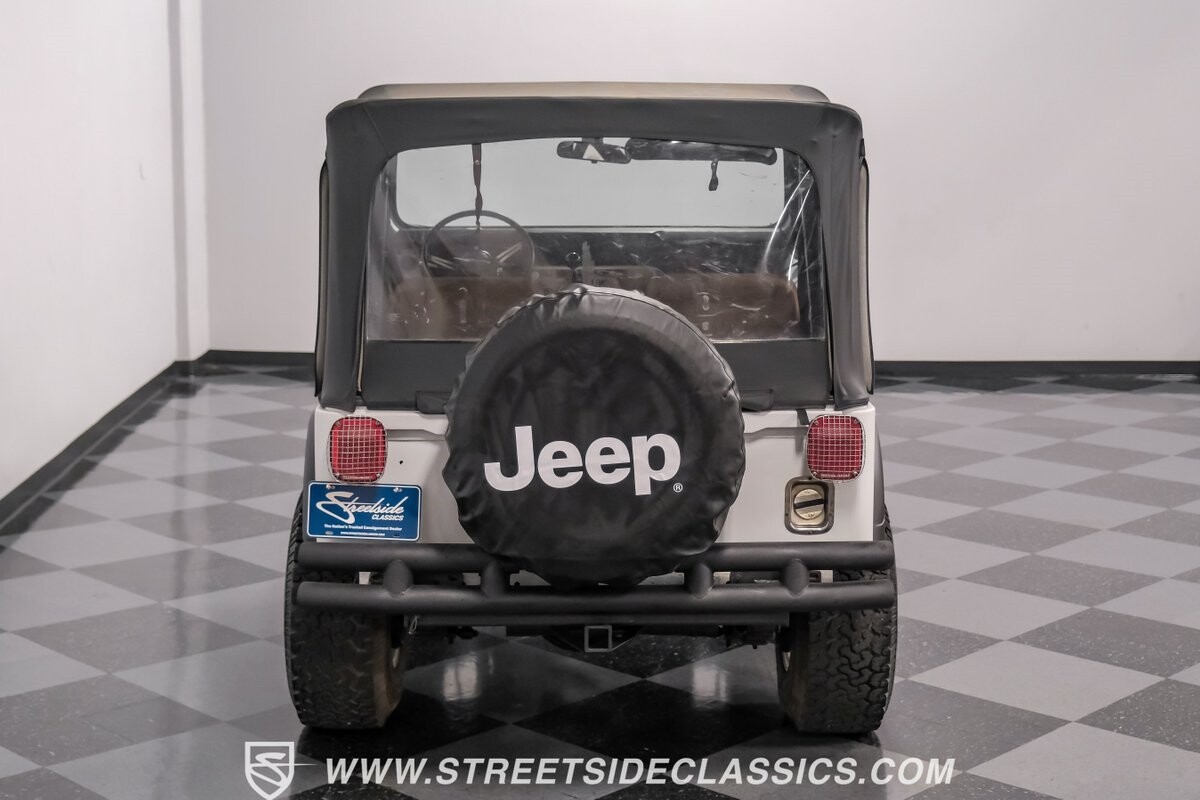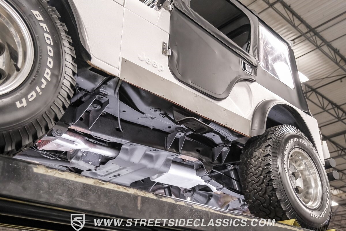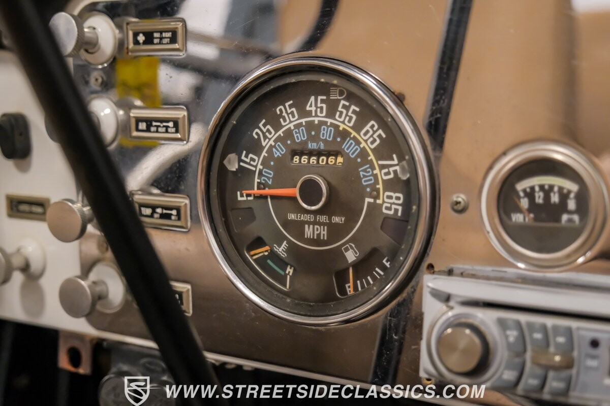 Inside, the Jeep has a tan interior with vinyl bucket seats that suggest comfort with a no-nonsense approach. The floor-mounted shifter and center console enhance the interior's functionality, making it evident that this vehicle is built for driving pleasure. An updated stereo with Kicker speakers integrated into the dash hints at modern touches discreetly woven into the classic fabric of this vehicle. The updated tilt column and seat belts ensure safety without compromising the Jeep's classic feel.