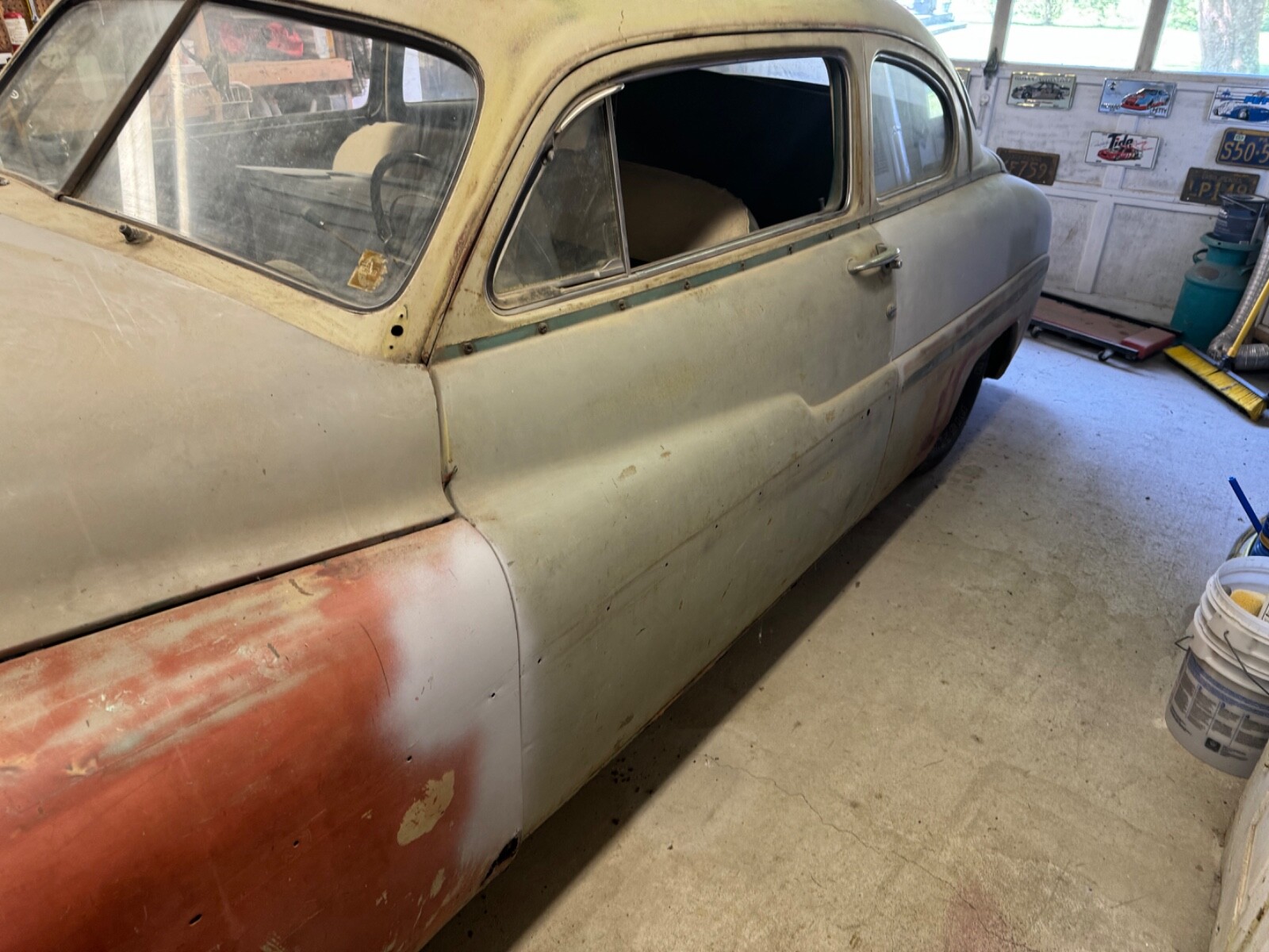 1950 mercury coupe hav most of orig trim as well as bumpers grill as well as orig 3 speed trans will need total restoration all glass is intact floors are solid have been stored inside since 1963 would make a great car to hot rod
