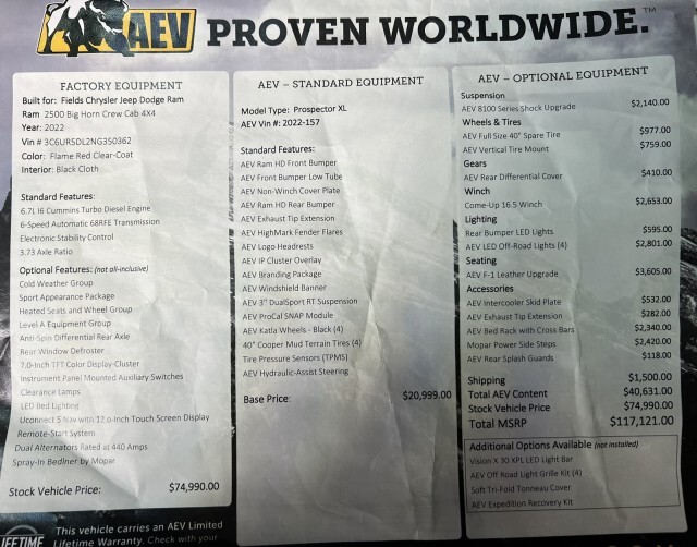 HIGHLIGHTED FEATURES AEV Prospector XL Options - $22,875 IN AEV OPTIONS ALONE AEV F-1 Leather Interior Upgrade $3,605 AEV 7000 Series Light Kit - 4 $2,801 AEV Bed Rack - 6'4 Bed $2,340 MOPAR Power Side Steps $2,420 COMEUP 16.5rs Synthetic Winch $2,653 AEV/Bilstein 8100 Series Shock Upgrade $2,140 AEV Full-Size Spare Tire with Vertical Mount $1,736 AEV Brush Guard $1,865 AEV Full Size 40 Spare Tires $977 Baja Designs Rear Bumper LED Lights $595 Rear Differential Cover $409 Diesel Exhaust Tip $281.50 AEV Branding Package $200 AEV Rear Splash Guards $117 Standard Prospector Features - $20K IN VALUE AEV 17x10 Katla Wheels 40 Tires AEV Ram HD Front Bumper AEV Front Bumper Low Tube AEV Diesel Intercooler Shroud Kit AEV HighMark Fender Flares AEV Hydraulic-Assist Steering Upgrade Tire Pressure Monitoring System (TPMS) Sensors AEV HD Ram Rear Bumper AEV Branding Package AEV IP Cluster AEV Logo Headrests ADDITIONAL FEATURES 6.7L I6 Cummins Turbo Diesel Engine $9,595 Level A Equipment Group $2,115 2ndRow InFloor Storage Bins 8Way Power Adjustable Driver Seat Front Fog Lamps SteeringWheelMounted Audio Controls Uconnect 5 Nav with 12.0Inch Touch Screen Display $1,995 AntiSpin Differential Rear Axle $495 Heated Seats and Wheel Group $445 SprayIn Bedliner by Mopar $600 9 Alpine Speakers with Subwoofer $595 Dual Alternators Rated at 440 Amps $395 RemoteStart System $295 Rear Window Defroster $195 LED Bed Lighting $165 Instrument Panel Mounted Auxiliary Switches $145 Clearance Lamps $95