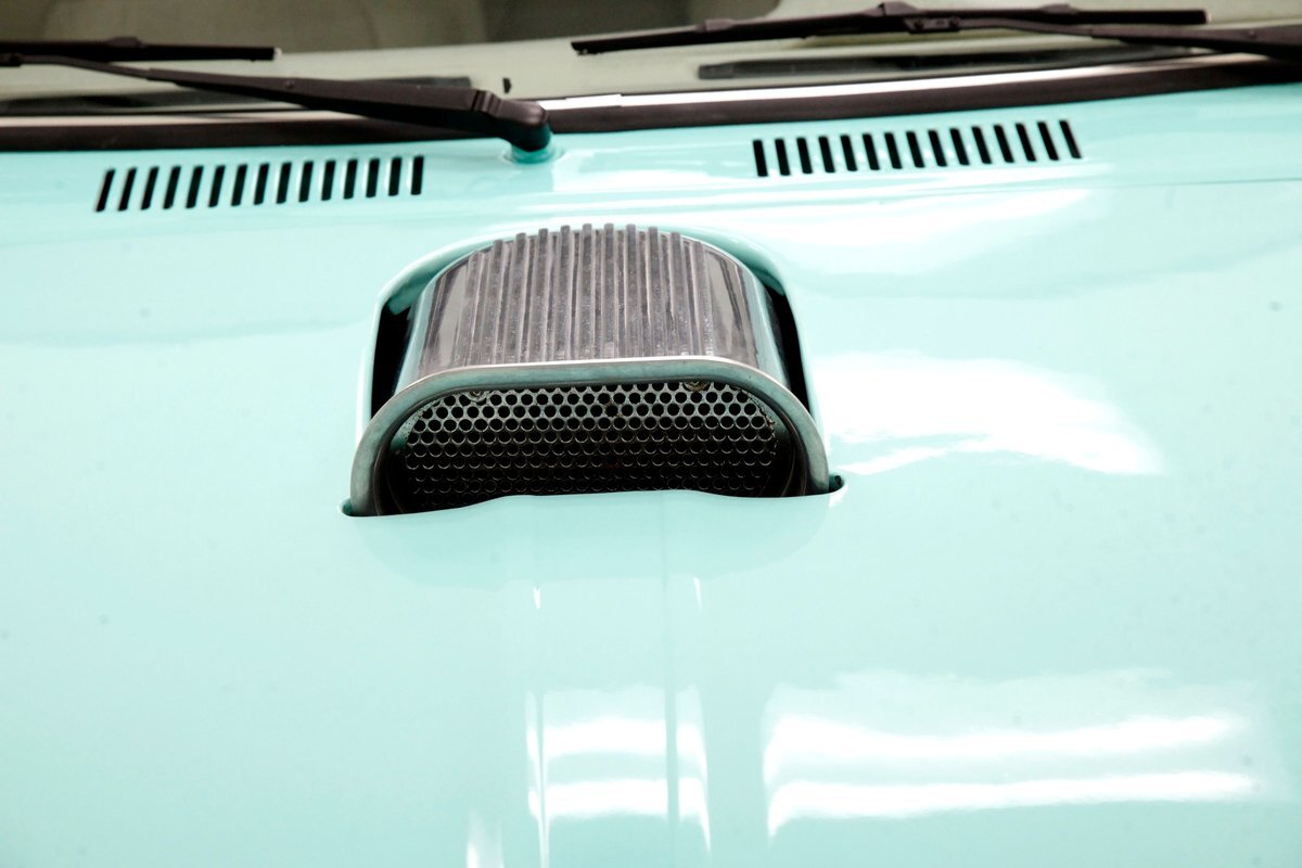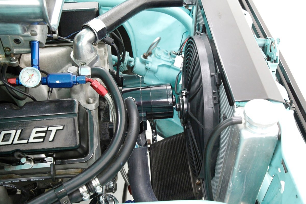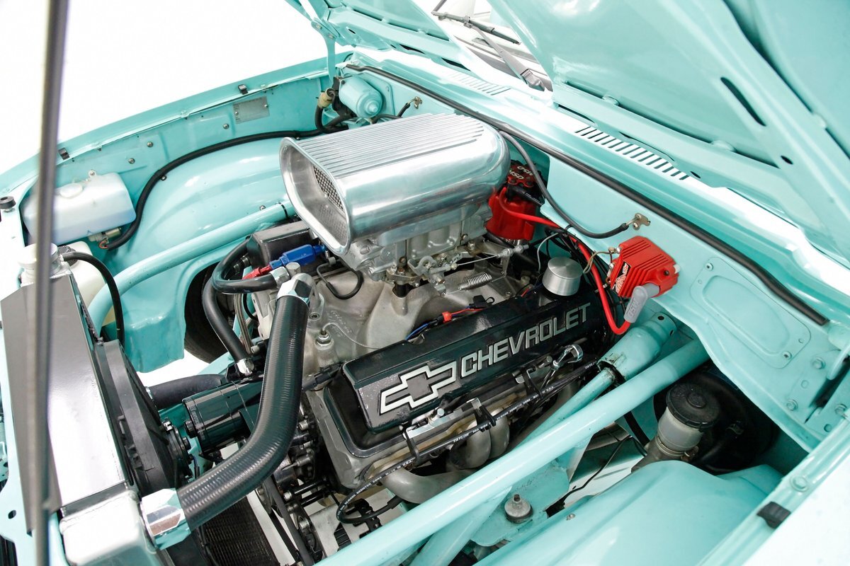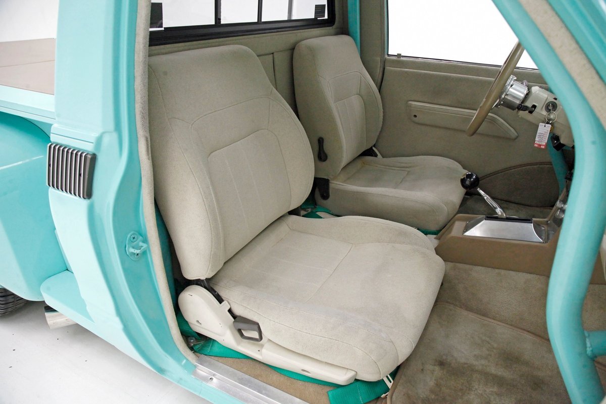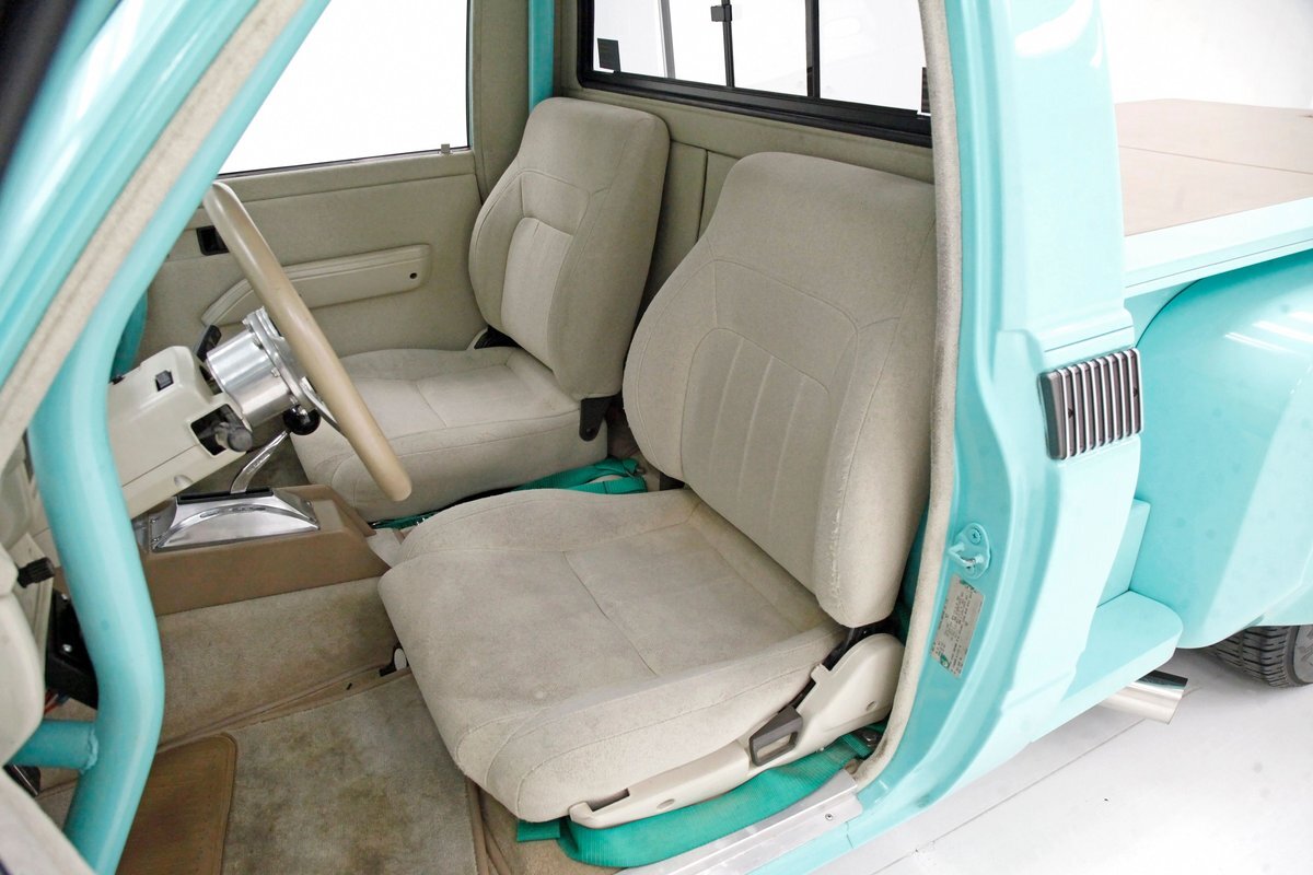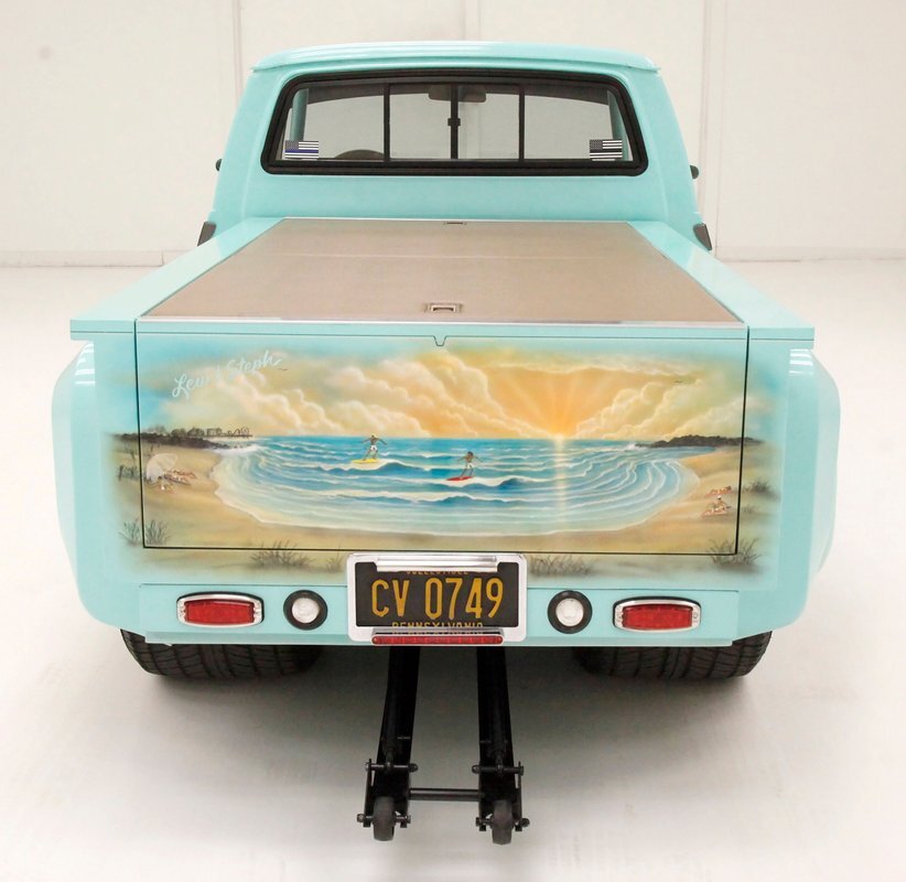 Looking at the truck from the front it appears at first as somewhat unassuming with its seafoam green paint and stock front grille. A hint of menacing is noted peeking out from the hood and as we move back to the cab the truck is still pretty much stock in appearance. This is where it all ends though as just aft of the doors is the beginnings of where a new S&W frame was put on to support the bed. The bed has been fabricated and this abuts large tubbed rear fenders flanking the bed on either side. Within these tubs are rear 15-inch Weld DragLite polished wheels and these are wrapped by massive 31x18.5R15 LTS Hoosier rubber. All the steel is straight as an arrow as well as being rust free and we see a custom plywood covered in leather for the bed topper in a taupe color which is a nice contrast to the seafoam. Underneath this leather covering we note a carpeted bed mostly taken up by the wheel well tubs. The rear tailgate has a custom airbrushed beach scene from Ocean City, Maryland and the back bumper has been shaved with just a straight roll pan with inserted tail lighting. Underneath, some wheelie bars are protruding out the back. A 3 inch stainless exhaust system is on and pipes are showing just before the wheel wells and are capable of making some serious noise.