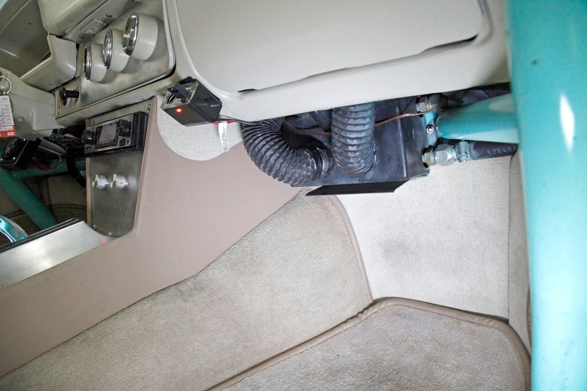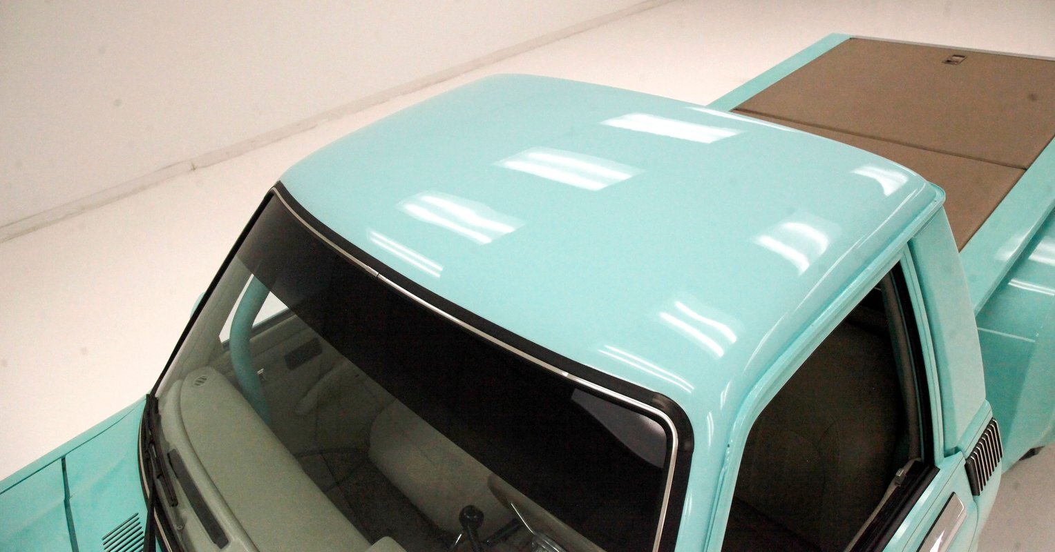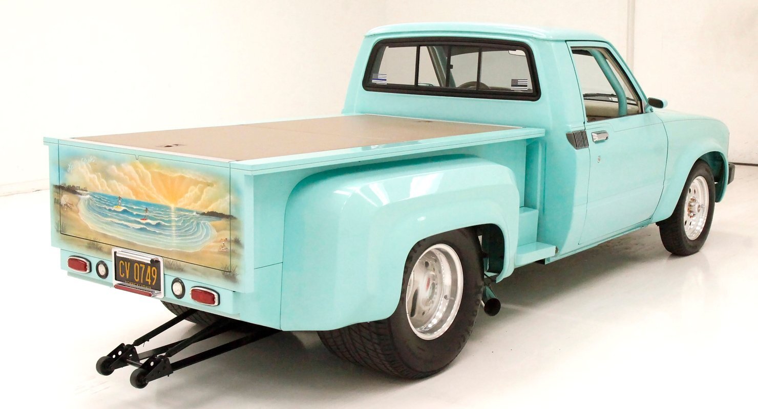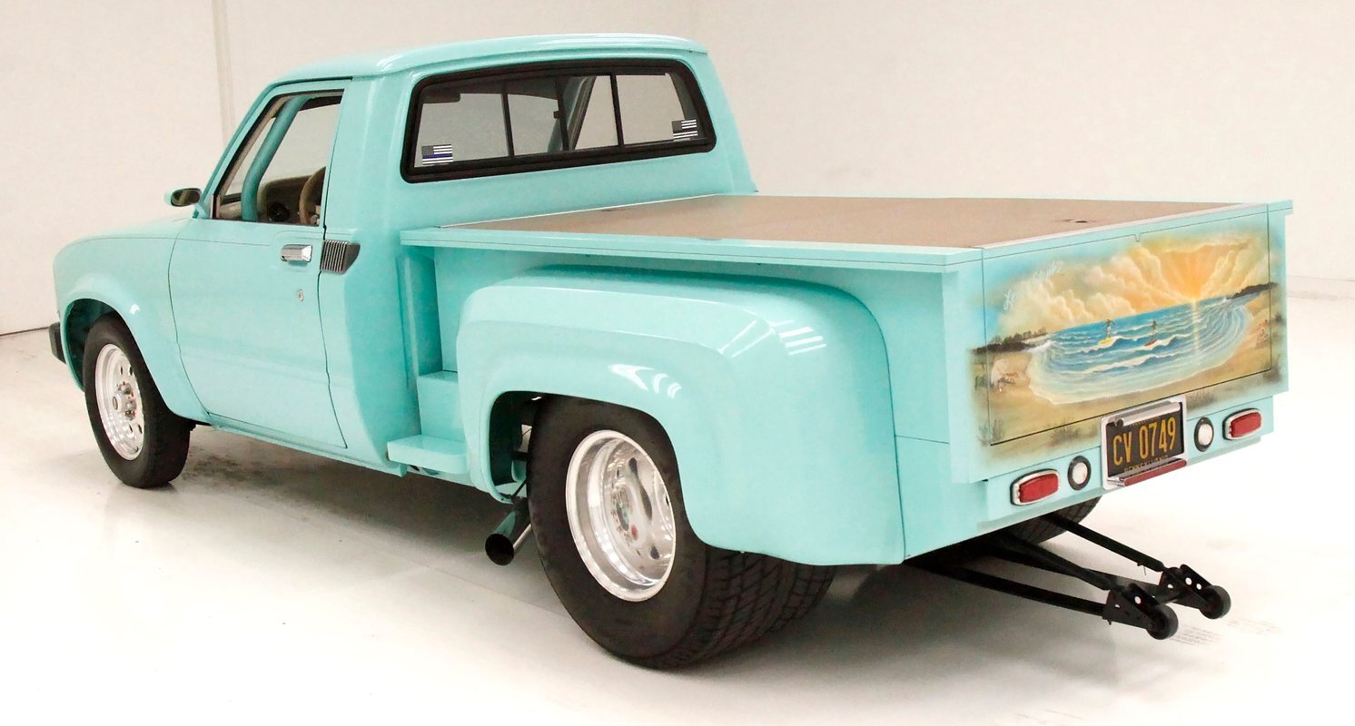 Looking at the truck from the front it appears at first as somewhat unassuming with its seafoam green paint and stock front grille. A hint of menacing is noted peeking out from the hood and as we move back to the cab the truck is still pretty much stock in appearance. This is where it all ends though as just aft of the doors is the beginnings of where a new S&W frame was put on to support the bed. The bed has been fabricated and this abuts large tubbed rear fenders flanking the bed on either side. Within these tubs are rear 15-inch Weld DragLite polished wheels and these are wrapped by massive 31x18.5R15 LTS Hoosier rubber. All the steel is straight as an arrow as well as being rust free and we see a custom plywood covered in leather for the bed topper in a taupe color which is a nice contrast to the seafoam. Underneath this leather covering we note a carpeted bed mostly taken up by the wheel well tubs. The rear tailgate has a custom airbrushed beach scene from Ocean City, Maryland and the back bumper has been shaved with just a straight roll pan with inserted tail lighting. Underneath, some wheelie bars are protruding out the back. A 3 inch stainless exhaust system is on and pipes are showing just before the wheel wells and are capable of making some serious noise.