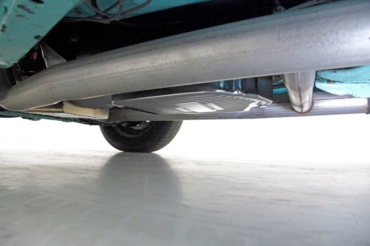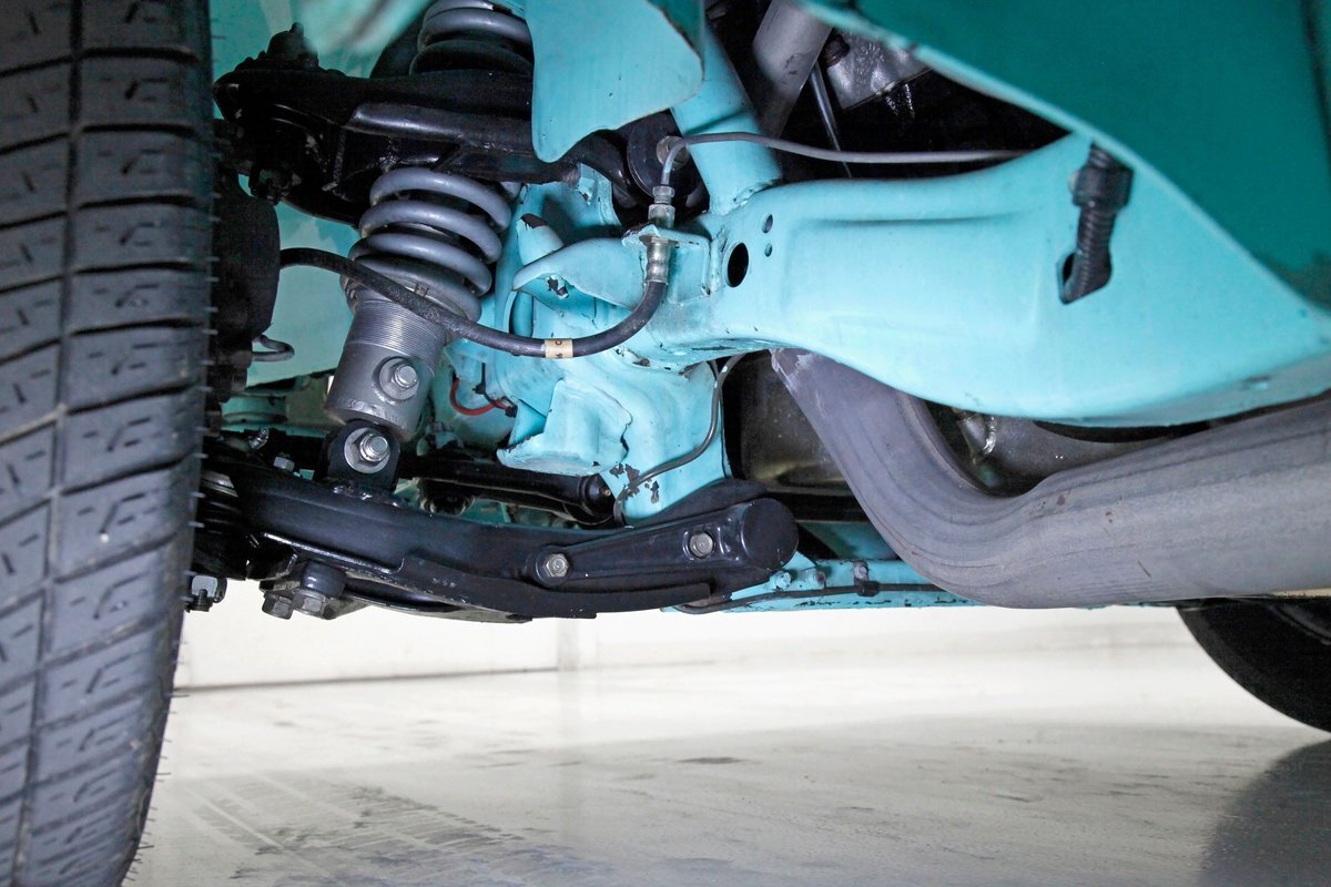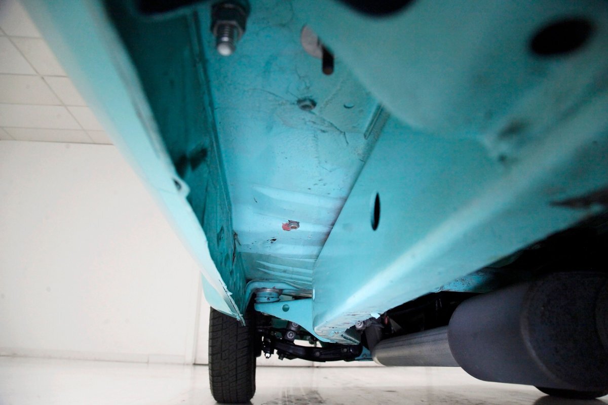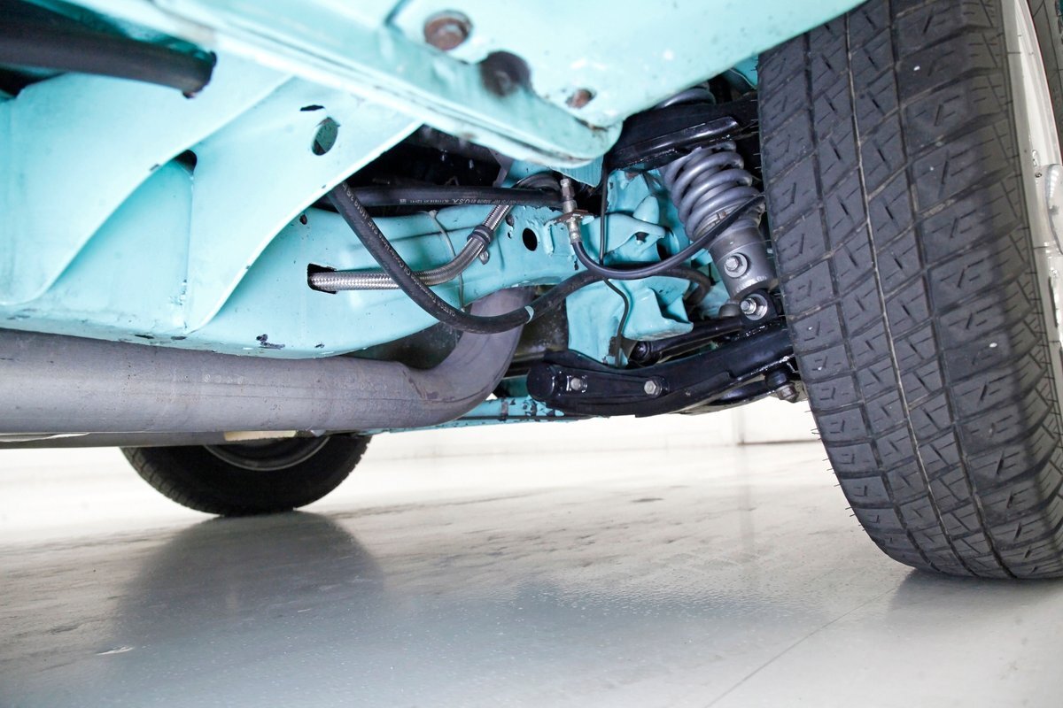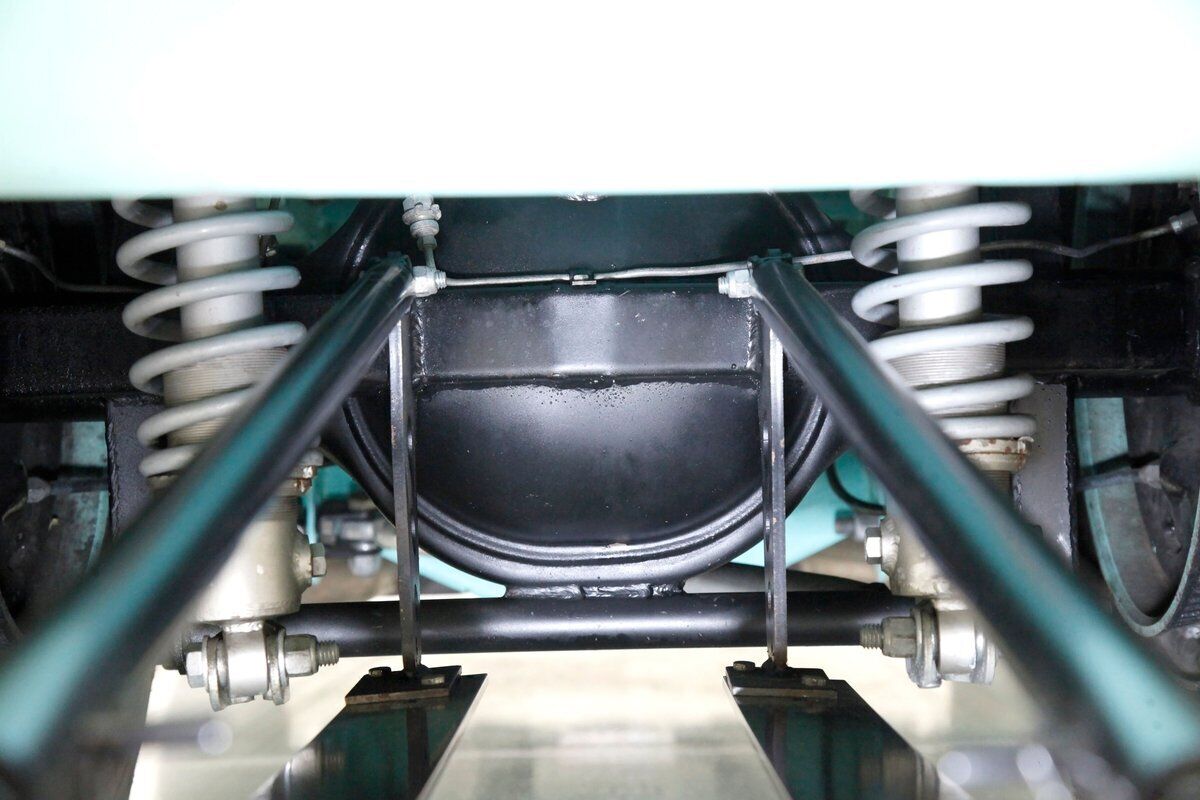 Very nice seafoam green is painted on most surfaces on the floors of the truck . All is very clean under here. For the suspension, it's weighing in with front independent coil overs and for the rear, ladder bars with coil overs. Power disc braking is in front and power drums for the back.