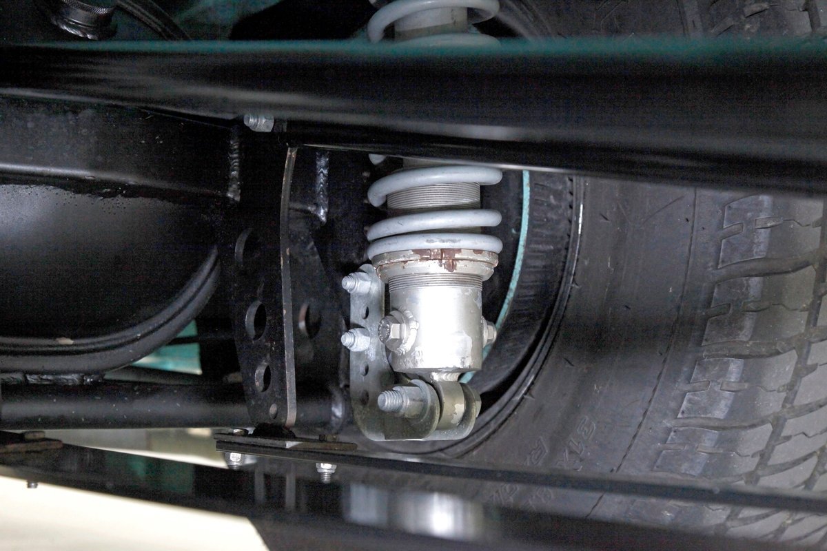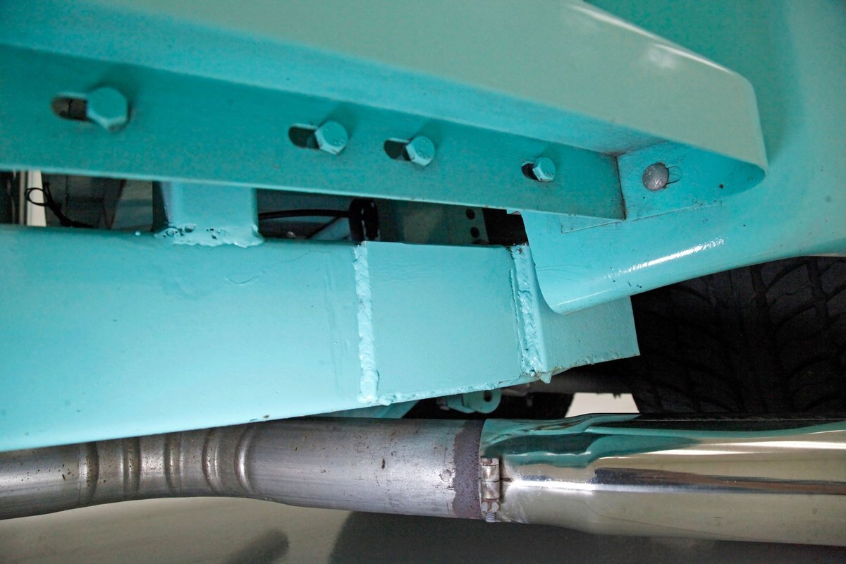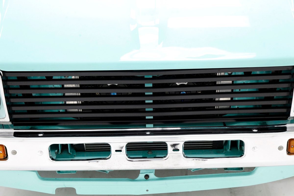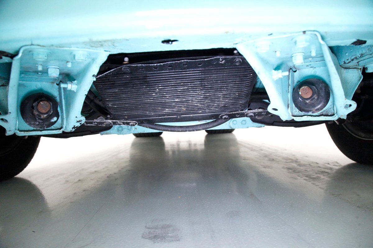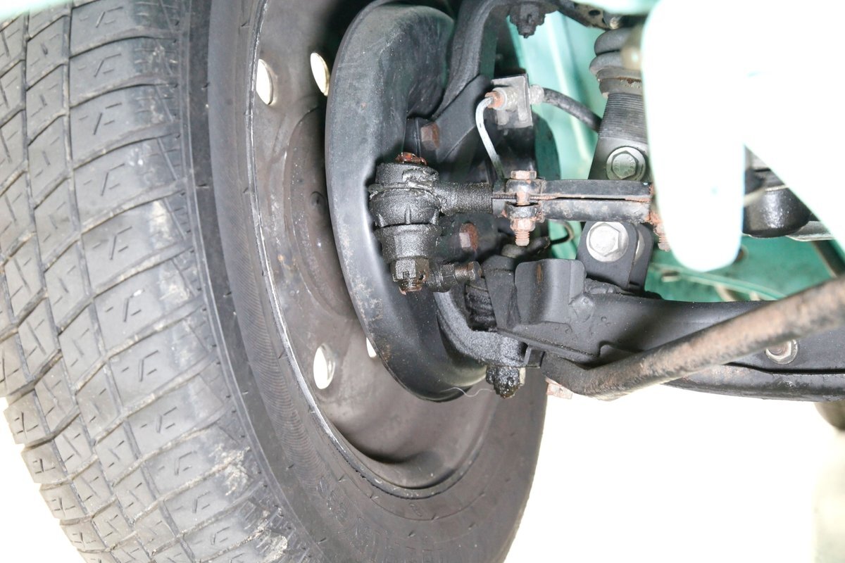 Very nice seafoam green is painted on most surfaces on the floors of the truck . All is very clean under here. For the suspension, it's weighing in with front independent coil overs and for the rear, ladder bars with coil overs. Power disc braking is in front and power drums for the back.