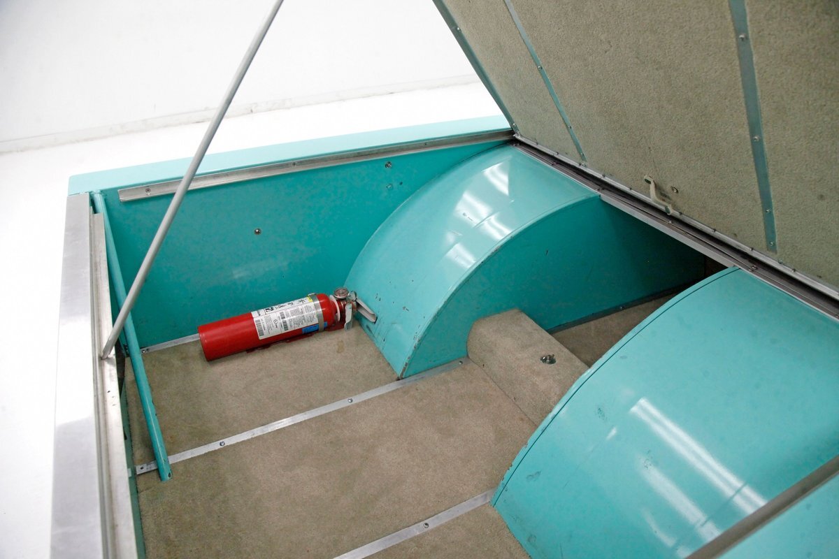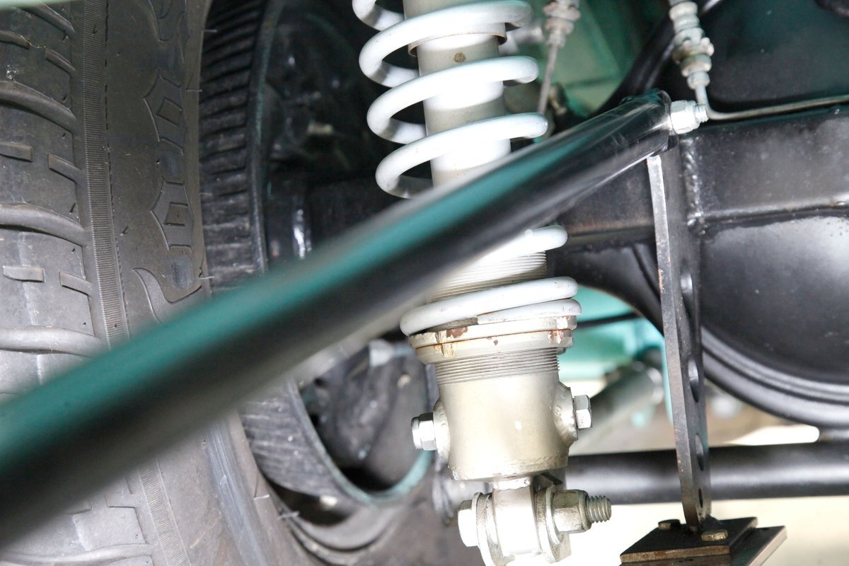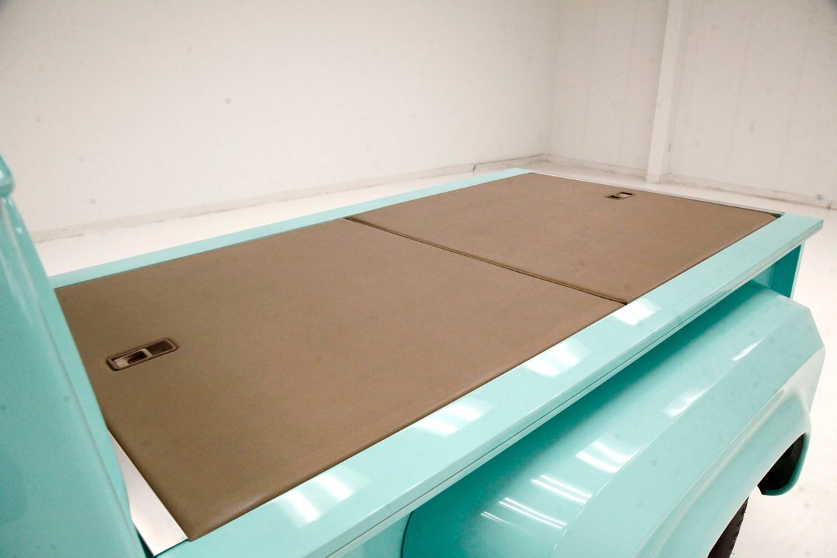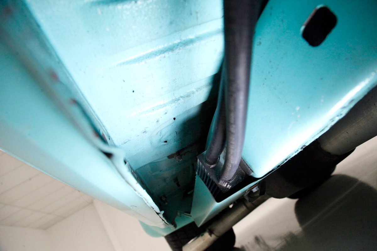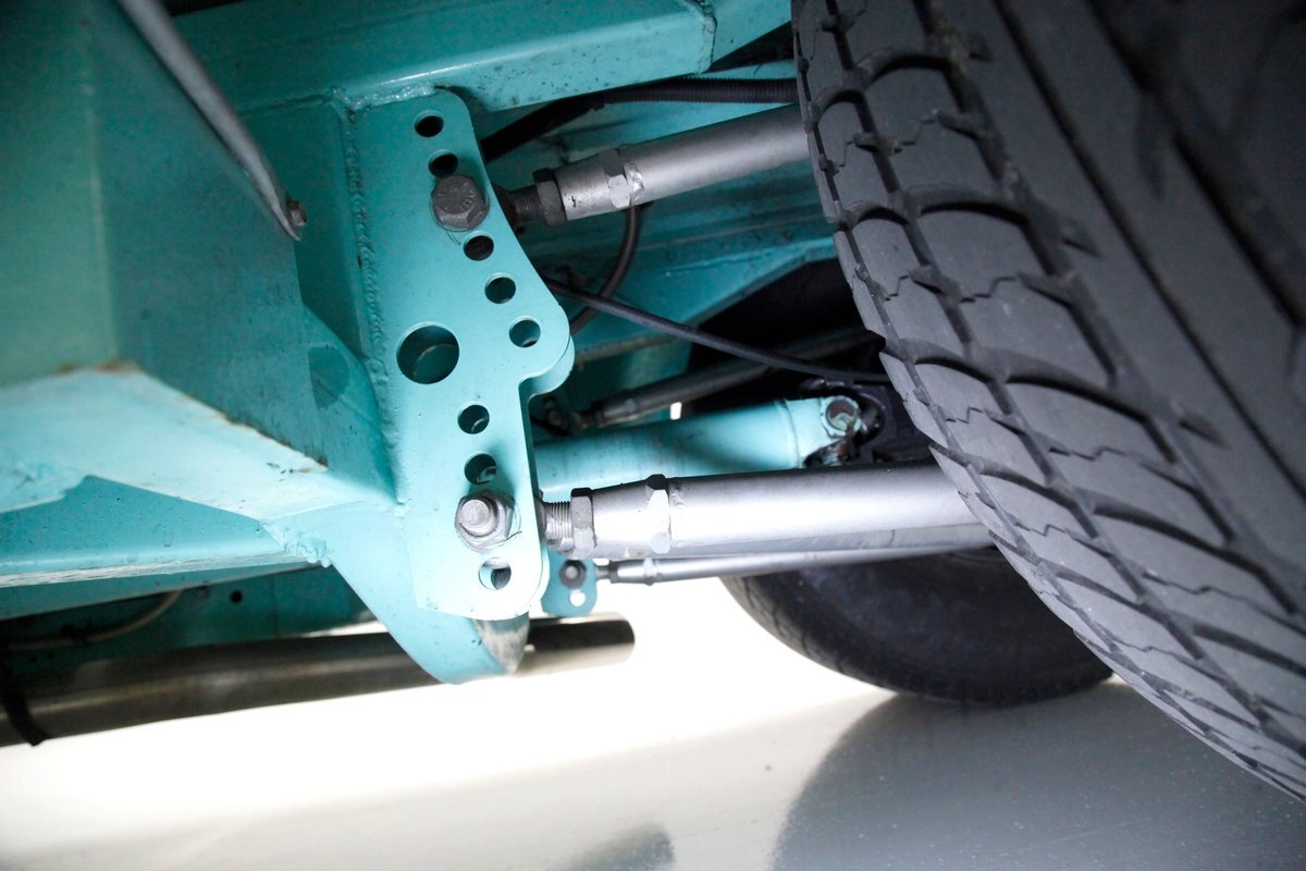Very nice seafoam green is painted on most surfaces on the floors of the truck . All is very clean under here. For the suspension, it's weighing in with front independent coil overs and for the rear, ladder bars with coil overs. Power disc braking is in front and power drums for the back.