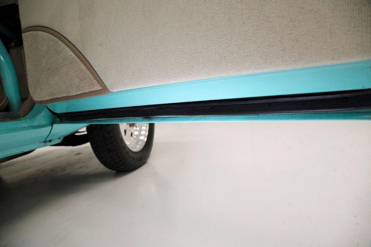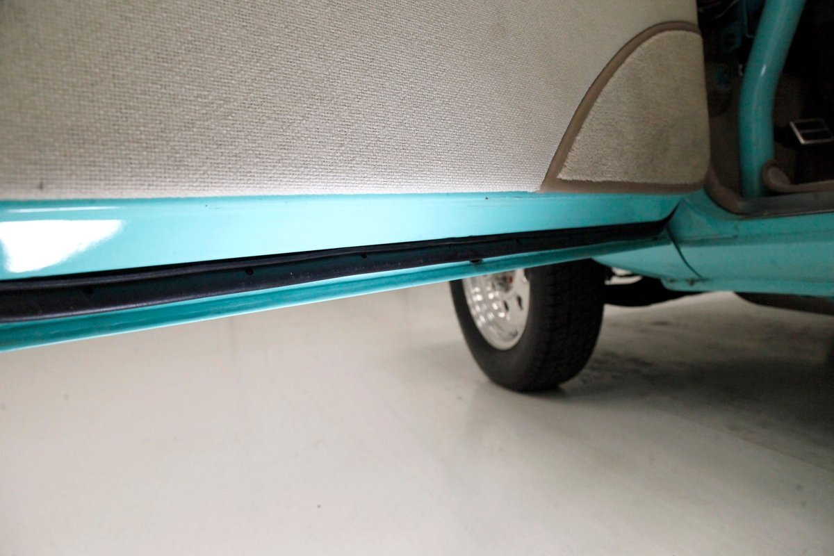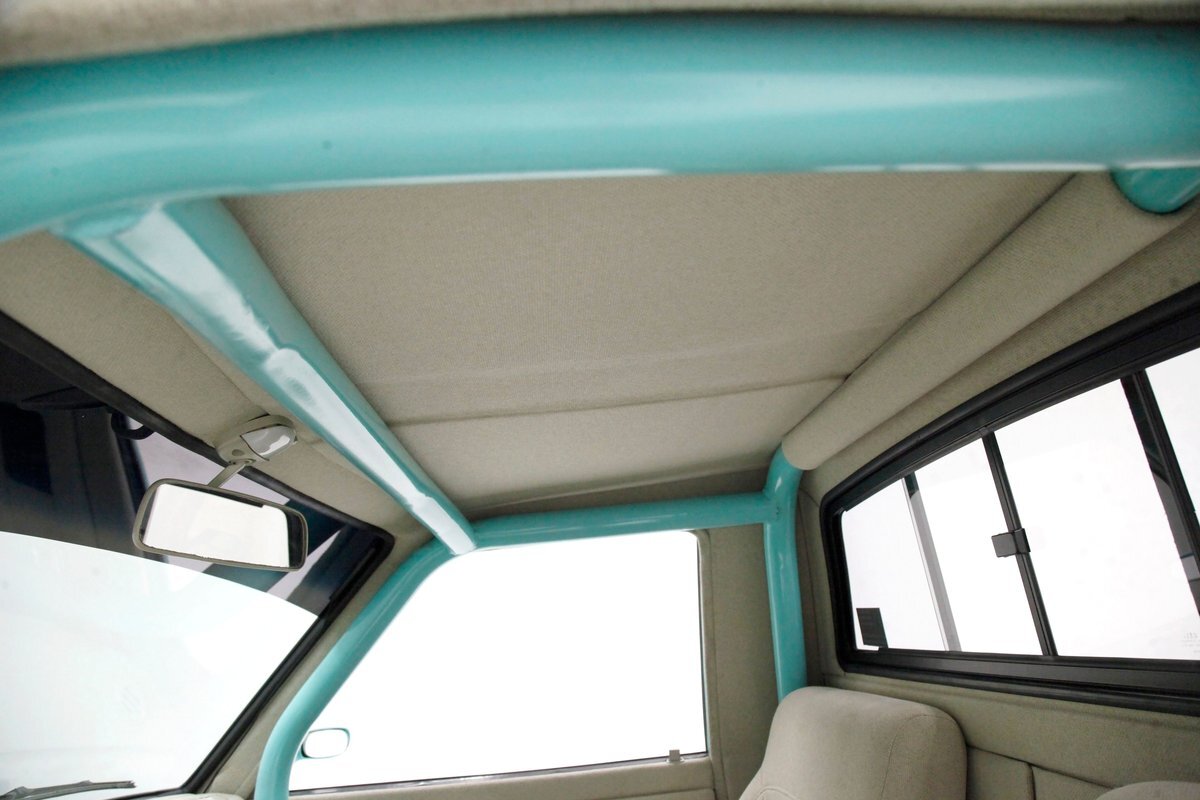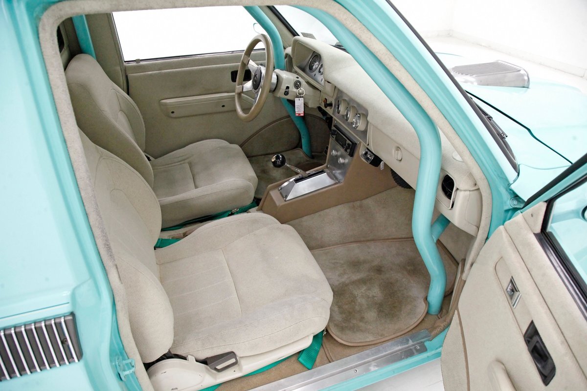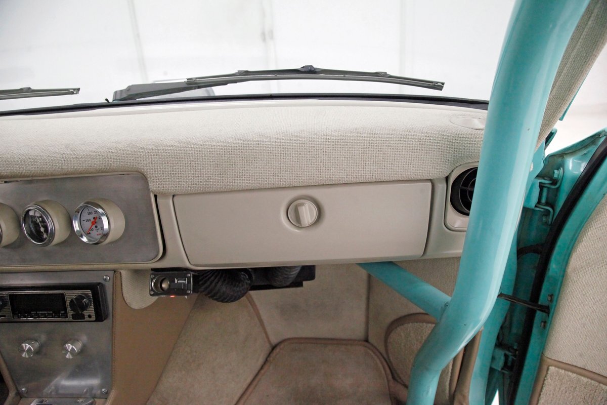 A swing of the doors and we see some snazzy two tone taupe canvas textured broadcloth covering the panels. Power window toggles are now making the movement of the side glass. Inside is a full roll bar snaking its way vertically to the roof around the dash front up around the roof and landing behind the 2 front buckets. These buckets are nice wide low back styled also the canvas textured taupe broadcloth and these sit on turquoise tubs that float on slightly soiled tan carpeting. A center console with some taupe stitched leather and stainless steel inserts houses a Hurst shifter. This stainless paneling continues as it rises vertically where the radio is in and just above the dash has now been customized with the textured tan canvas padded broadcloth. Just below is another stainless panel with a trio of gauges. Below this in the center is a charging port and dual USB outlets. In front of the driver is a LeCarra billet style rally steering wheel which fronts a stainless panels dash with the speedo, fuel gauge and tachometer. To the driver's left is a digital readout box with a few toggles. The broadcloth is also above the seats in the headliner and is also padded.