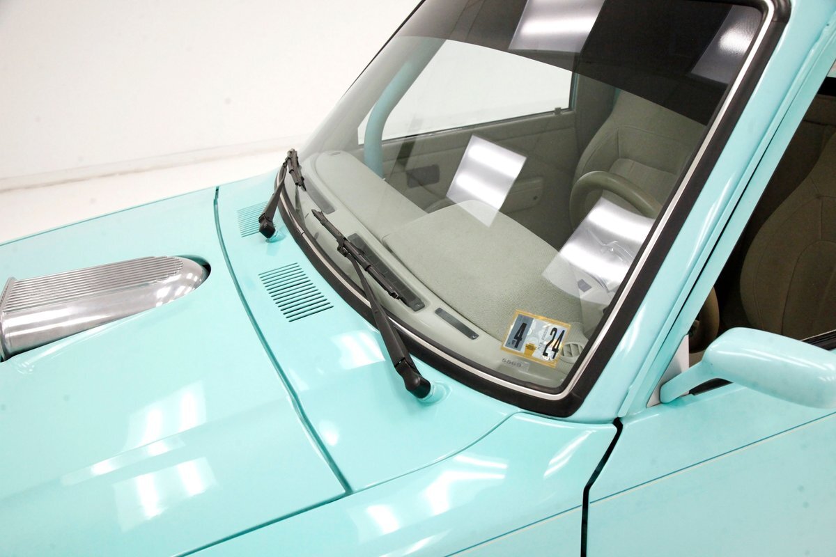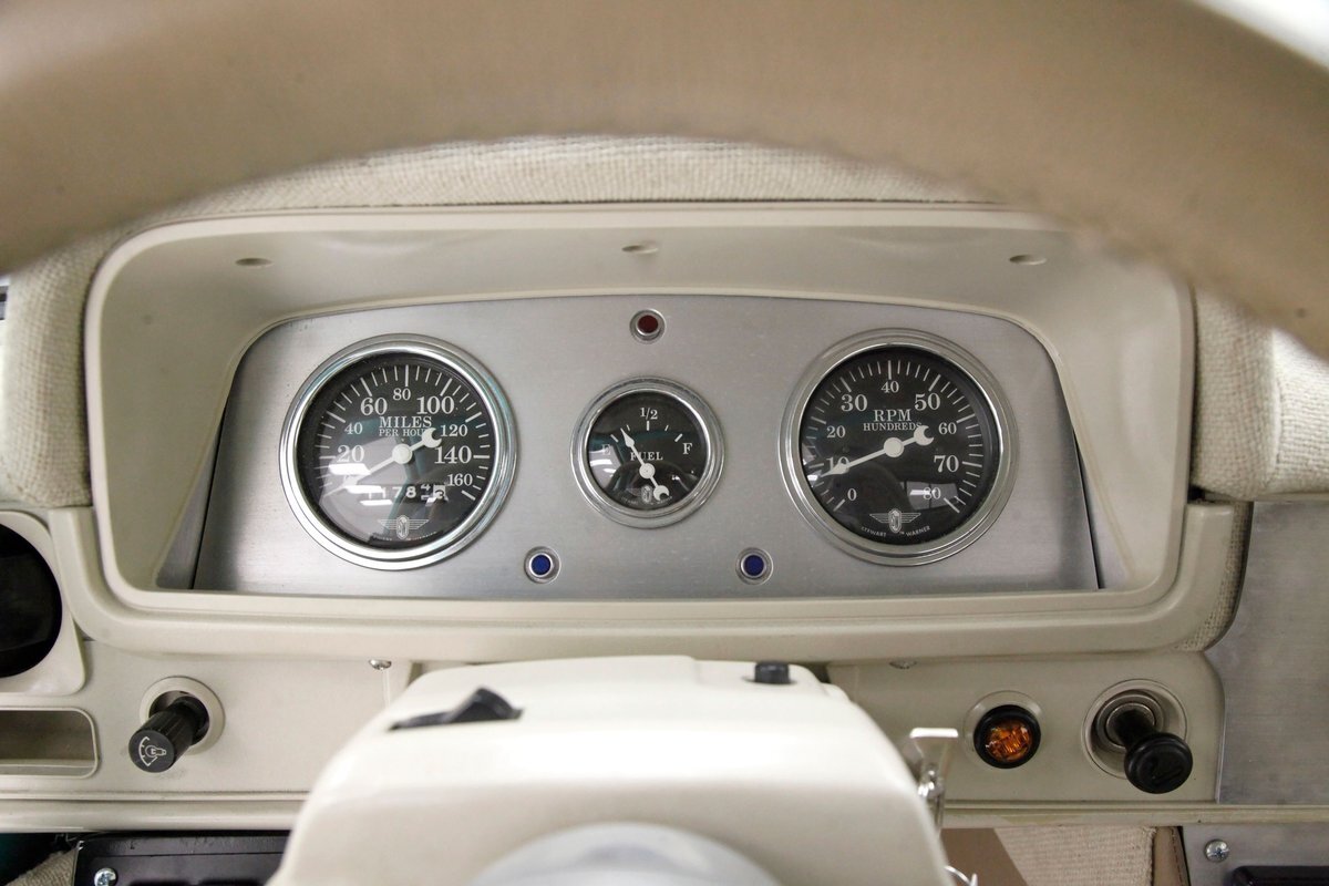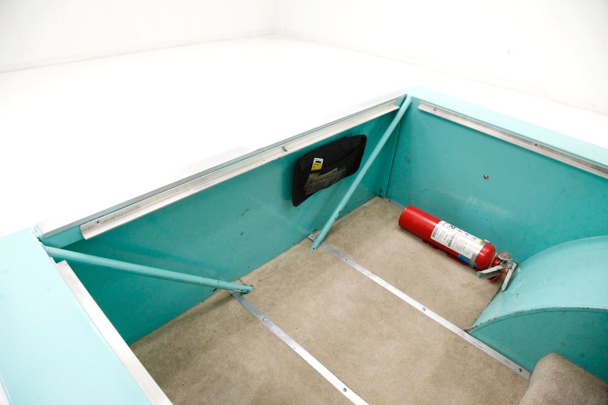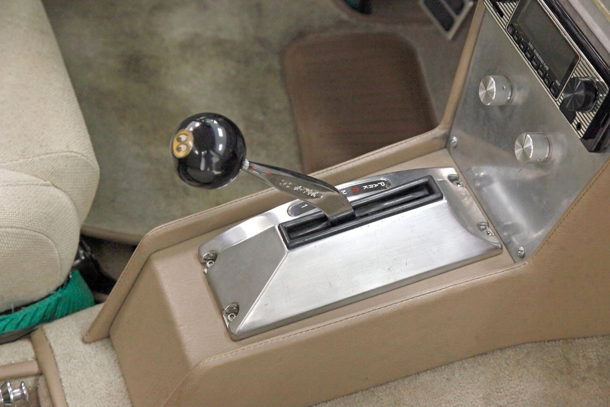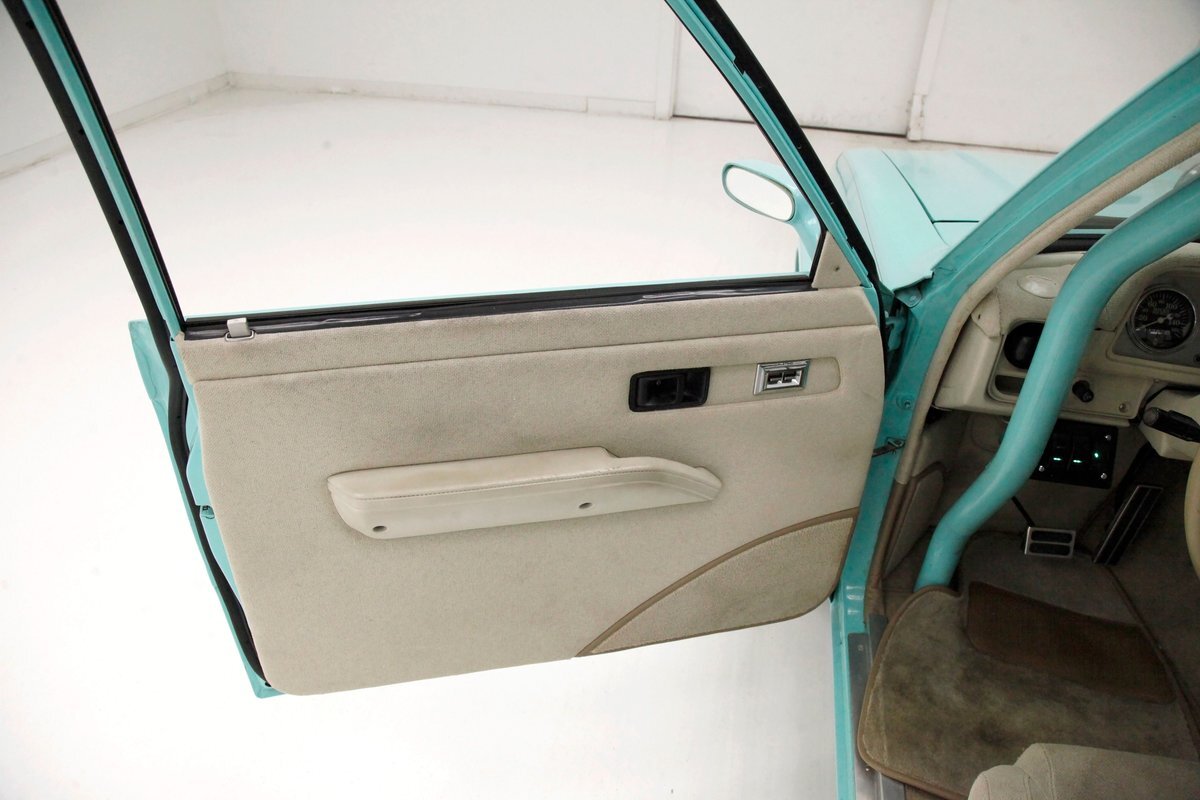 A swing of the doors and we see some snazzy two tone taupe canvas textured broadcloth covering the panels. Power window toggles are now making the movement of the side glass. Inside is a full roll bar snaking its way vertically to the roof around the dash front up around the roof and landing behind the 2 front buckets. These buckets are nice wide low back styled also the canvas textured taupe broadcloth and these sit on turquoise tubs that float on slightly soiled tan carpeting. A center console with some taupe stitched leather and stainless steel inserts houses a Hurst shifter. This stainless paneling continues as it rises vertically where the radio is in and just above the dash has now been customized with the textured tan canvas padded broadcloth. Just below is another stainless panel with a trio of gauges. Below this in the center is a charging port and dual USB outlets. In front of the driver is a LeCarra billet style rally steering wheel which fronts a stainless panels dash with the speedo, fuel gauge and tachometer. To the driver's left is a digital readout box with a few toggles. The broadcloth is also above the seats in the headliner and is also padded.
