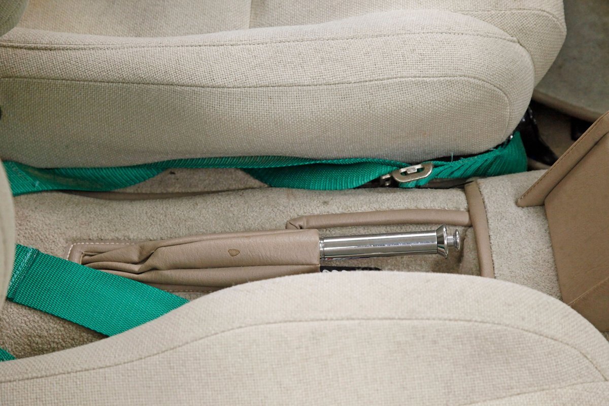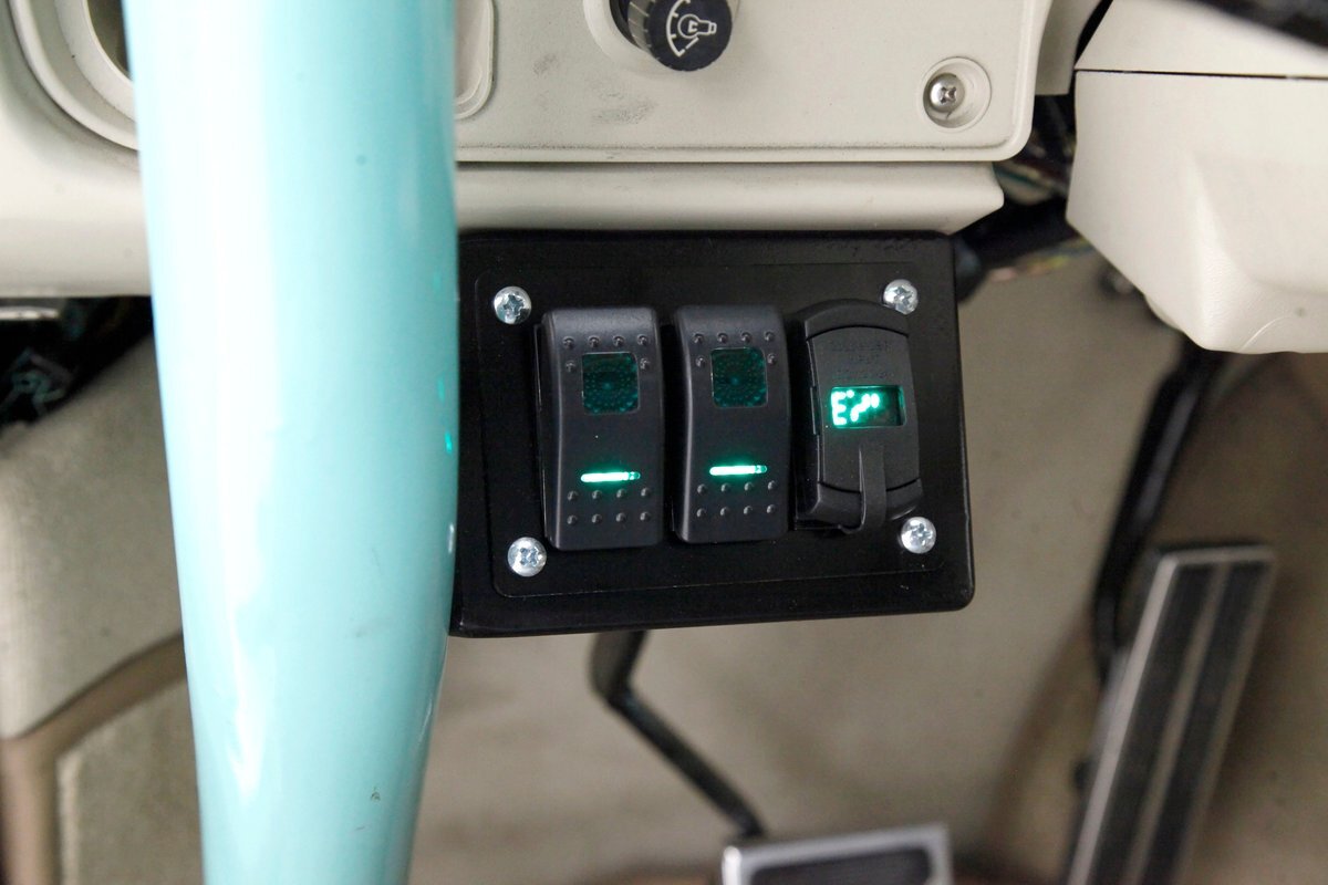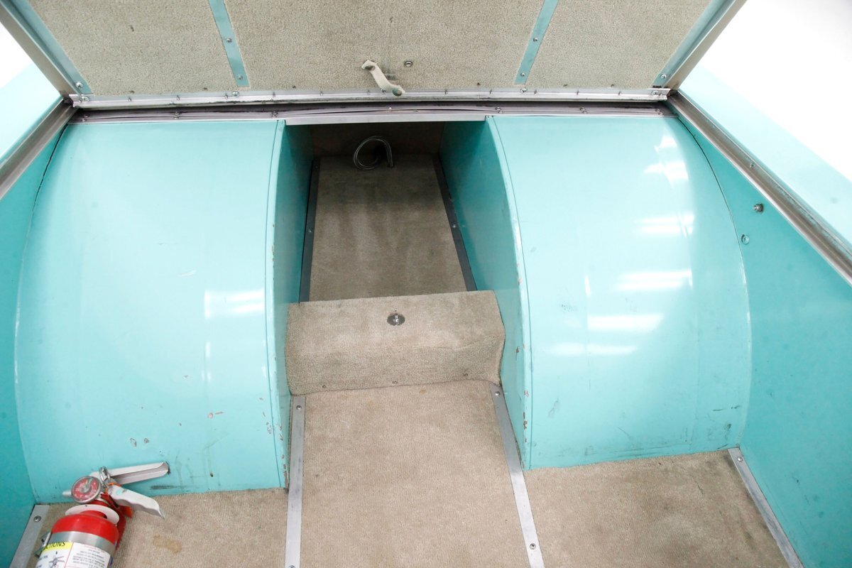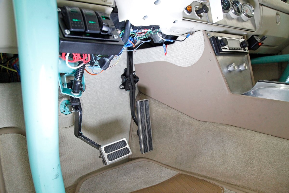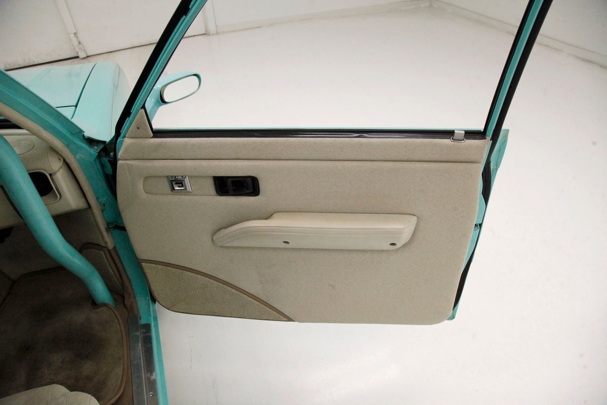 A swing of the doors and we see some snazzy two tone taupe canvas textured broadcloth covering the panels. Power window toggles are now making the movement of the side glass. Inside is a full roll bar snaking its way vertically to the roof around the dash front up around the roof and landing behind the 2 front buckets. These buckets are nice wide low back styled also the canvas textured taupe broadcloth and these sit on turquoise tubs that float on slightly soiled tan carpeting. A center console with some taupe stitched leather and stainless steel inserts houses a Hurst shifter. This stainless paneling continues as it rises vertically where the radio is in and just above the dash has now been customized with the textured tan canvas padded broadcloth. Just below is another stainless panel with a trio of gauges. Below this in the center is a charging port and dual USB outlets. In front of the driver is a LeCarra billet style rally steering wheel which fronts a stainless panels dash with the speedo, fuel gauge and tachometer. To the driver's left is a digital readout box with a few toggles. The broadcloth is also above the seats in the headliner and is also padded.