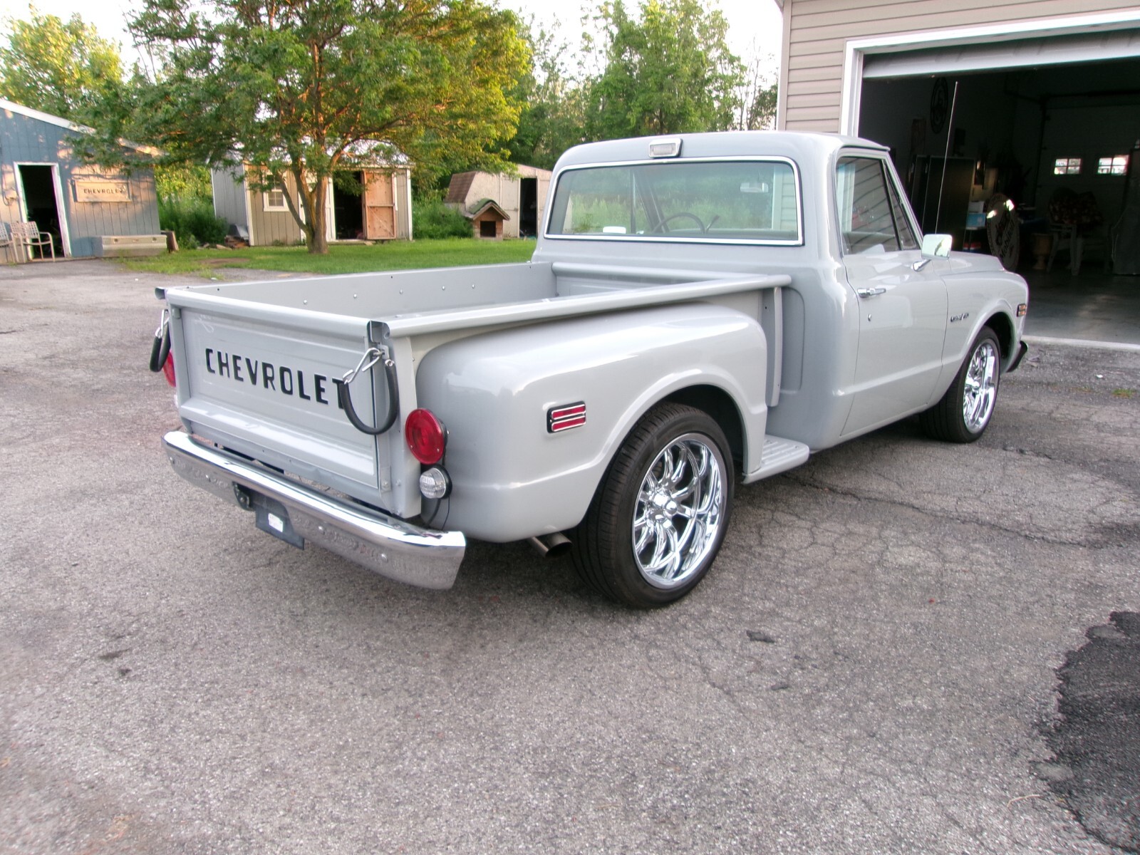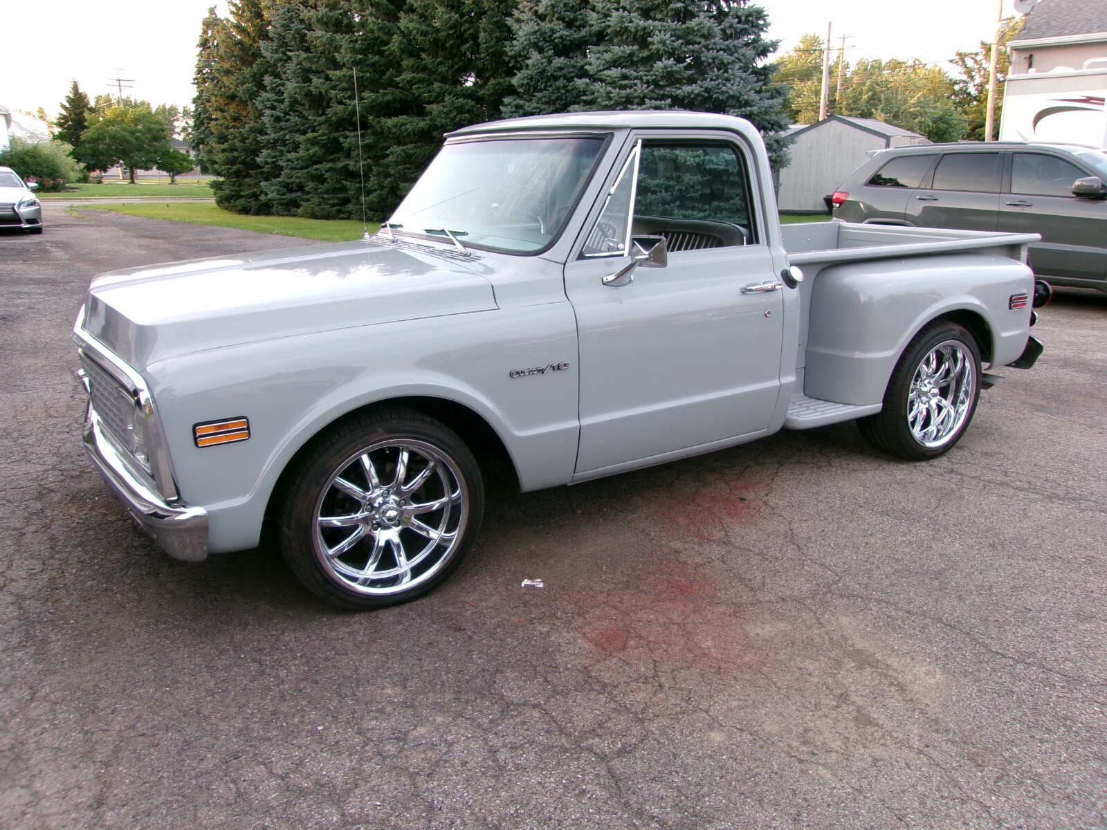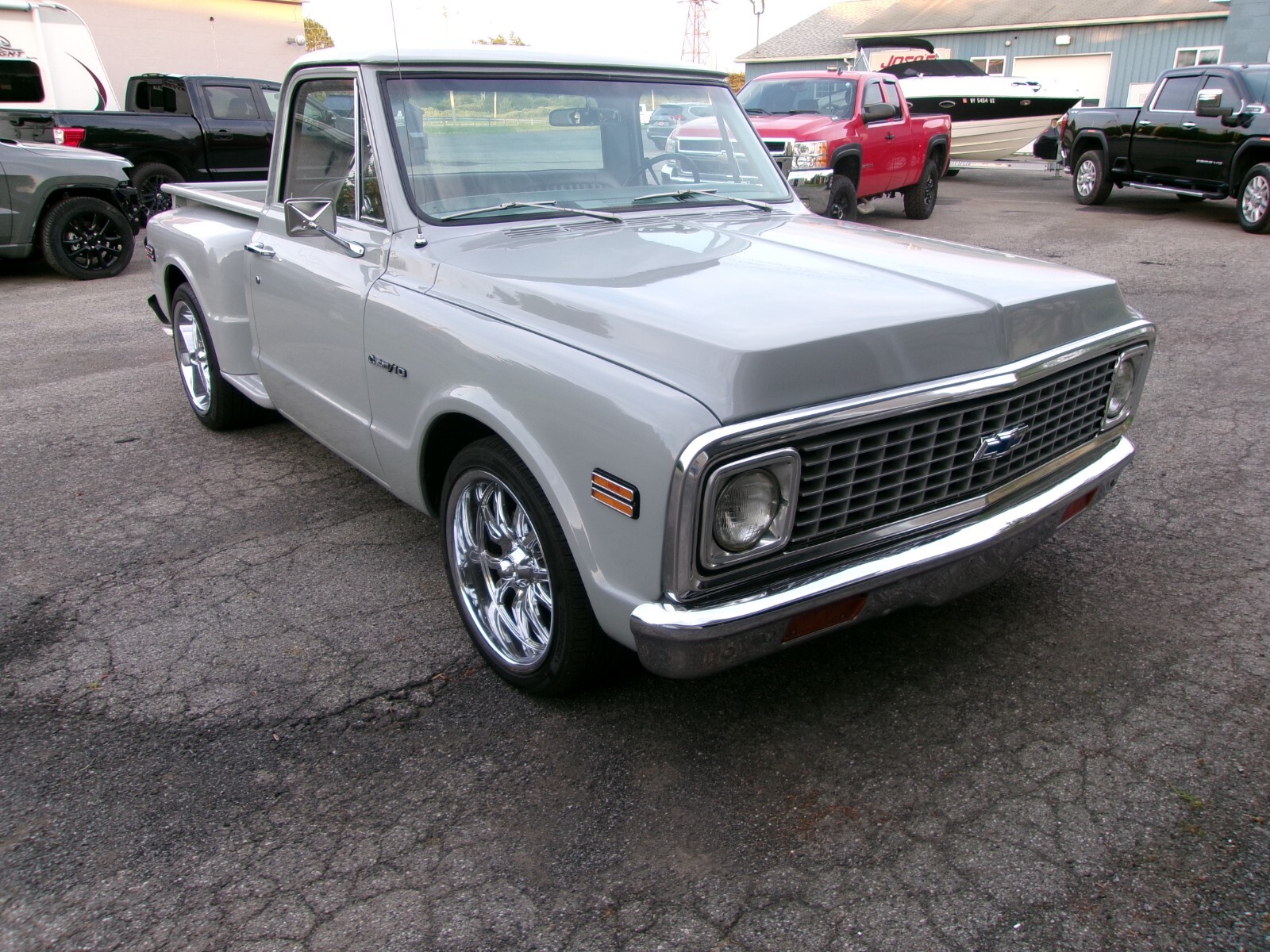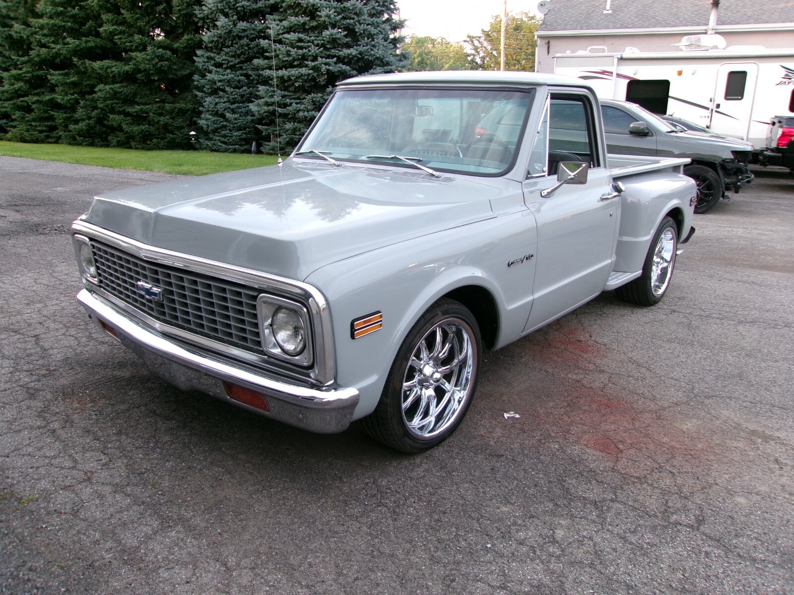 1971 chev c 10 stepside with 350 mile cam rust free arizona truck truck has many new parts chrome wheels and tires exhaust grille wood floor in box and stainless steel mldgs tailgate seat blue tool radio electronic ignition windshield back glass truck was original long box call for more details thanks 716 8077208 new paint base coat clear reads 43956 miles not sue if original