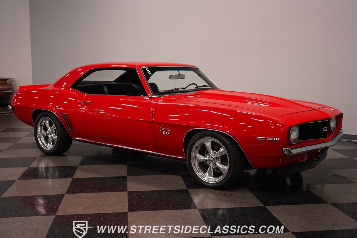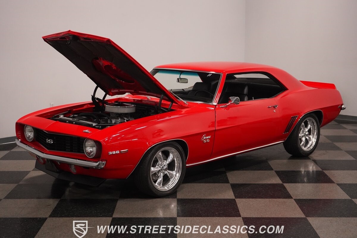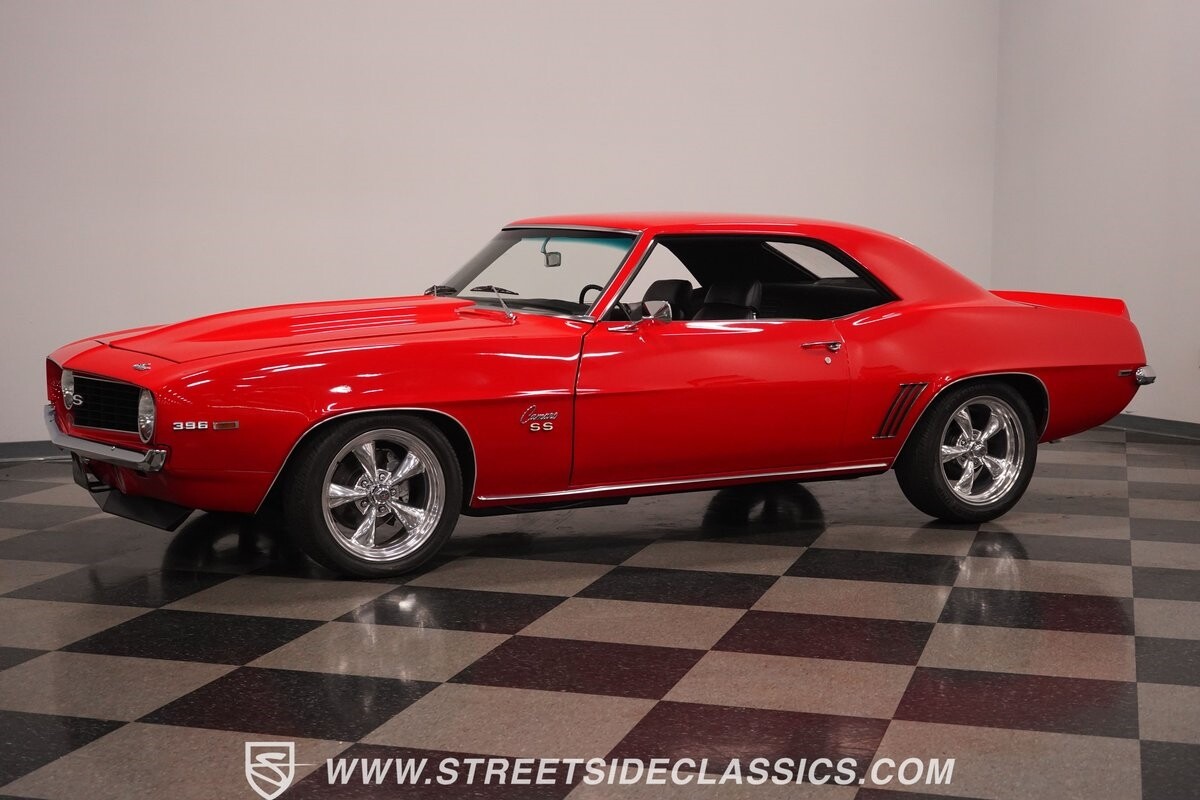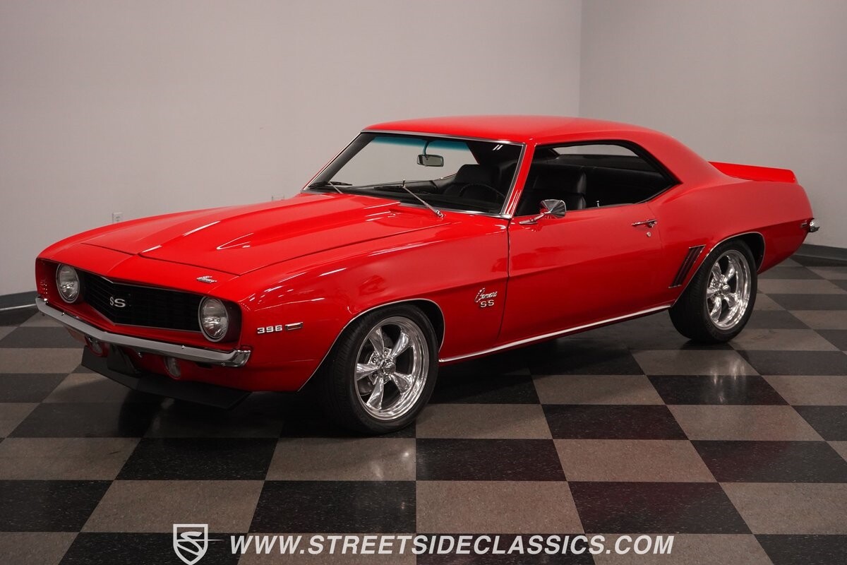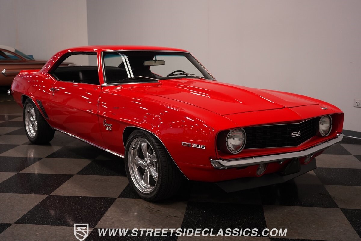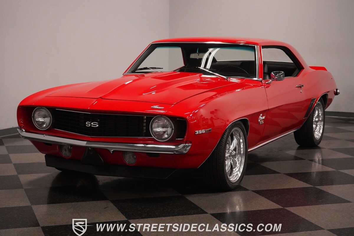 The 1969 Camaro is considered by many to be the best of the breed when it comes to GM's first-generation (1967-1969) F-Body cars, and by looking at this exceptional example, it is clear to see why so many enthusiasts are drawn to it. This stunning 1969 Camaro has had a restoration some years ago and has been beautifully maintained since. Built as a SS396 Tribute car, under the hood lurks a recently rebuilt big block 454 engine, complete with factory Winters aluminum intake manifold topped with a Holly Performance 4-barrel carburetor. Factory-style chrome valve covers and air cleaner on the detailed engine compartment complete the clean, period, all-business look under the hood. An aluminum radiator keeps this big block running cool. Power to the rear wheels is transferred through a Muncie M20 4-speed manual transmission shifted with a Hurst shifter with chrome shift ball. The interior is stock in appearance, with the exception of a set of aftermarket gauges under the dash to monitor the powerful big bock engine. Stopping power is aided by a set of factory front disc brakes.