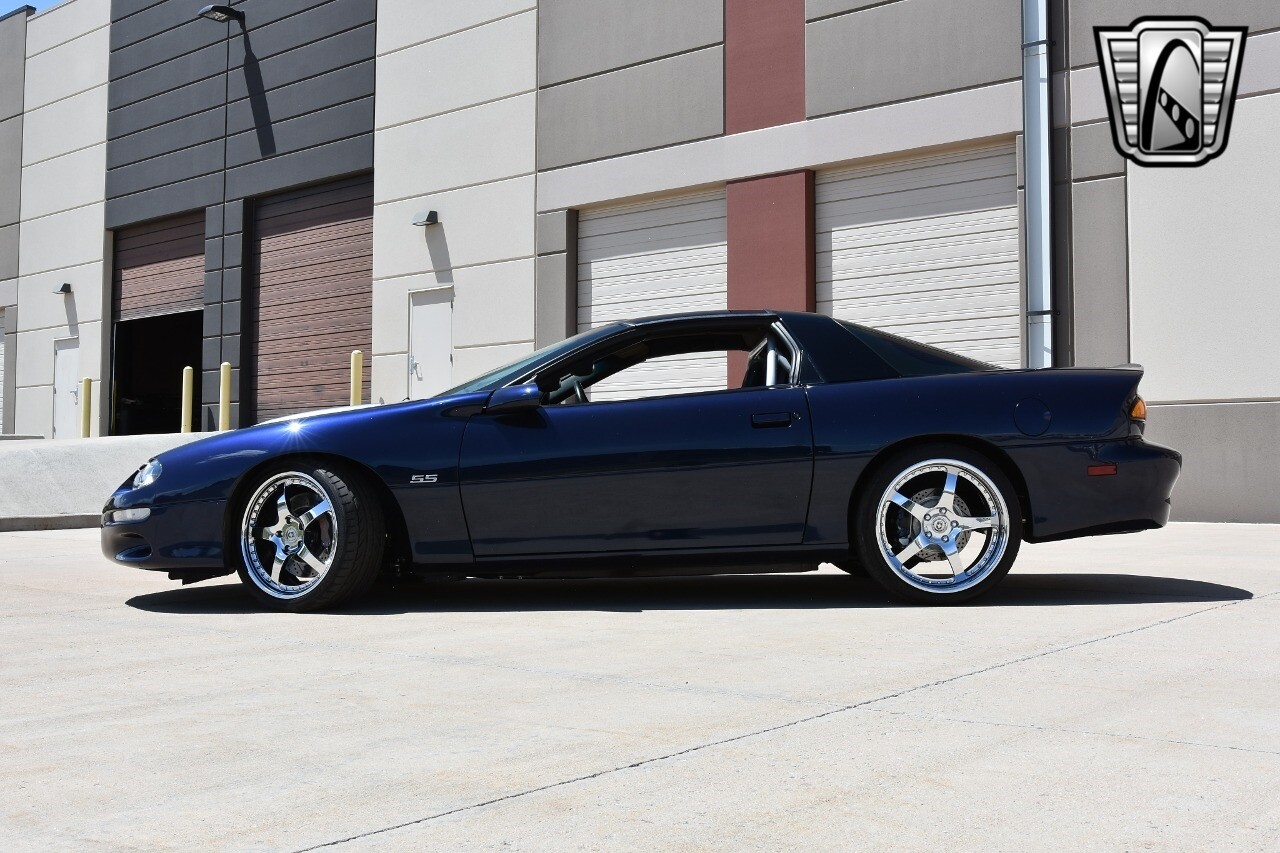 Introducing the 2002 Chevrolet Camaro SS, a classic American muscle car that combines power, performance, and style. This model is finished in a striking blue exterior color that beautifully complements its sleek black interior.
