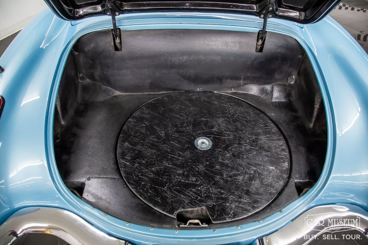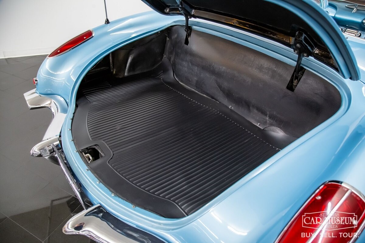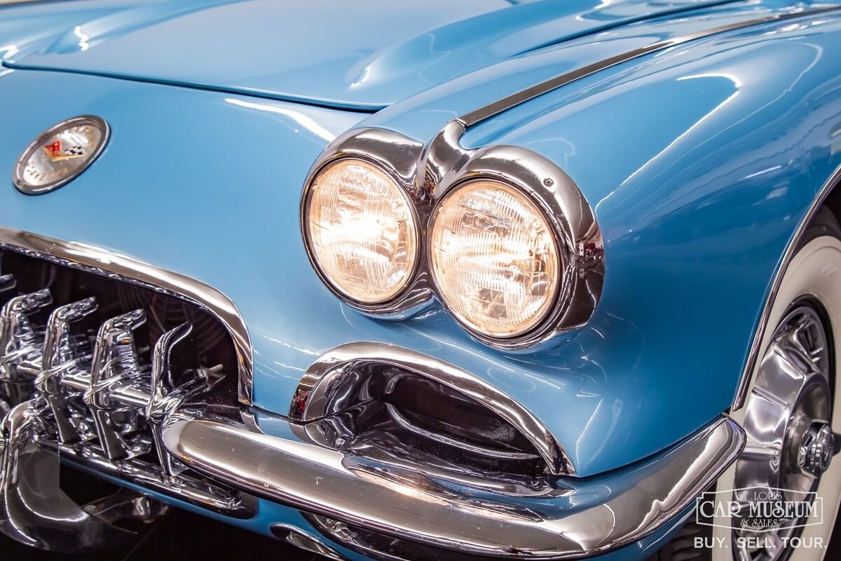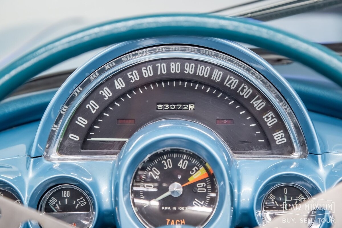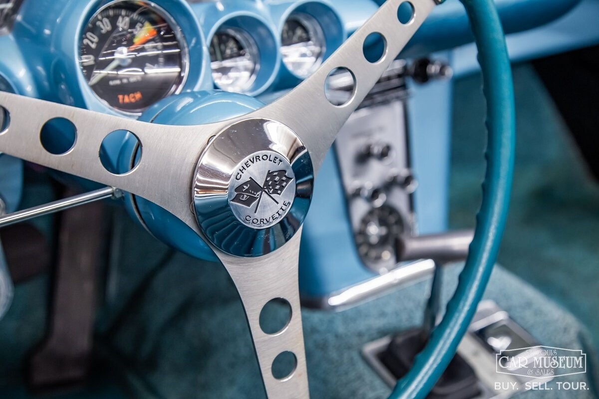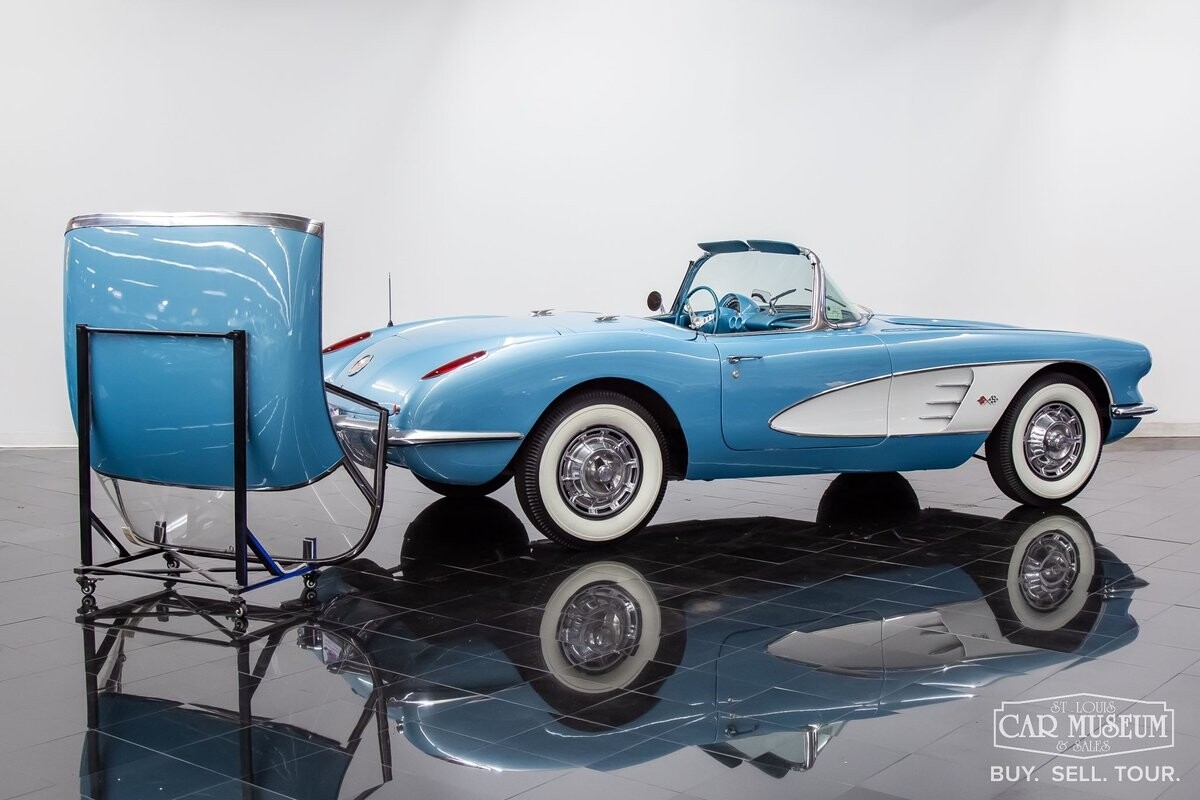 This 1959 Corvette is finished in Frost Blue accented by Snowcrest White coves and Turquoise Vinyl interior. Optioned include date-code correct 283ci V8-245hp engine with 2x4 carburetion, 4-speed manual transmission, upgraded 3.73 Posi-traction rear end, dash tachometer, heater/defrost, courtesy light, Firestone Deluxe Champion white wall tires measuring 6.70-15, Wonderbar signal seek radio, black carpeted floor mats, along with both auxiliary hardtop and white convertible soft top.