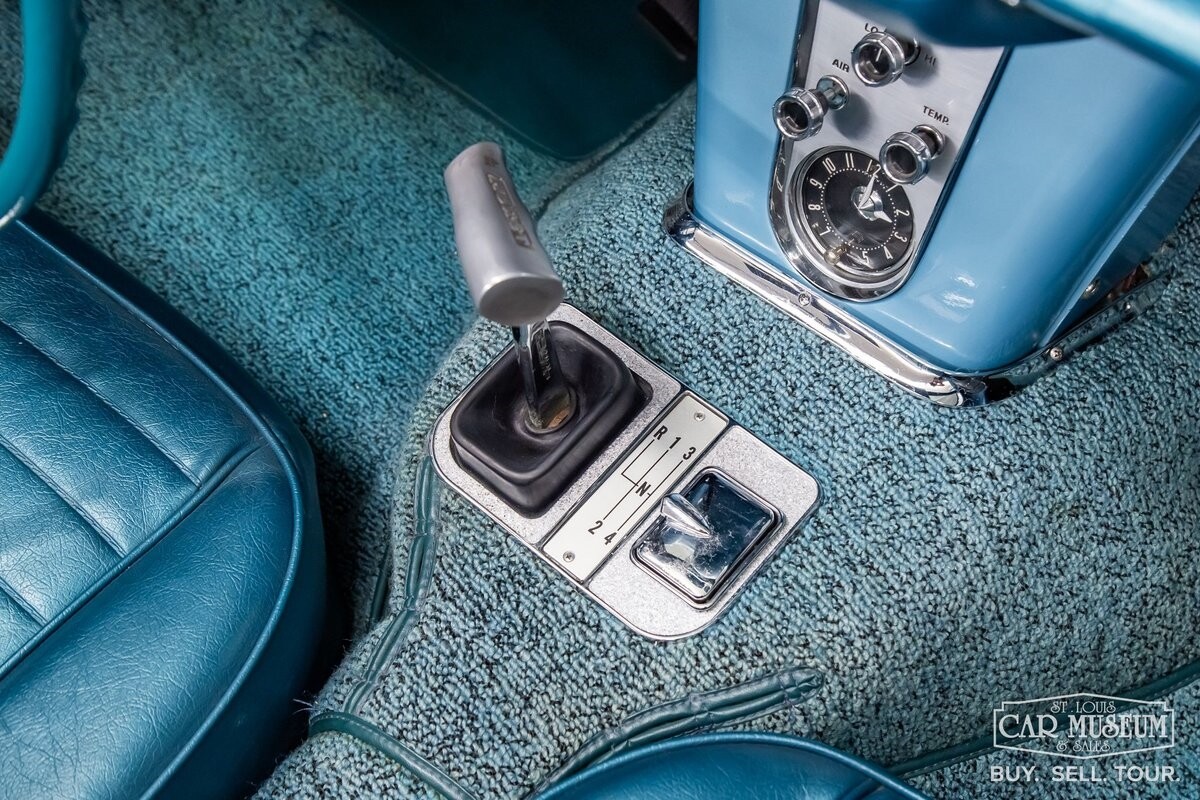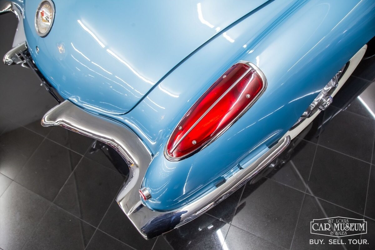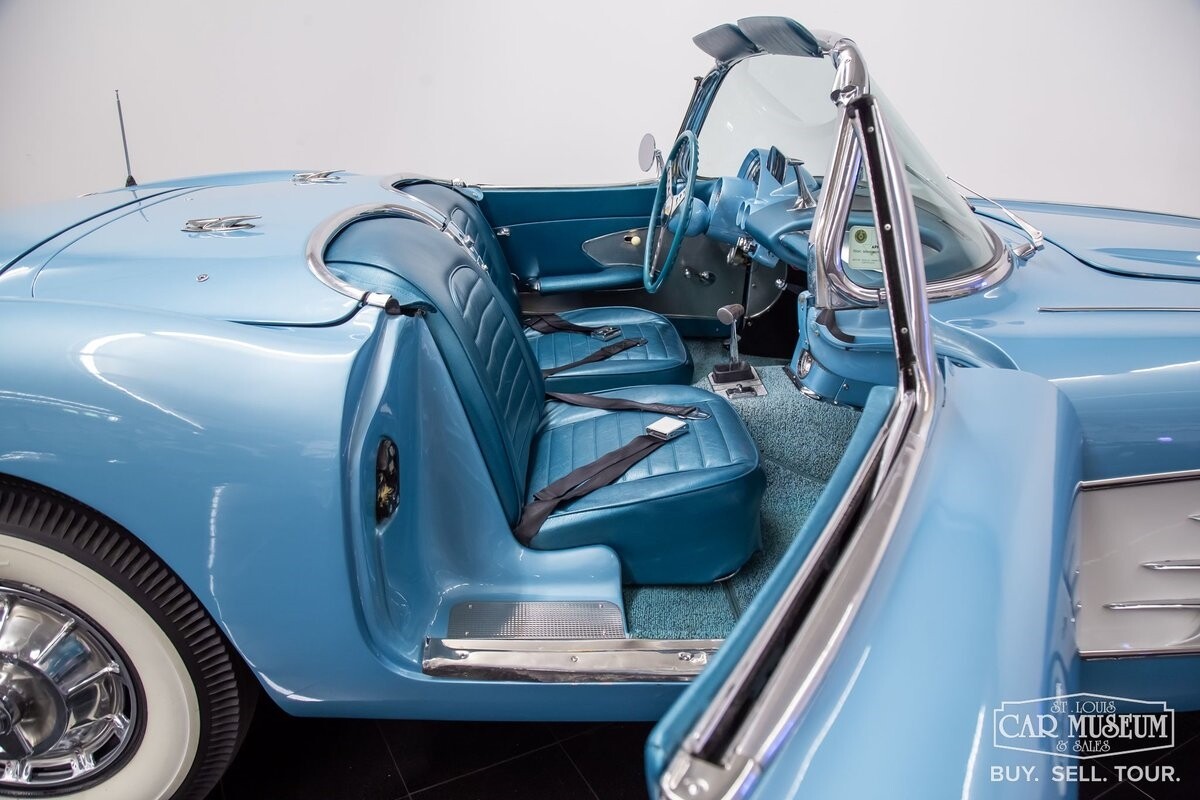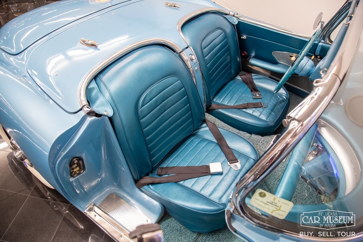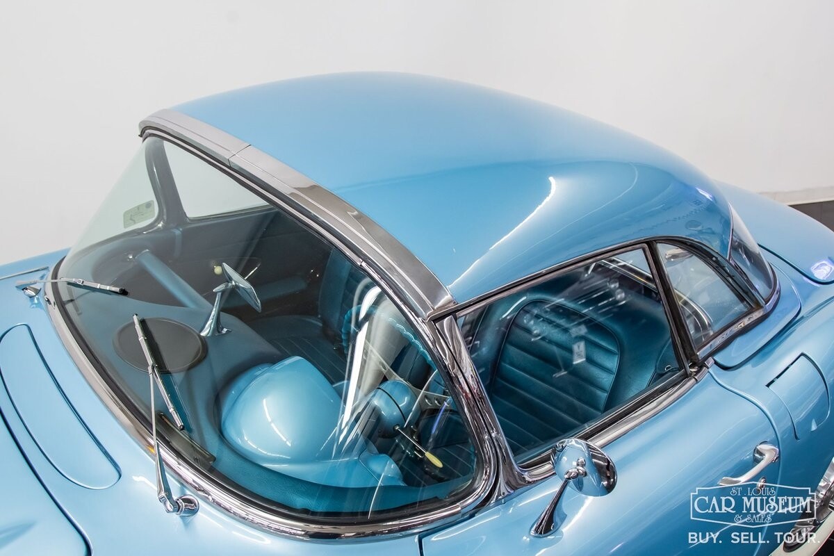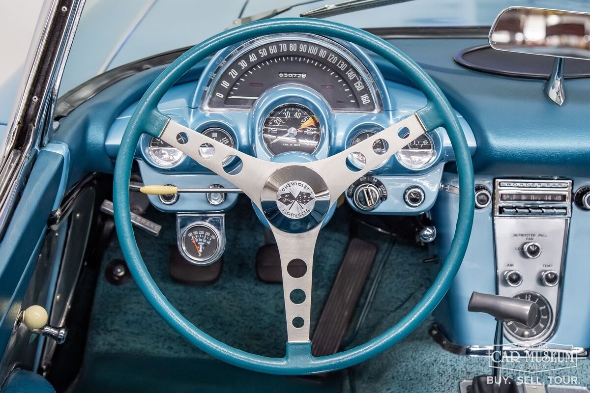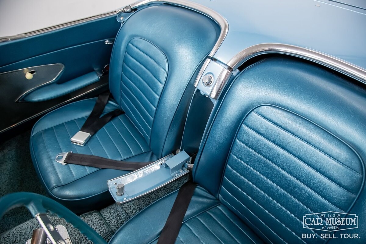 This 1959 Corvette is finished in Frost Blue accented by Snowcrest White coves and Turquoise Vinyl interior. Optioned include date-code correct 283ci V8-245hp engine with 2x4 carburetion, 4-speed manual transmission, upgraded 3.73 Posi-traction rear end, dash tachometer, heater/defrost, courtesy light, Firestone Deluxe Champion white wall tires measuring 6.70-15, Wonderbar signal seek radio, black carpeted floor mats, along with both auxiliary hardtop and white convertible soft top.
