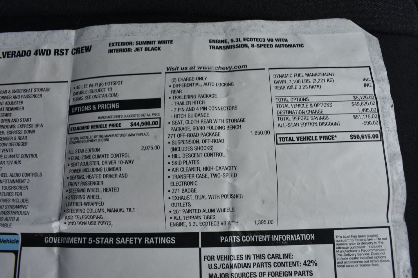 You are looking at a 2019 Chevrolet Silverado 1500 Crew Cab RST Z71 4X4. It is powered with a 5.3L Vortec V8 and Six Speed automatic transmission. It is equipped with am/fm radio, power drivers seat, power windows, power locks, power mirrors, tilt, cruise, and receiver hitch. Also included is the owners manuals and one keyless remote.