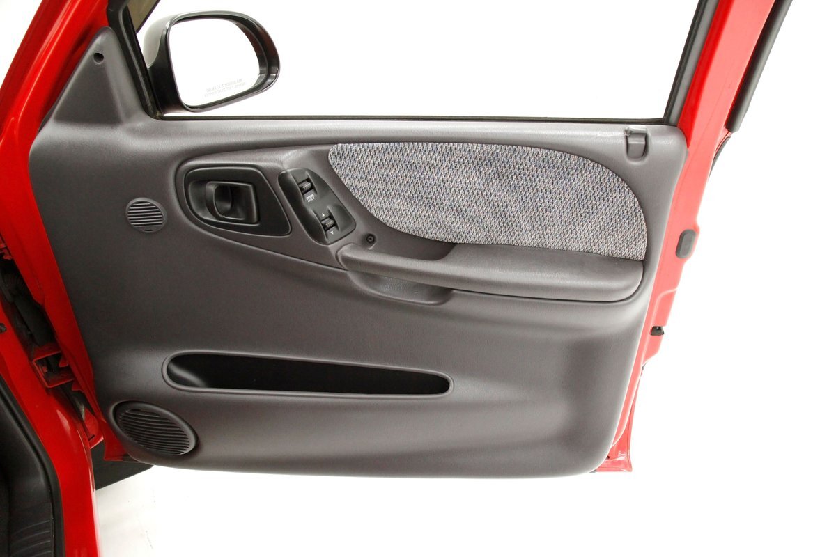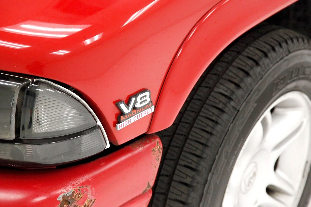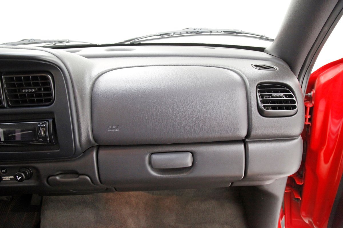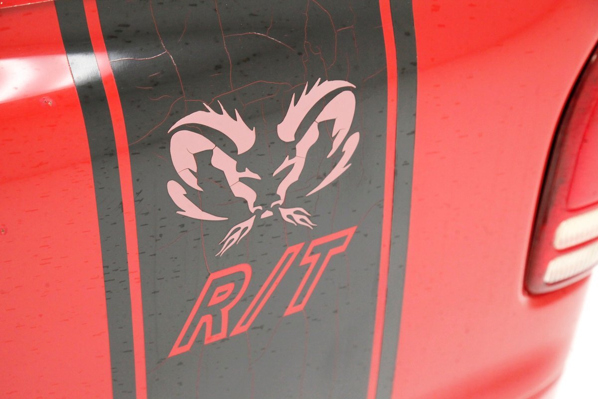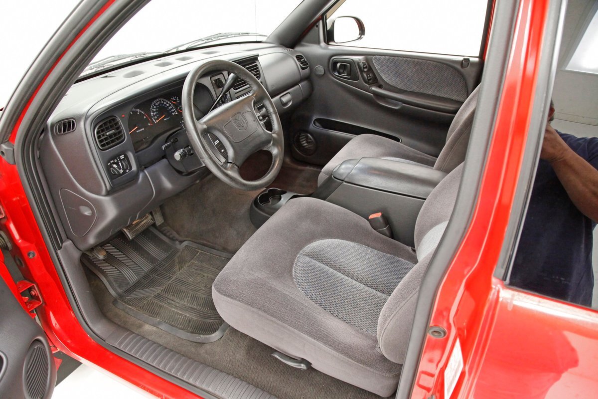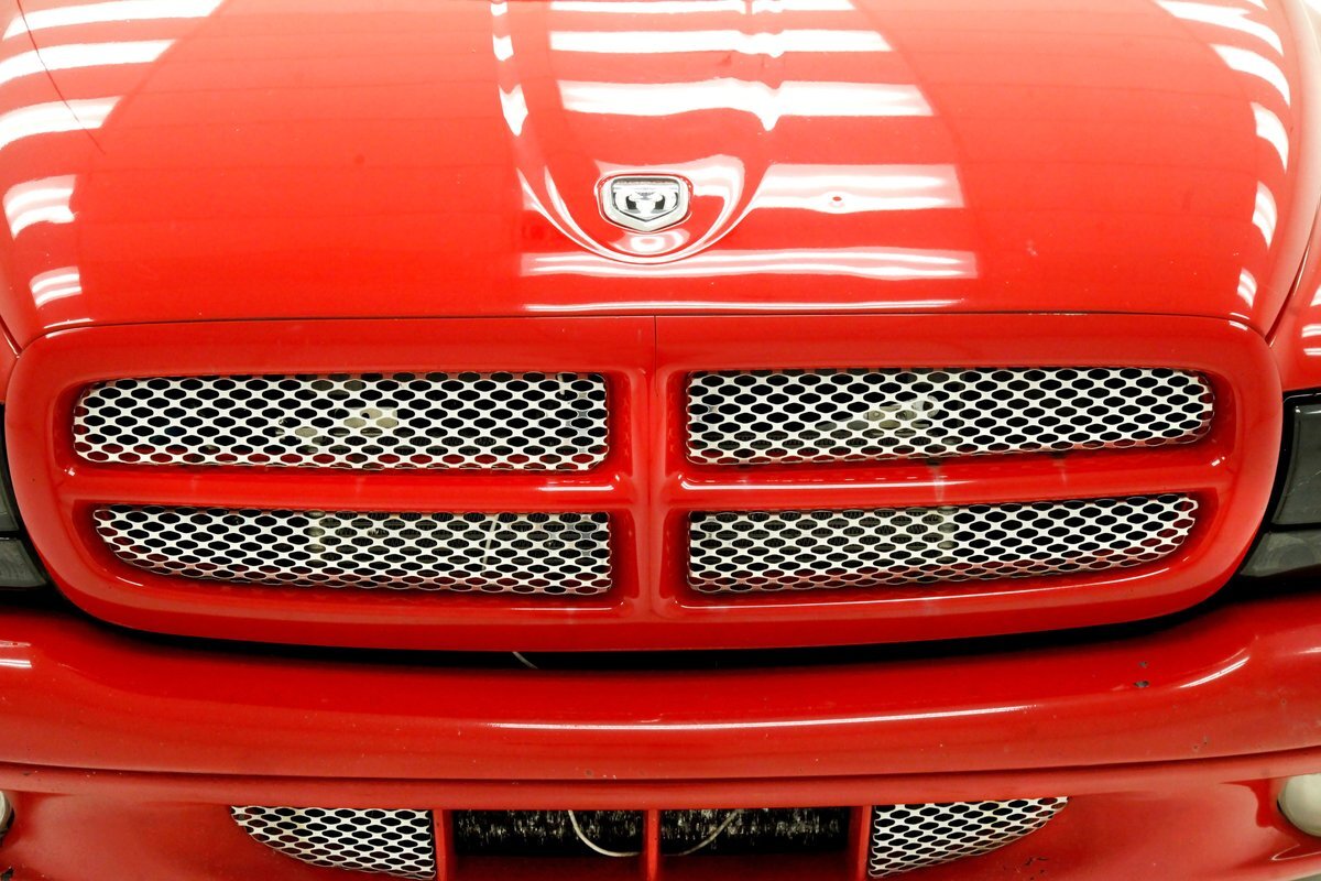 A Flame Red painted wild child if you will, and then some, we are graced with this Dakota in our presence. This is not just your run of the mill truck either, as it has a custom mesh Street Scene grille installed. Aero designed headlights are flanking on either side and have been slightly tinted just like the glass. The red painted bumper in front is showing some rust on the driver's corner most likely due to a mishap and below is a large open smaller grille within the wide bumper and some inset running lights are seen. Lightly smoked glass for the cab with black trimmings and black B pillar wrap-ins coming loose on the drivers and passenger's sides are also noted. Black decal badges present on the door panels, and adding to the mystique are black mirrors, handles and plenty of smoked window visors. On the back, a pneumatic tube bed cover in fiberglass protects your cargo. The interior of the bed is also covered in trunk liner charcoal gray carpeting throughout. The rear bumper has been shaved for a cleaner look and this is coming our way this way from the factory. Nice side and bed panels are all rust free and a vertical black RT badged stripe is just forward of the tailgate on either side. Dual exhaust peek out the passengers side just forward of the rear wheels. 17-inch wheels are wrapped in 235/60R17 rubber from the 41st week of 2020.