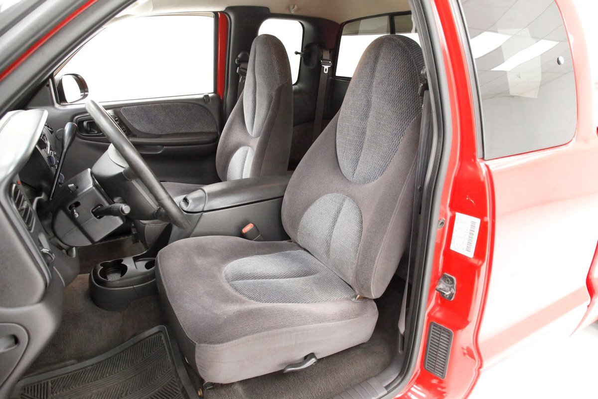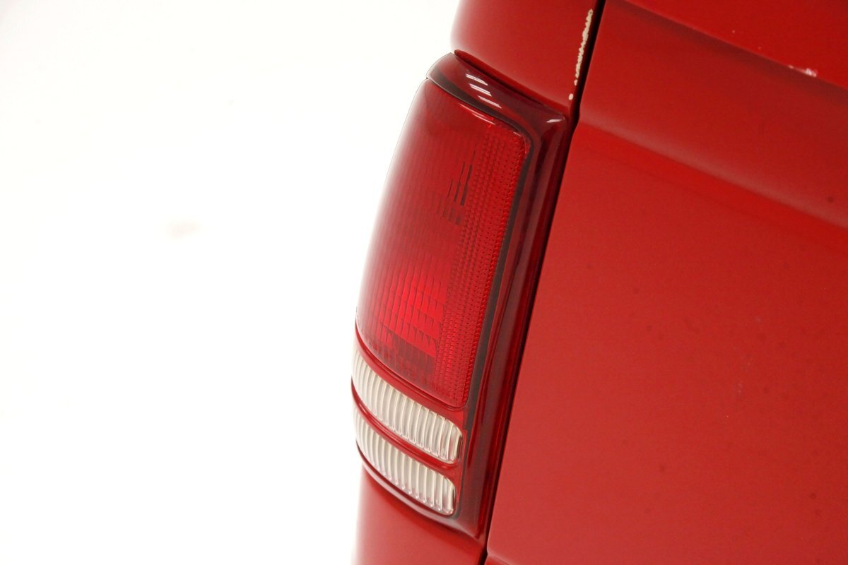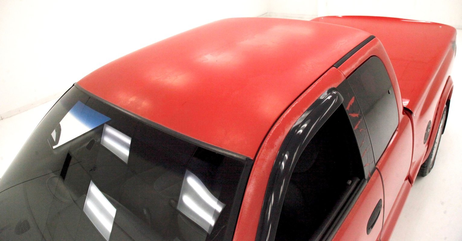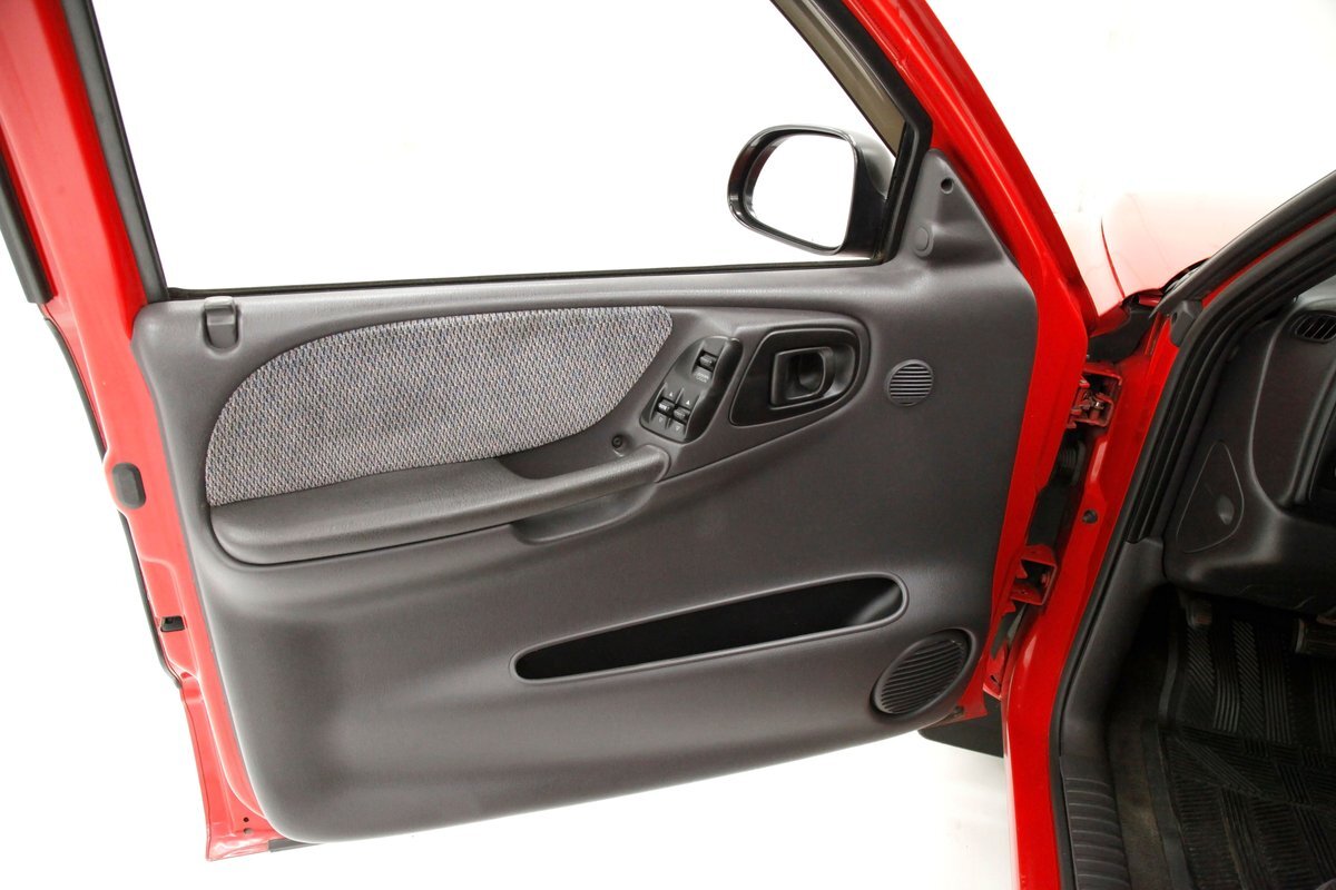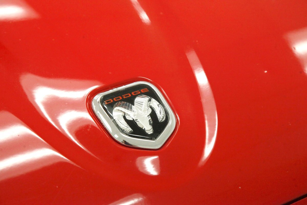 A Flame Red painted wild child if you will, and then some, we are graced with this Dakota in our presence. This is not just your run of the mill truck either, as it has a custom mesh Street Scene grille installed. Aero designed headlights are flanking on either side and have been slightly tinted just like the glass. The red painted bumper in front is showing some rust on the driver's corner most likely due to a mishap and below is a large open smaller grille within the wide bumper and some inset running lights are seen. Lightly smoked glass for the cab with black trimmings and black B pillar wrap-ins coming loose on the drivers and passenger's sides are also noted. Black decal badges present on the door panels, and adding to the mystique are black mirrors, handles and plenty of smoked window visors. On the back, a pneumatic tube bed cover in fiberglass protects your cargo. The interior of the bed is also covered in trunk liner charcoal gray carpeting throughout. The rear bumper has been shaved for a cleaner look and this is coming our way this way from the factory. Nice side and bed panels are all rust free and a vertical black RT badged stripe is just forward of the tailgate on either side. Dual exhaust peek out the passengers side just forward of the rear wheels. 17-inch wheels are wrapped in 235/60R17 rubber from the 41st week of 2020.