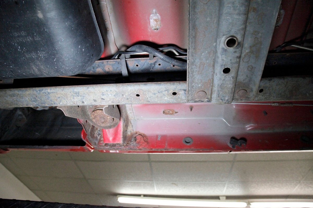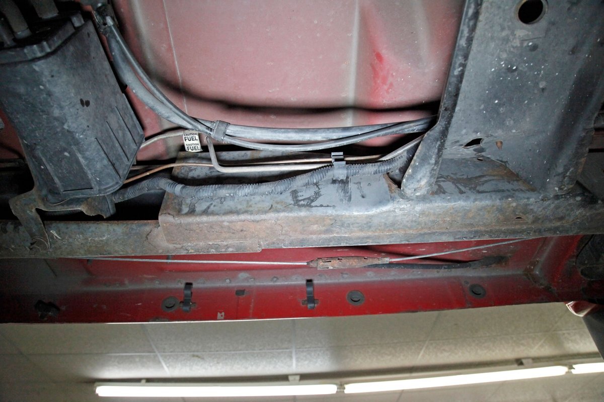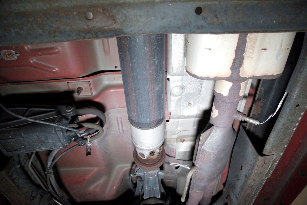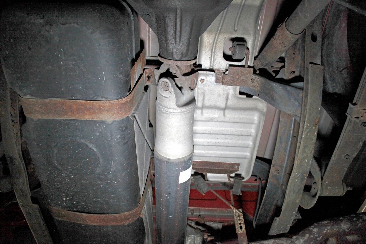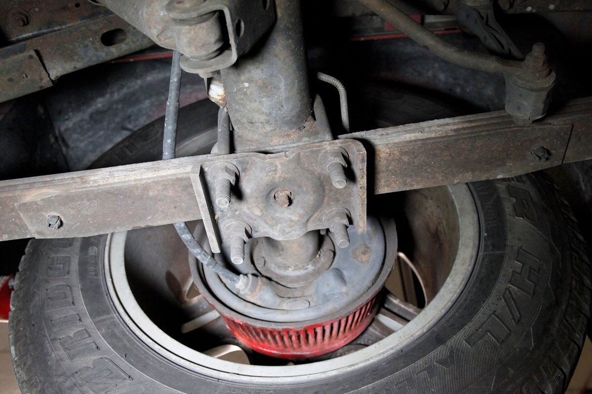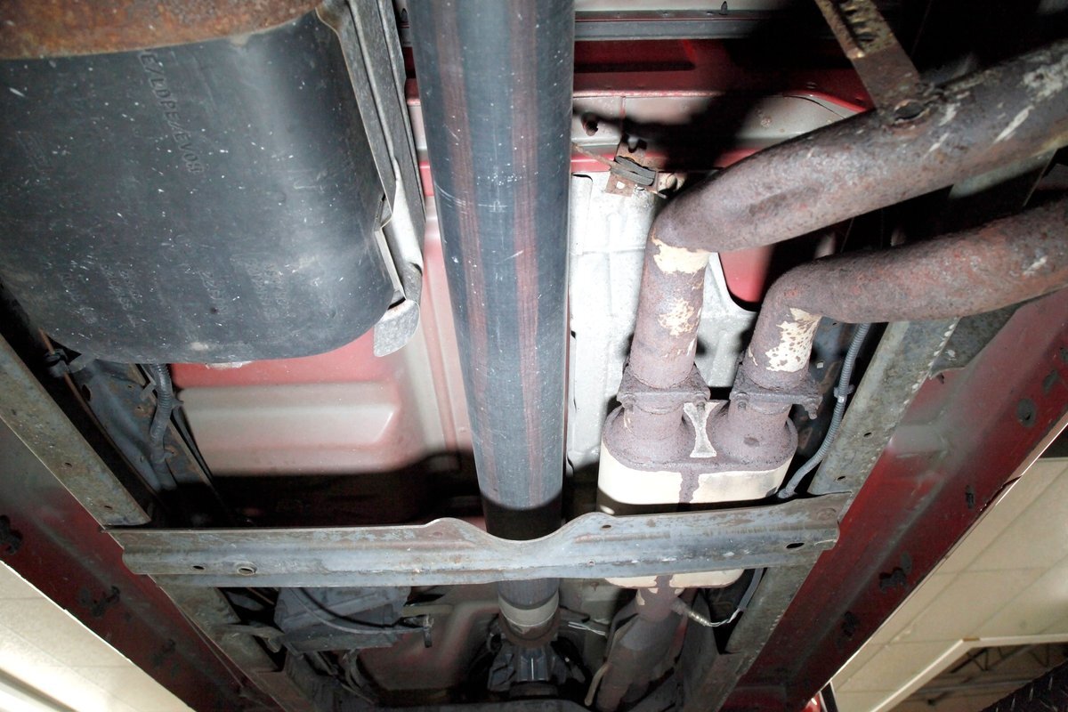 Peering underneath we see some light surface rust covering the usual suspects, but all solid and structurally sound. Power disc brakes are on front, and power drums for the rear, and a Flowmaster exhaust sans the catalytic converter is now installed. Remember these side exit pipes gives this truck a nice roar. Providing the ride is an independent front suspension with coil springs and in back leaf springs.
