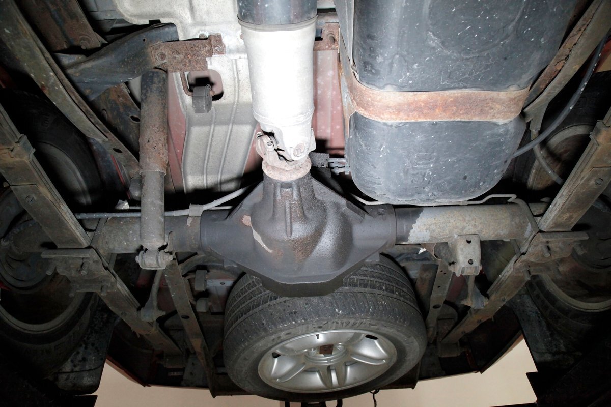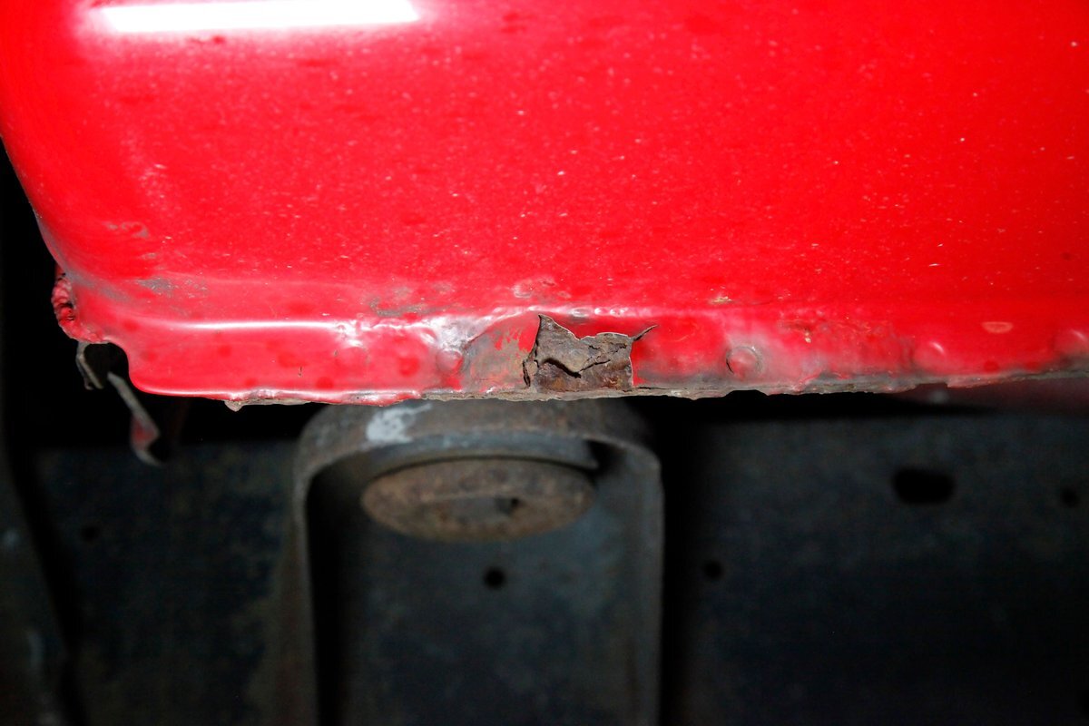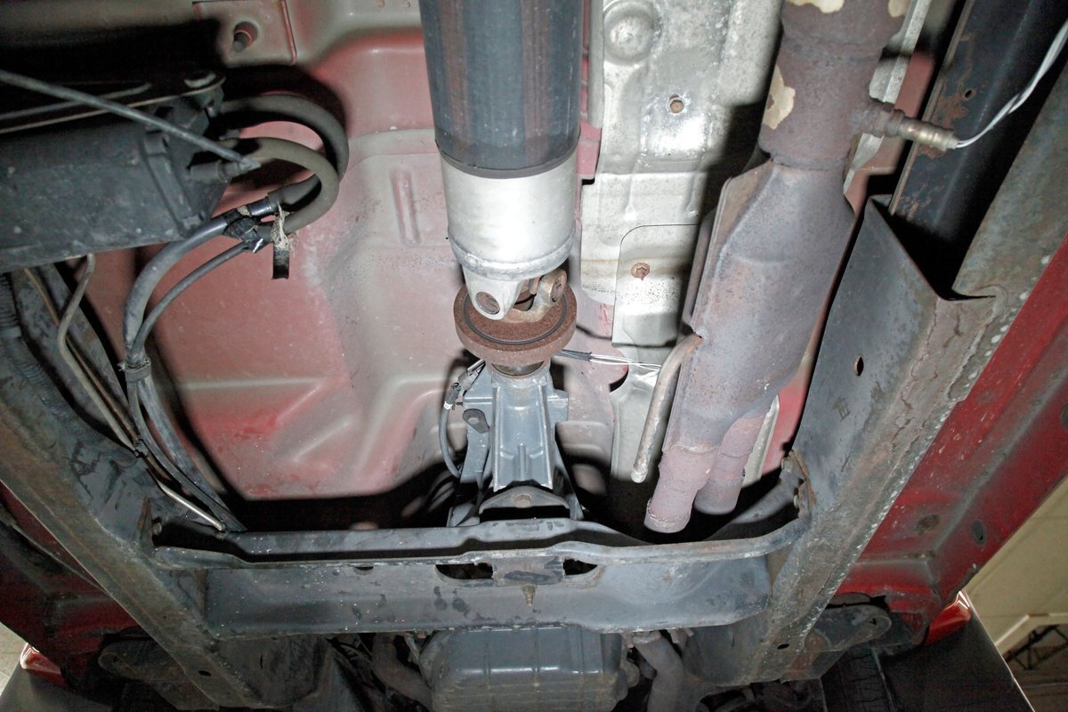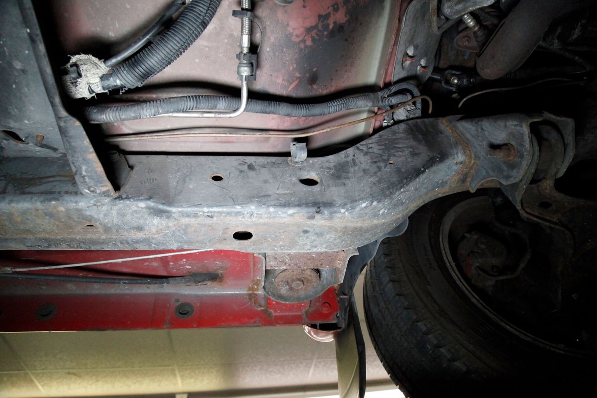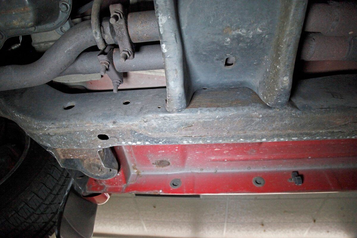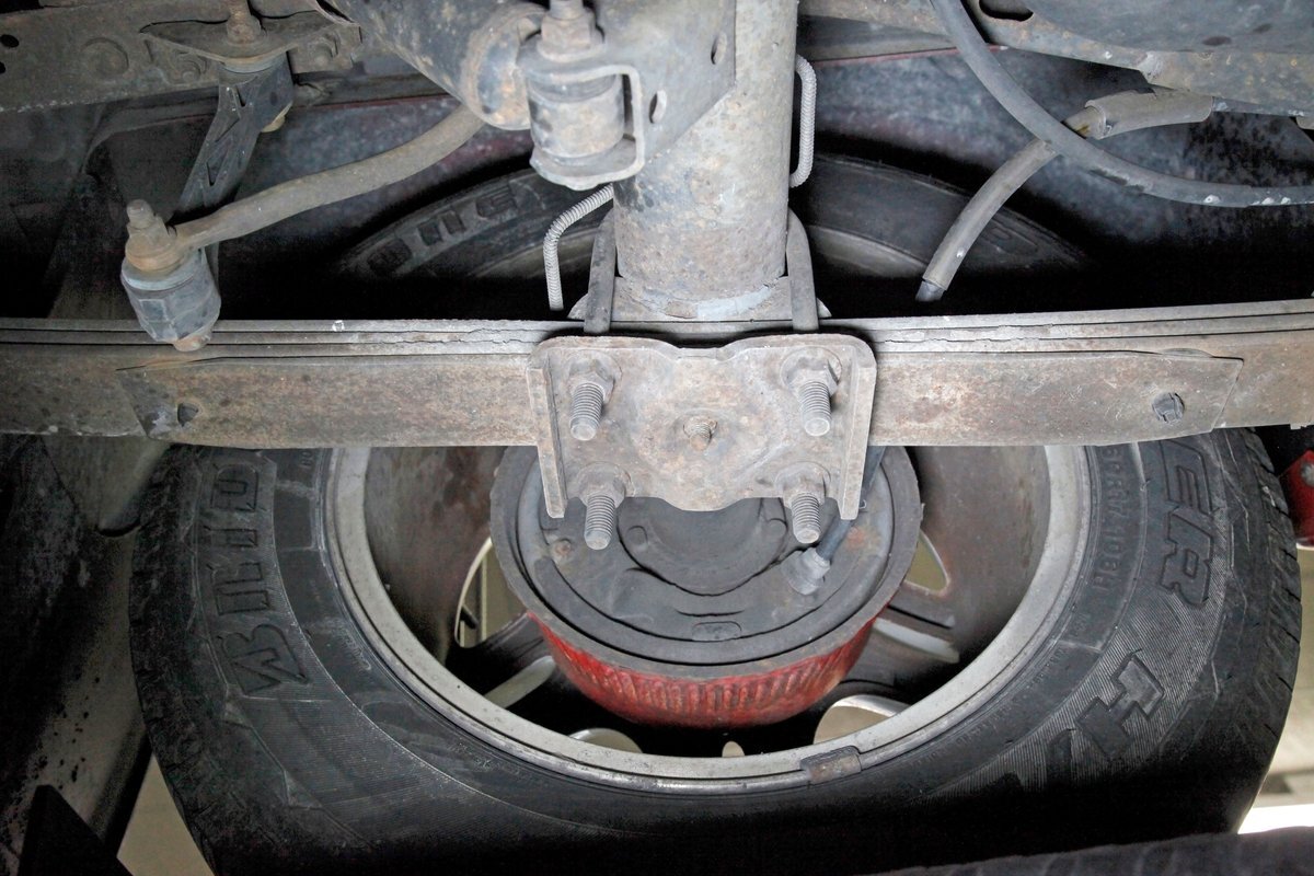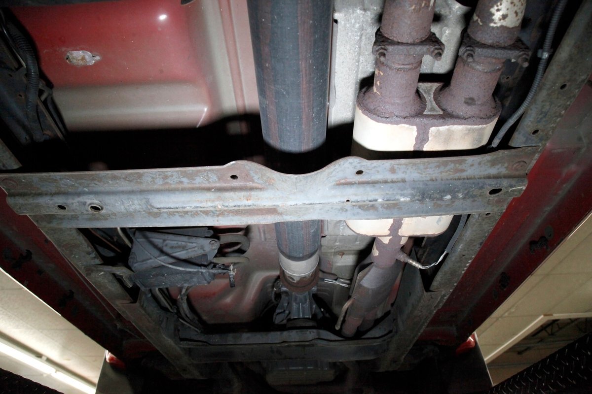 Peering underneath we see some light surface rust covering the usual suspects, but all solid and structurally sound. Power disc brakes are on front, and power drums for the rear, and a Flowmaster exhaust sans the catalytic converter is now installed. Remember these side exit pipes gives this truck a nice roar. Providing the ride is an independent front suspension with coil springs and in back leaf springs.