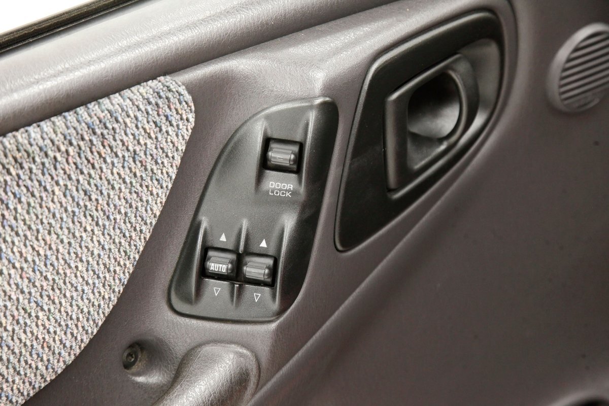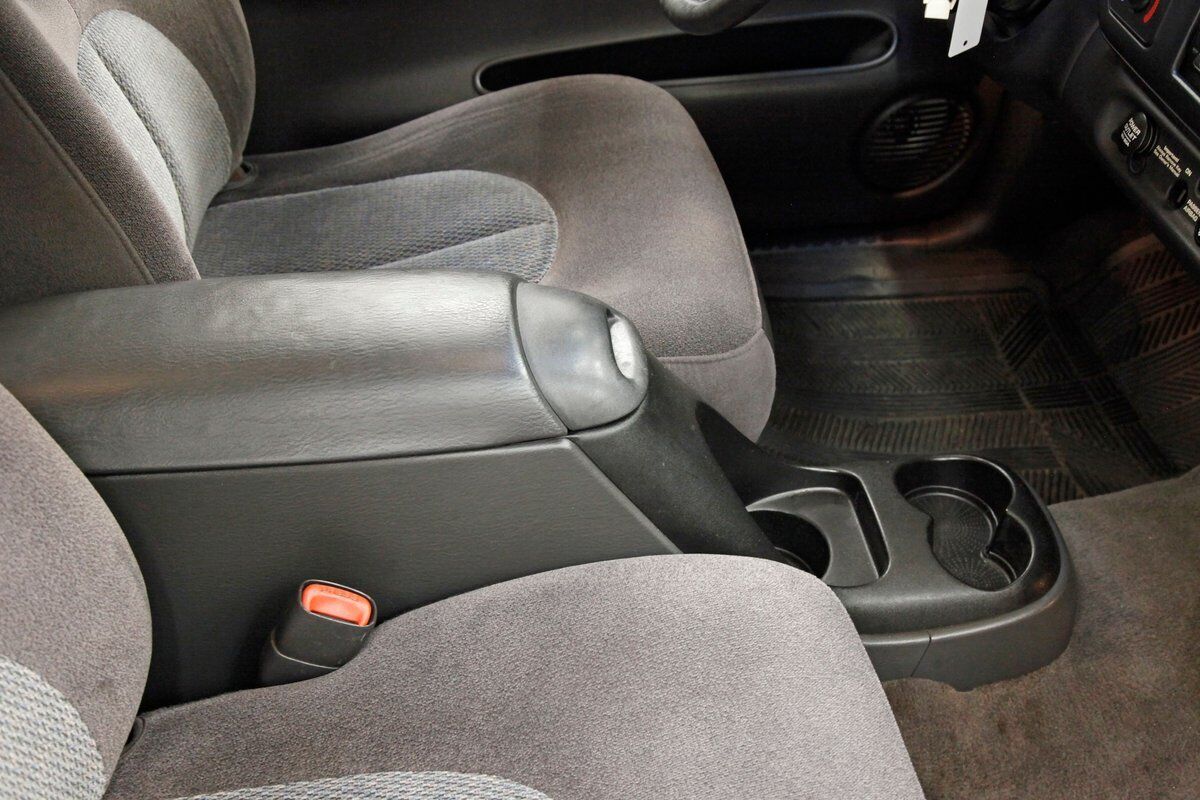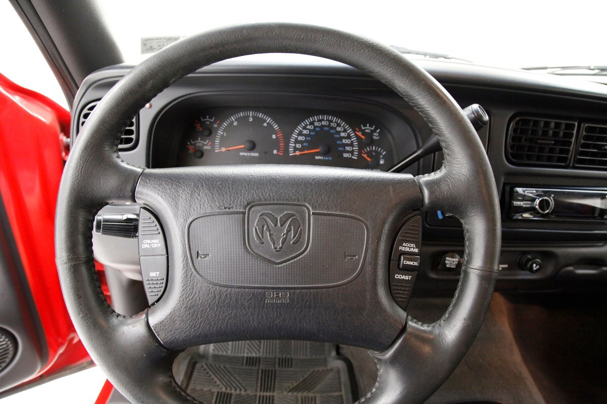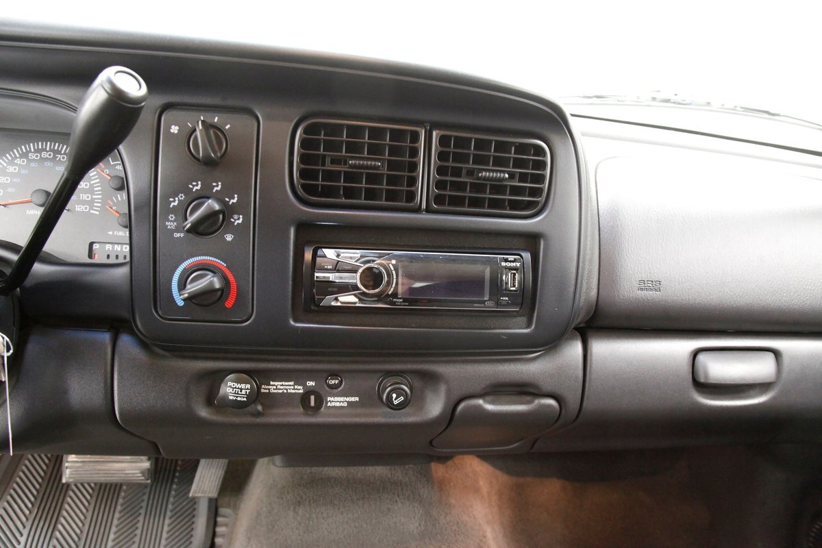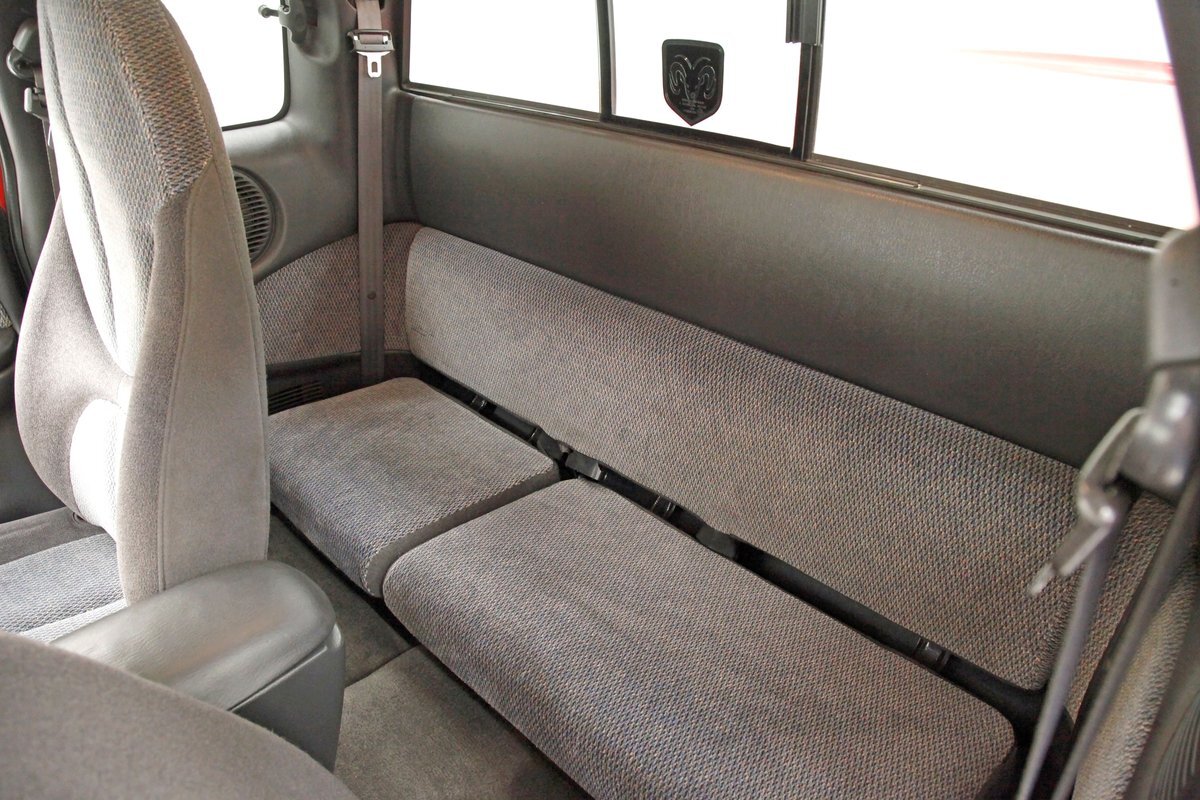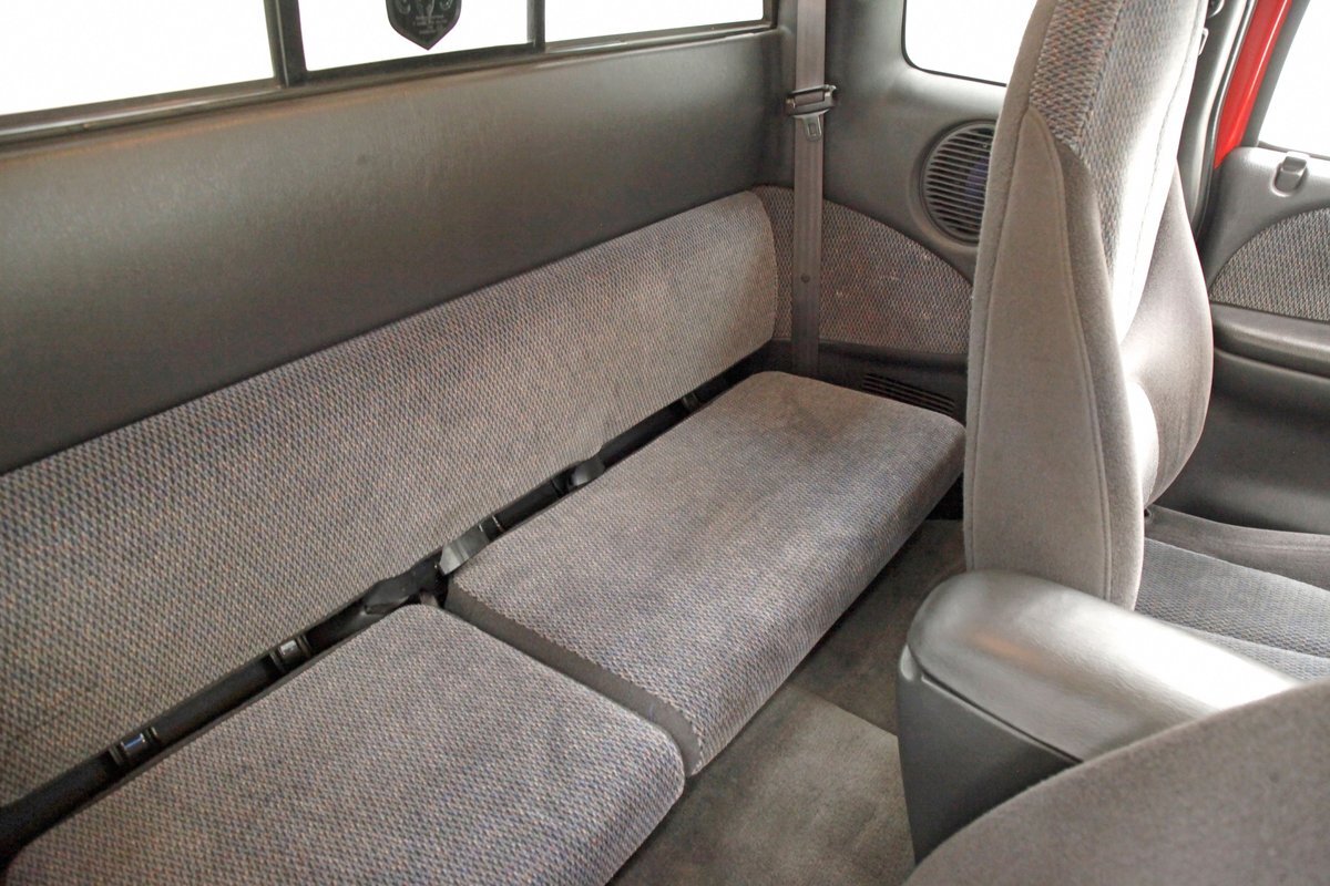 Clean gray cloth covers the stylish high buckle oval designed buckets and some of the door panels. An original charcoal gray dash is up front, and a leather wrapped steering wheel is in front of the dash with a Ram branded airbag in the center. The door panels are mostly clean, have some added plastic for their coverings in addition to the broadcloth, and we see power windows and locks. Filling out the dash are the factory circular sweep instruments along with the dials for the heater and working AC along with an aftermarket Sony AM/FM/CD stereo. It is a digital version with a USB input. Clean gray carpet is reserved for the floors and a fuzzy light gray headliner with a working courtesy light is above. Peering in the back, we see a simple broadcloth bench for extra passenger carrying.