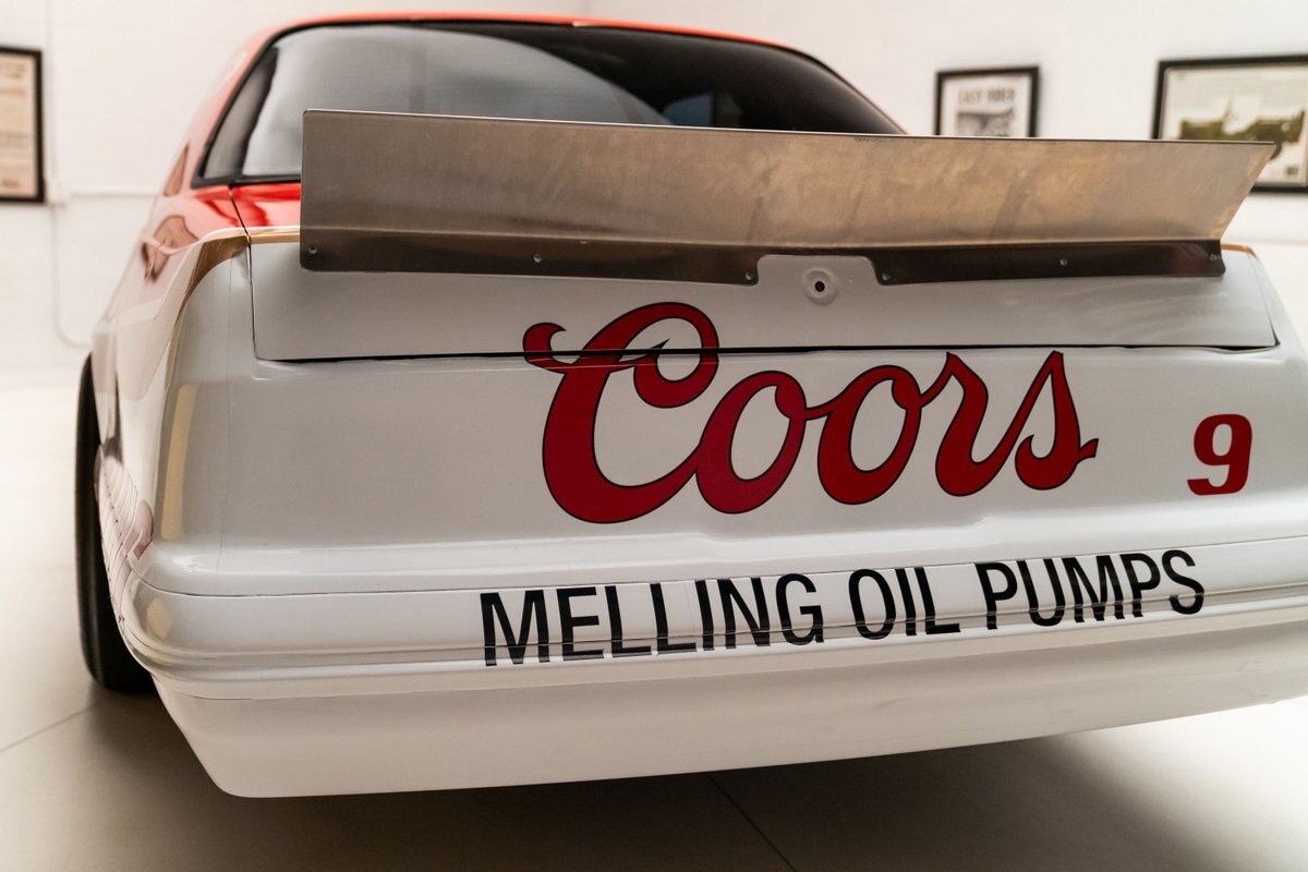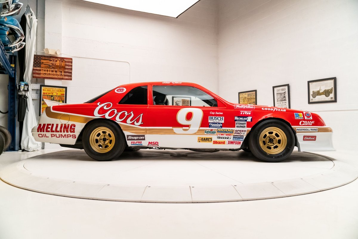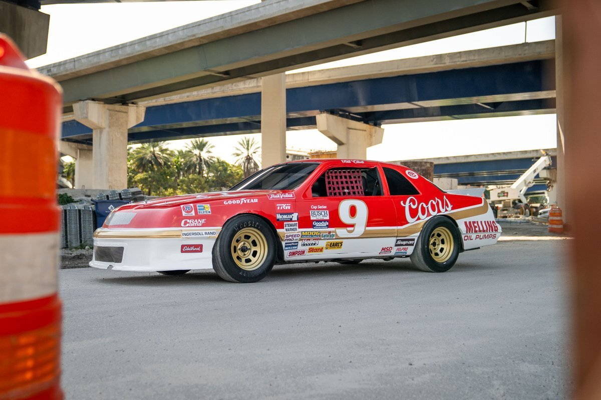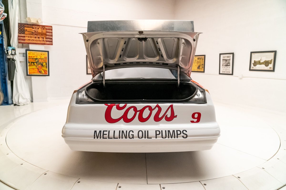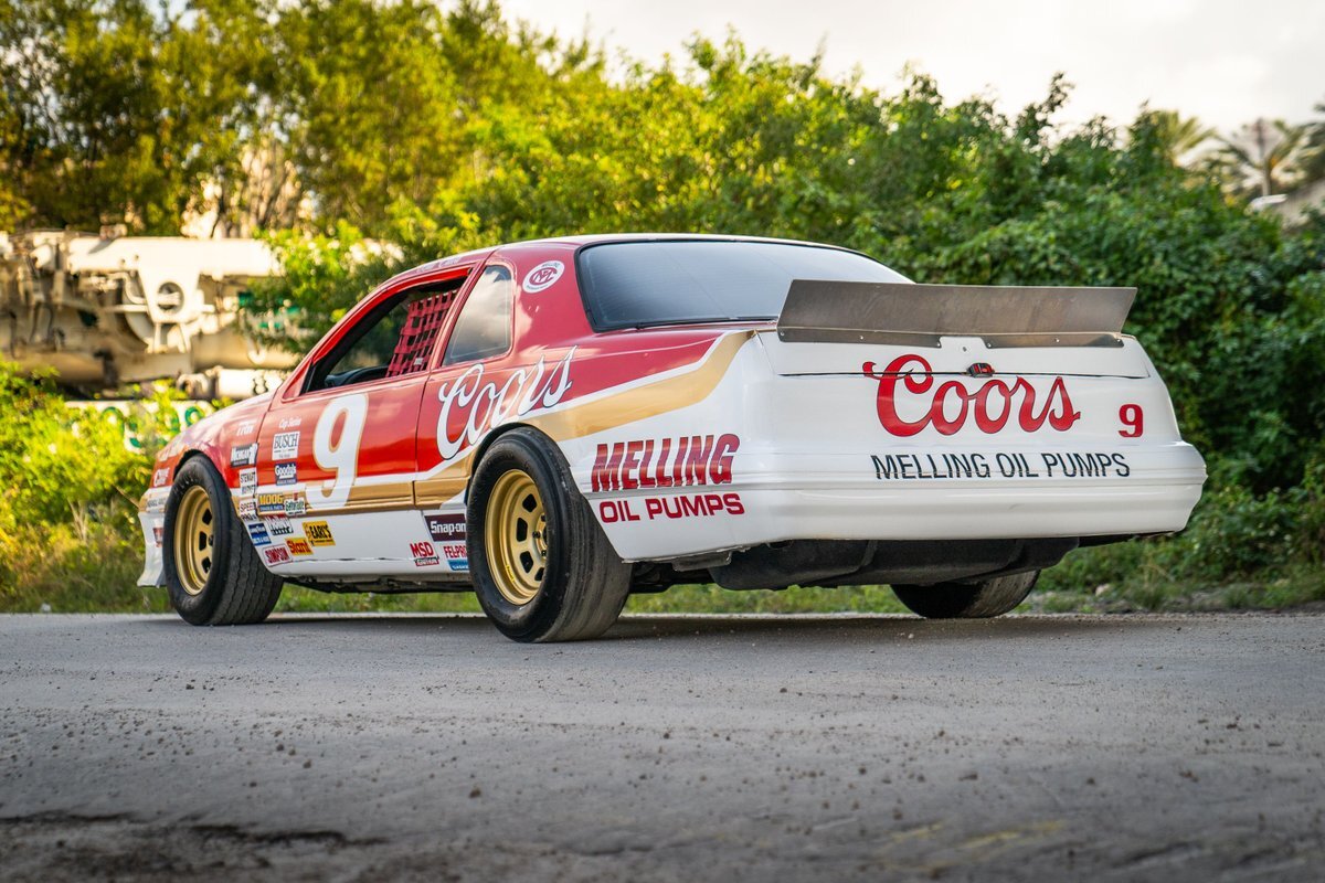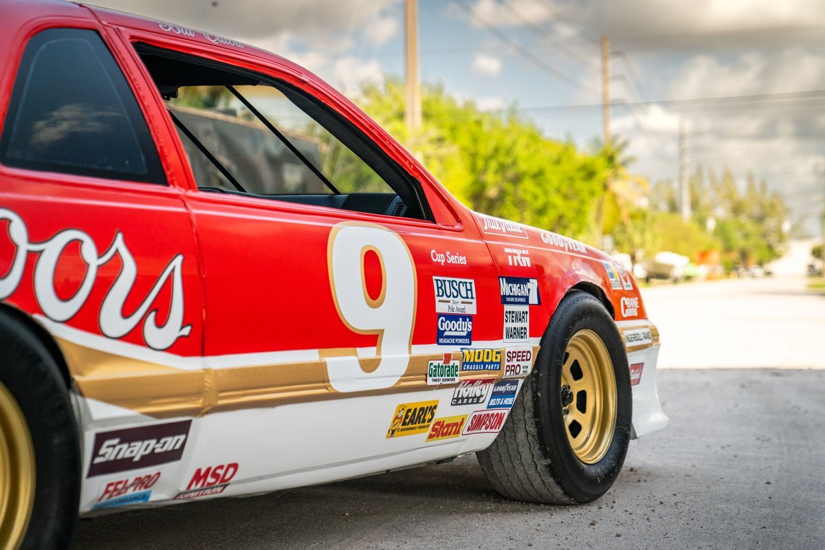 Finished in Silver Clearcoat Metallic (9Z), the car has been wrapped in a replica of Bill Elliott's 1988 Melling Racing #9 Coors livery that was used during his Winston Cup championship season. The side mirrors have been removed, and lighting components are not visible. A rear spoiler and front air dam have been added, with the latter item showing damage. The fenders have been cut to clear the tires, and the windows have been tinted.
