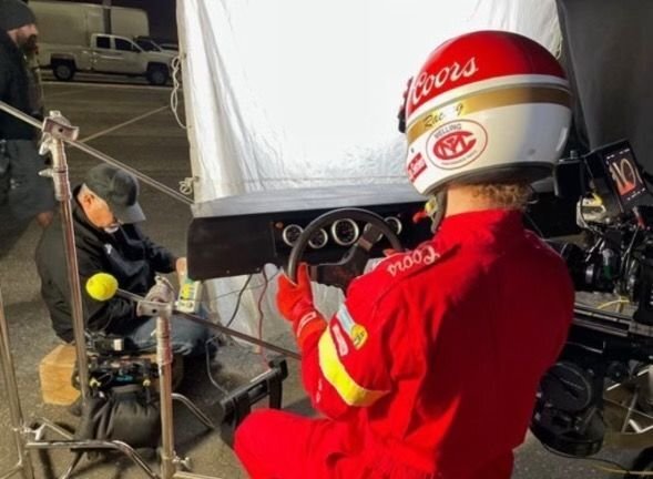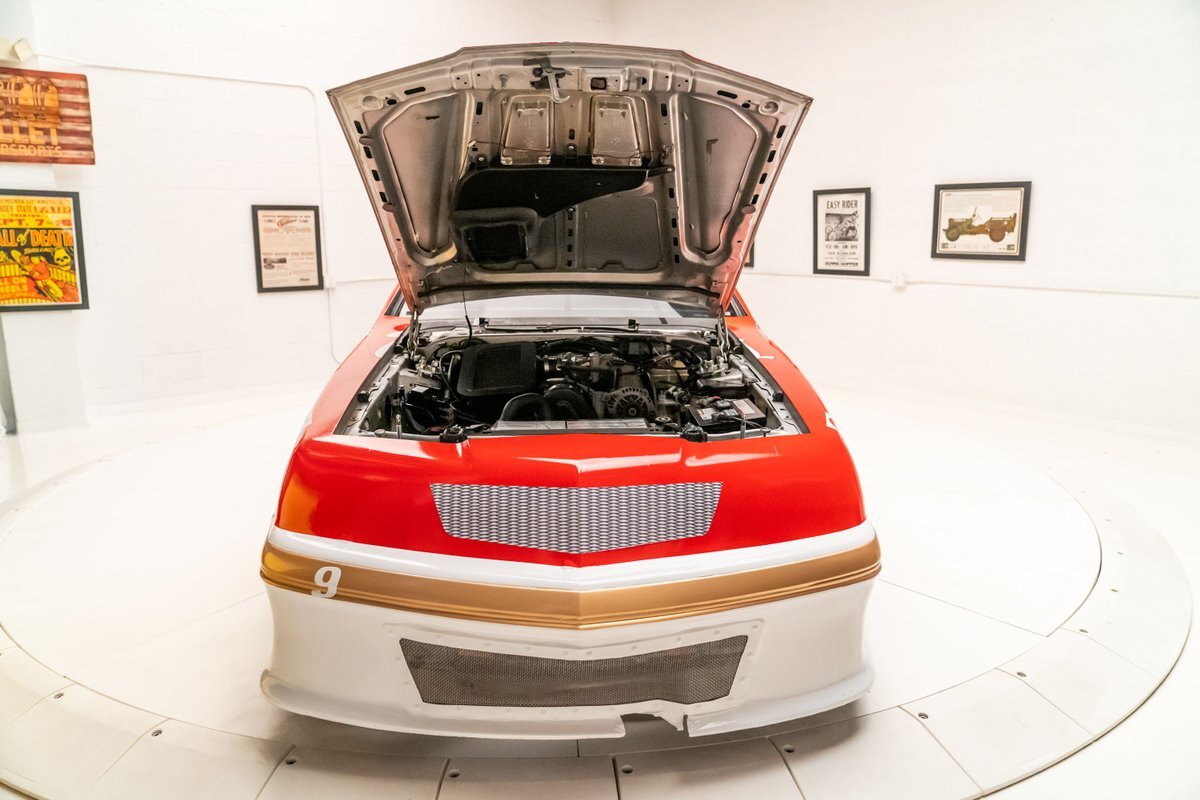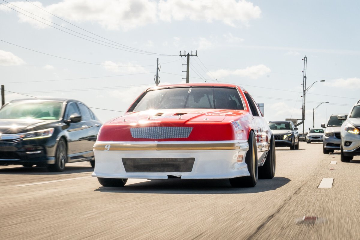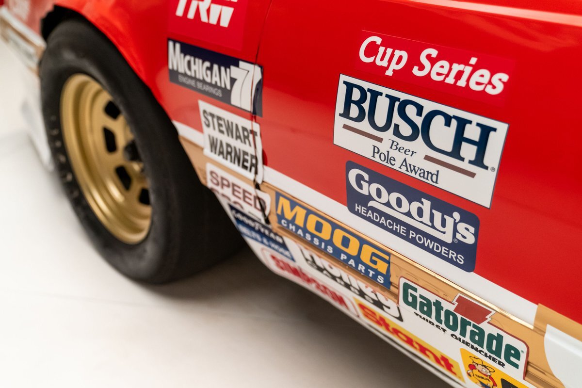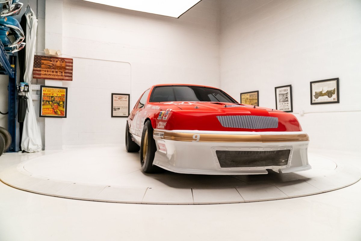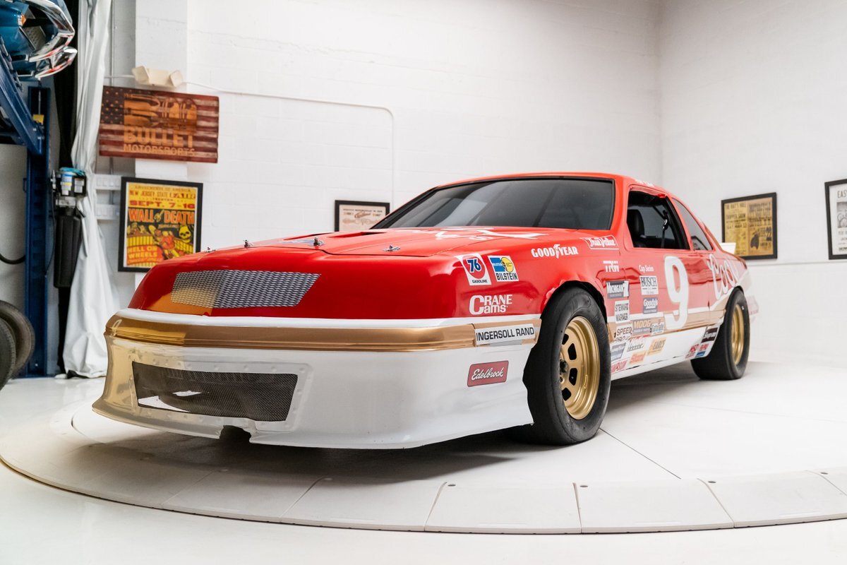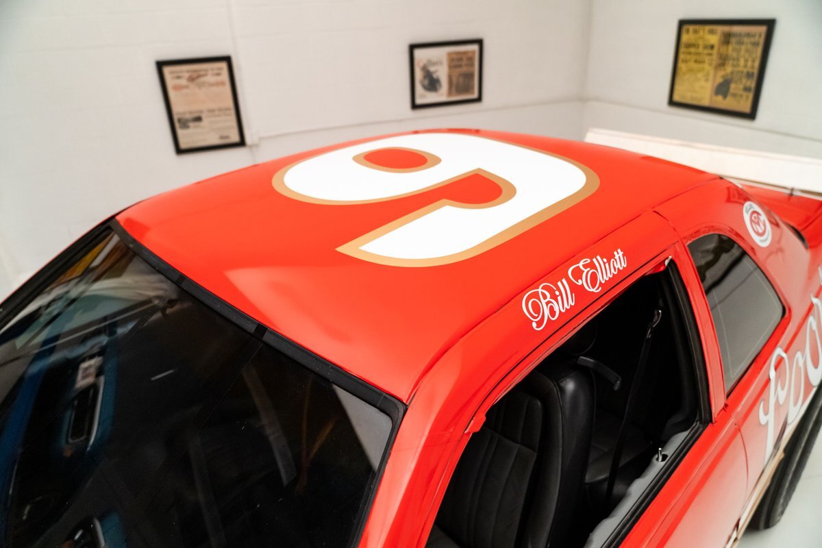 Finished in Silver Clearcoat Metallic (9Z), the car has been wrapped in a replica of Bill Elliott's 1988 Melling Racing #9 Coors livery that was used during his Winston Cup championship season. The side mirrors have been removed, and lighting components are not visible. A rear spoiler and front air dam have been added, with the latter item showing damage. The fenders have been cut to clear the tires, and the windows have been tinted.