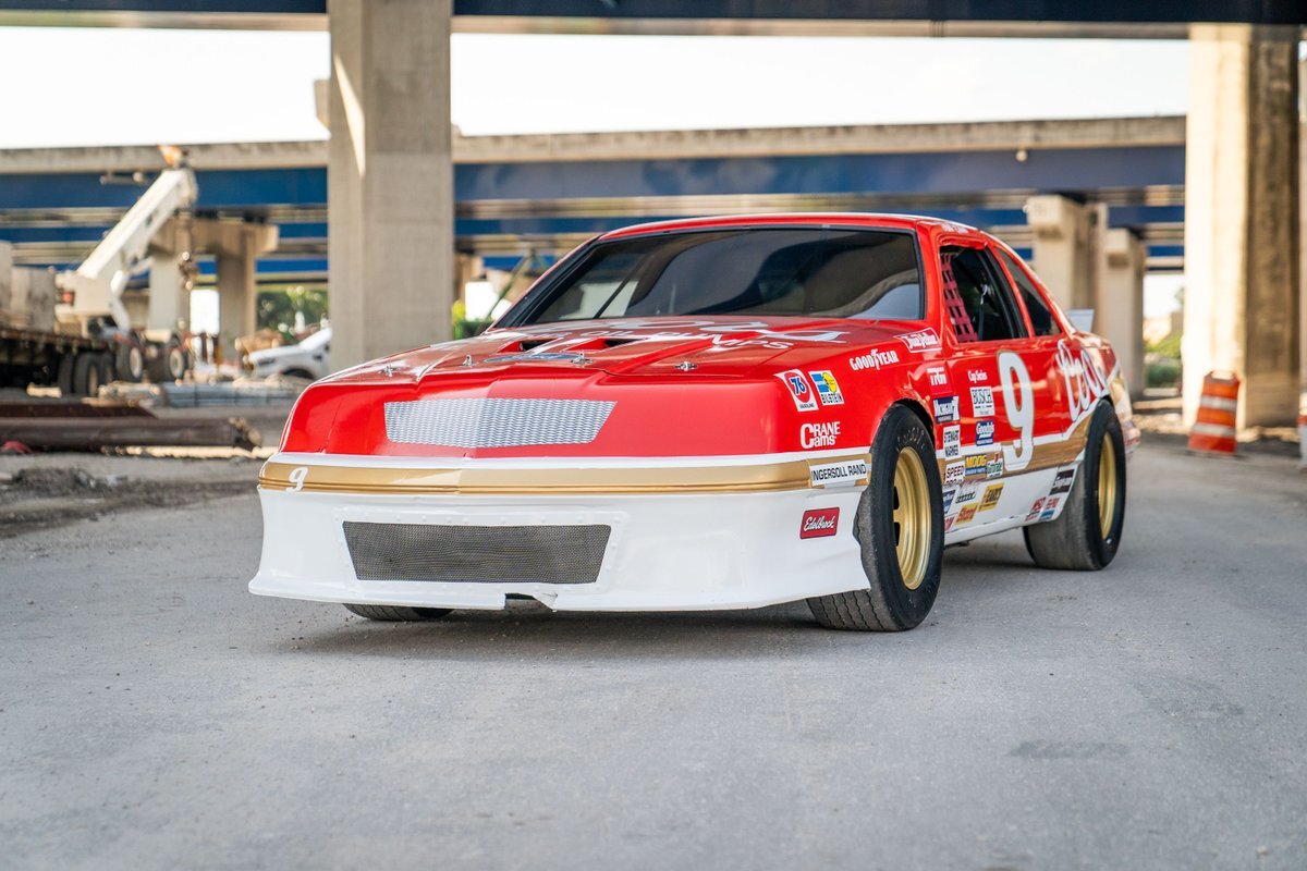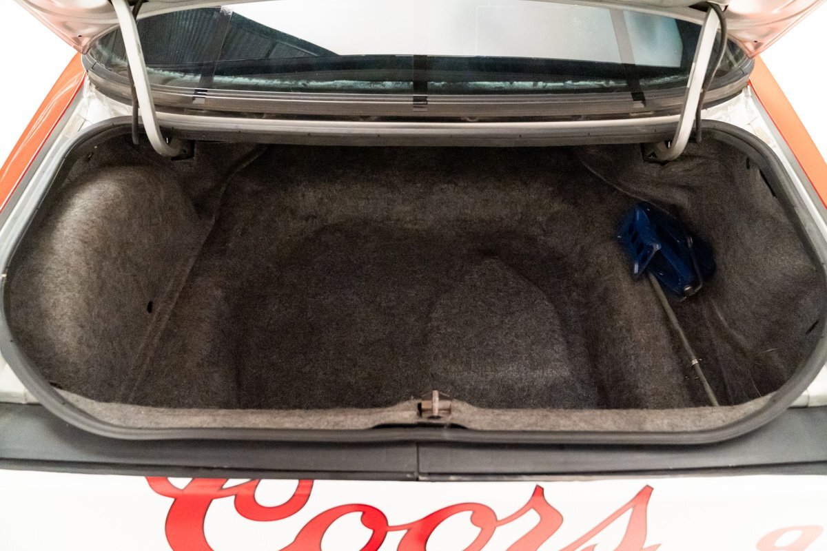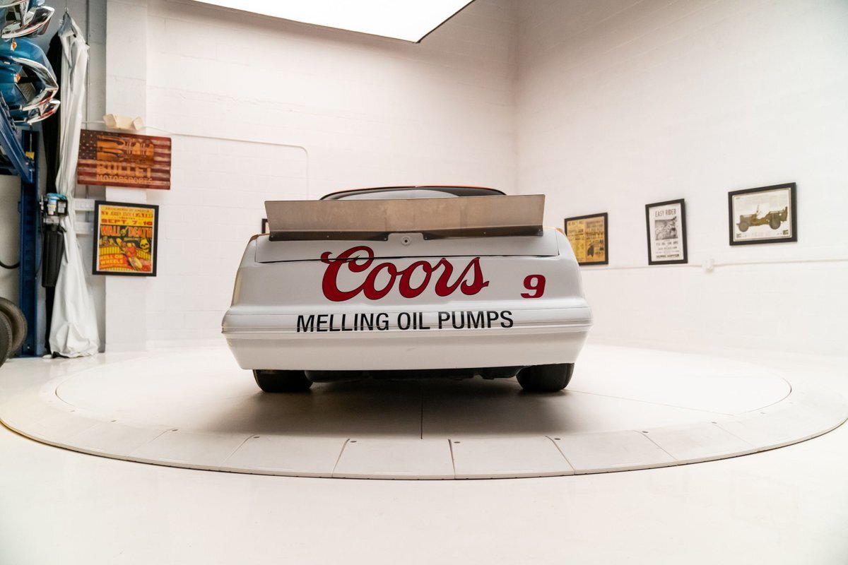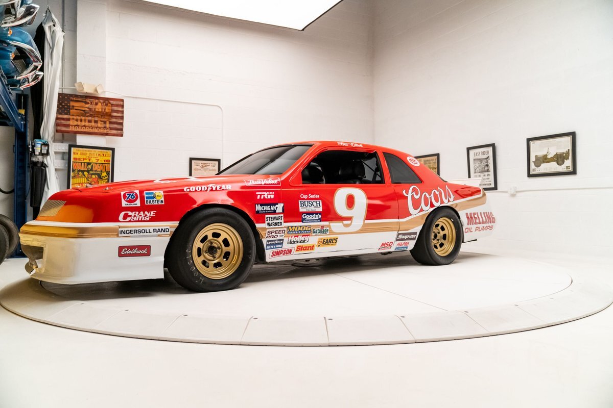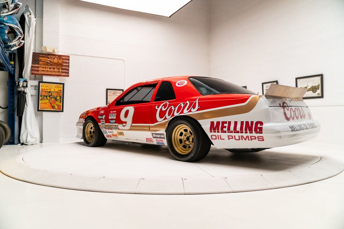 This 1988 Ford Thunderbird Turbo Coupe was modified under prior ownership in the style of Bill Elliott's 1988 NASCAR Winston Cup Championship-winning race car. It was then used in a NASCAR commercial prior to ourr acquisition. Finished in silver under a Coors livery wrap, the car retains much of its Medium Gray leather street car interior sans door panels and has been fitted with a window net, a rear spoiler, a front air dam, coilover suspension, and gold 15" Bassett wheels with racing slicks. It is powered by a turbocharged 2.3-liter inline-four mated with a five-speed manual transmission and a Traction-Lok limited-slip differential, and additional equipment includes tinted windows, a Grant steering wheel, electronic climate control, and a cassette stereo with a graphic equalizer. This modified Turbo Coupe shows 174k miles and is now offered for off-road use only with service records and a bill of sale.