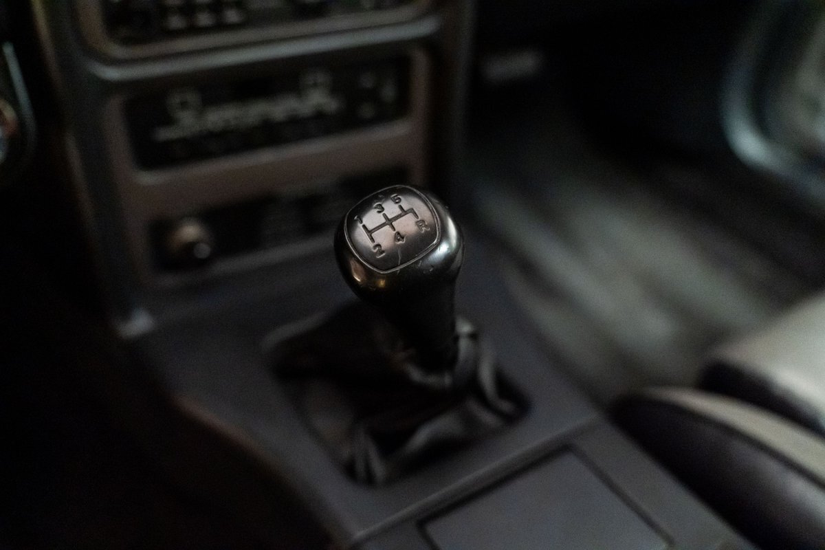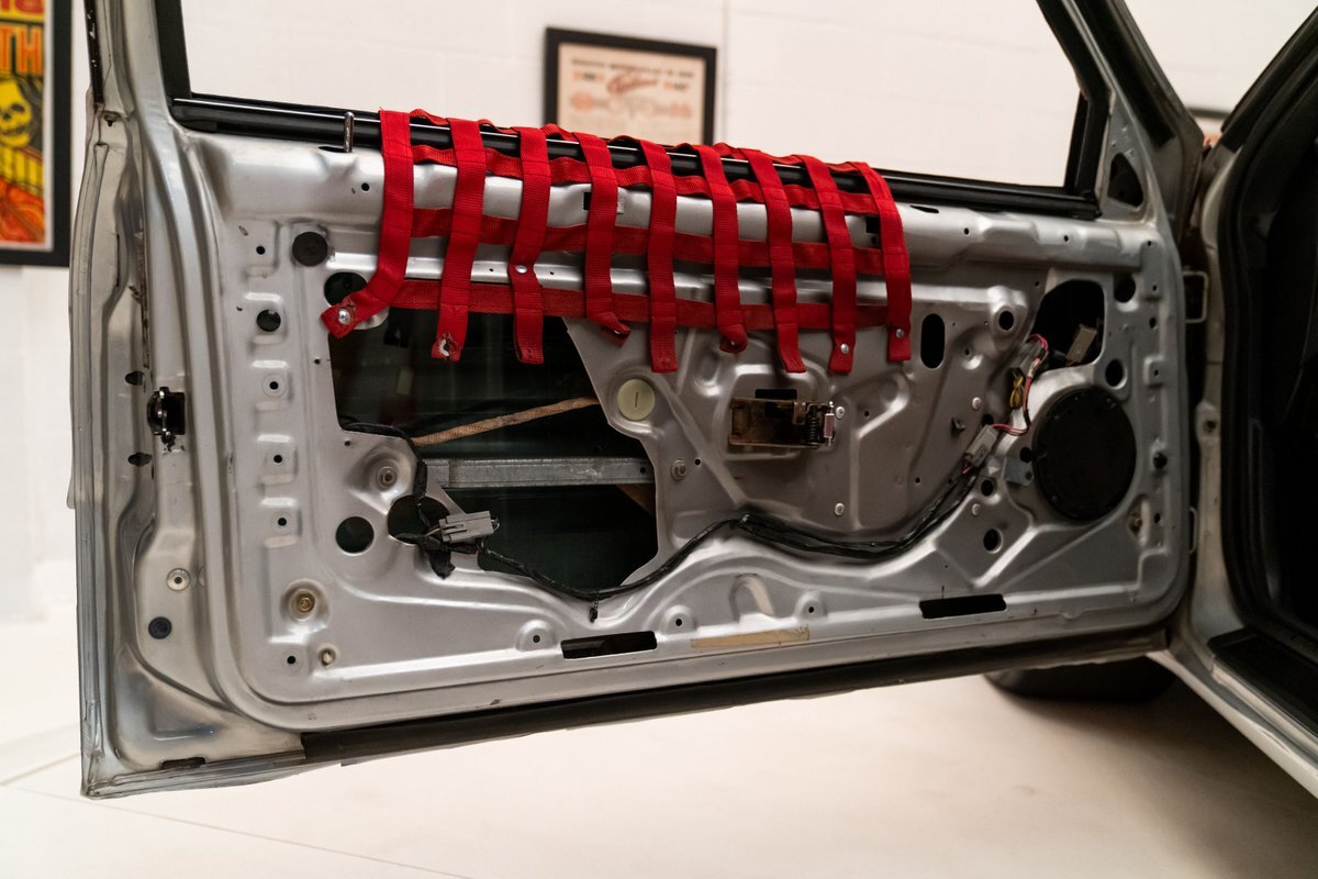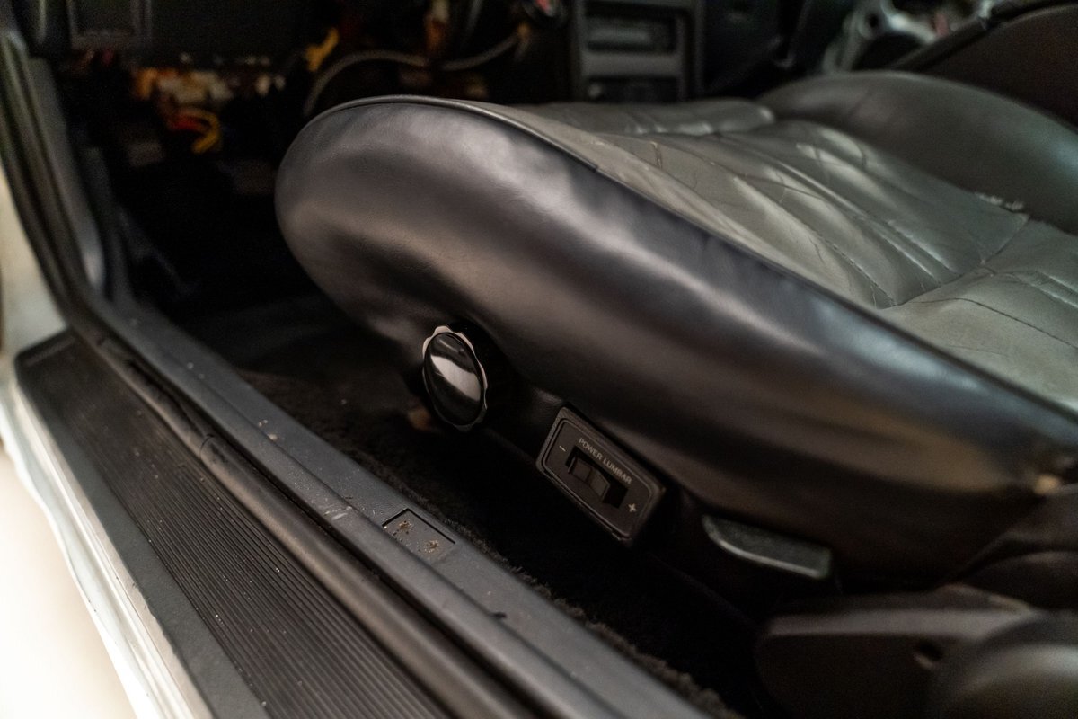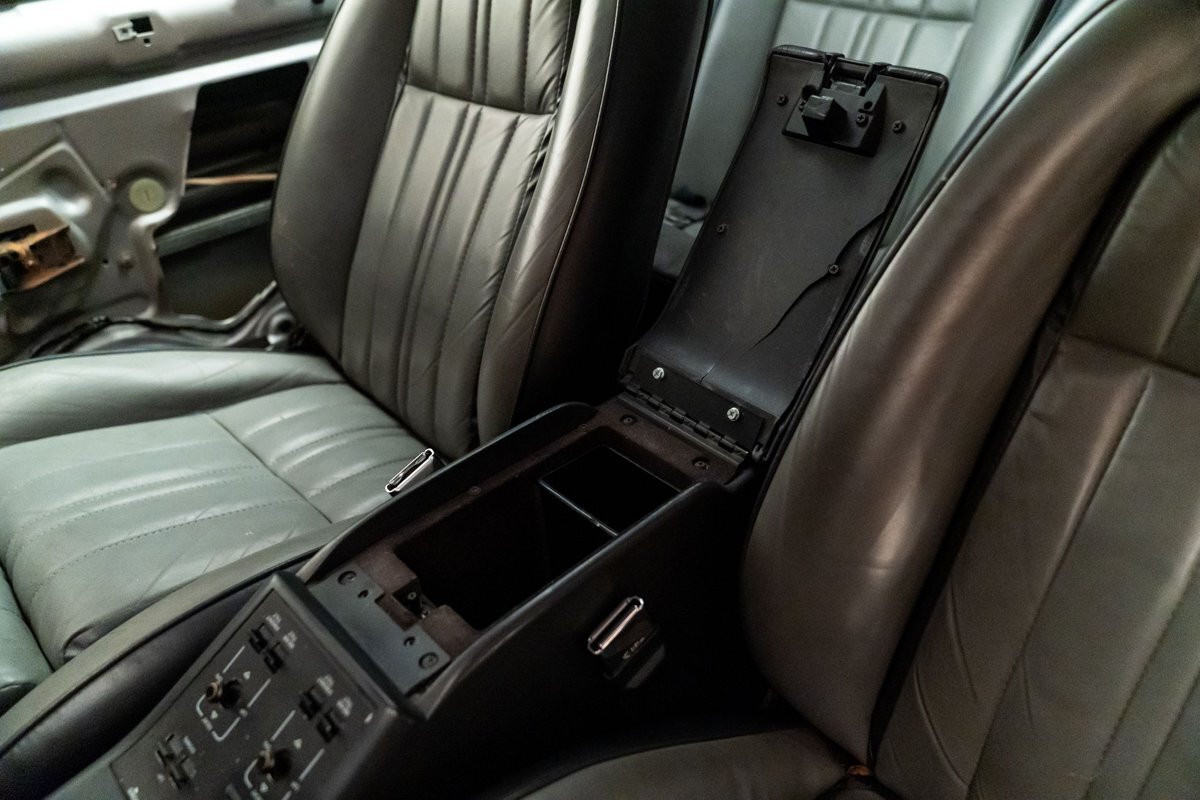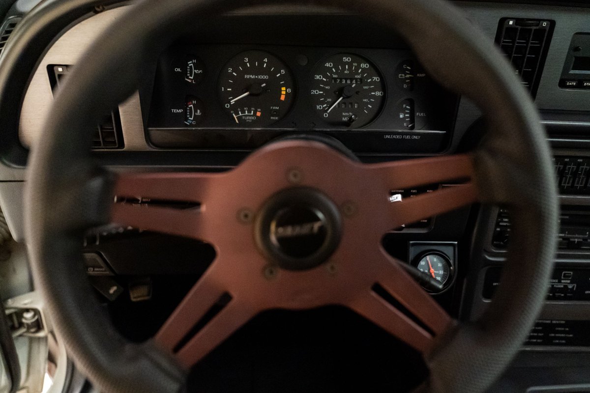 The interior retains front and rear seats upholstered in Medium Gray leather, while the door panels have been removed. Other factory equipment includes air conditioning, power lumbar support for the driver, and a cassette stereo with a graphic equalizer. The Grant steering wheel fronts a 95-mph speedometer, a tachometer, and auxiliary gauges for oil pressure, coolant temperature, amperage, and fuel level. The six-digit odometer shows 174k miles, a Bosch boost pressure gauge has been added beneath the dash.