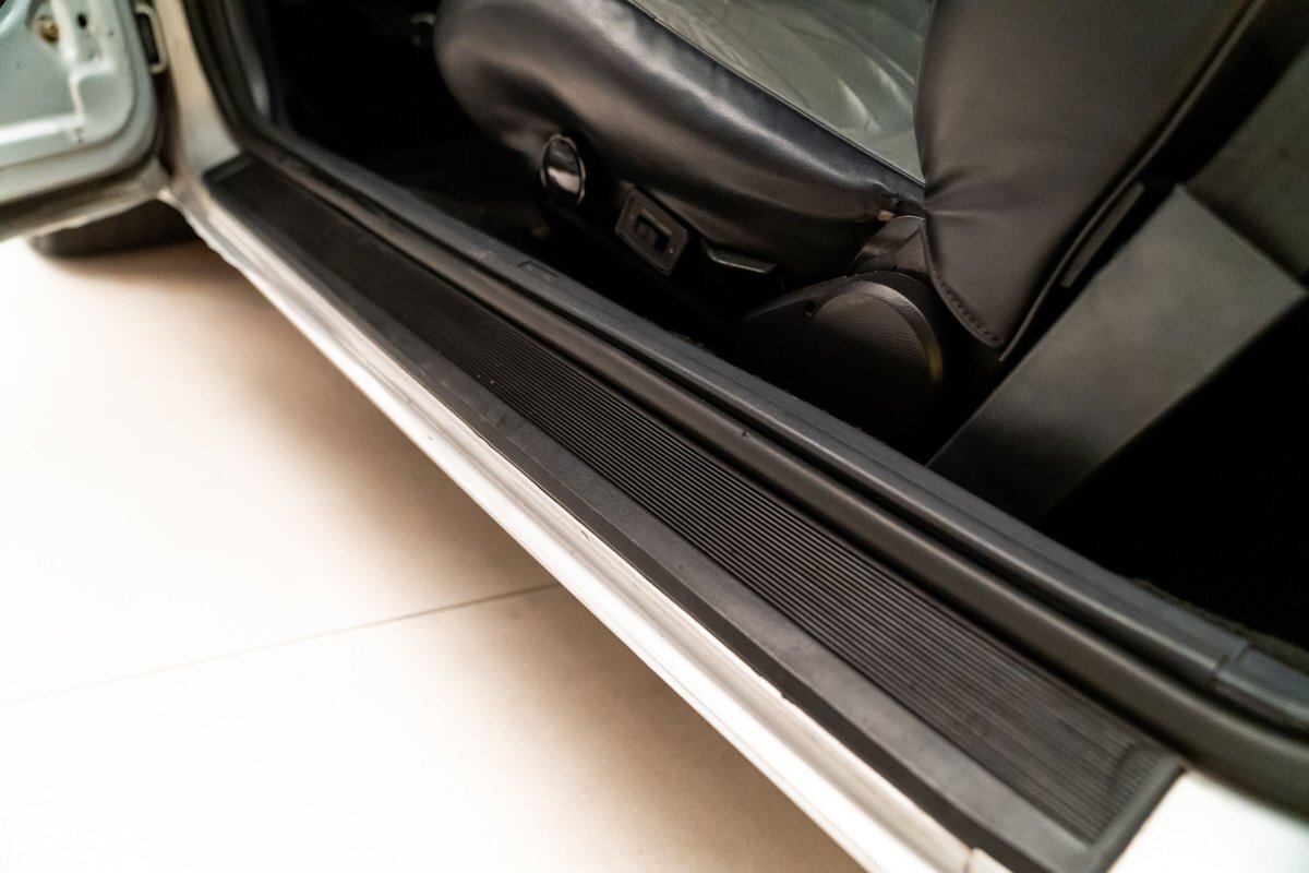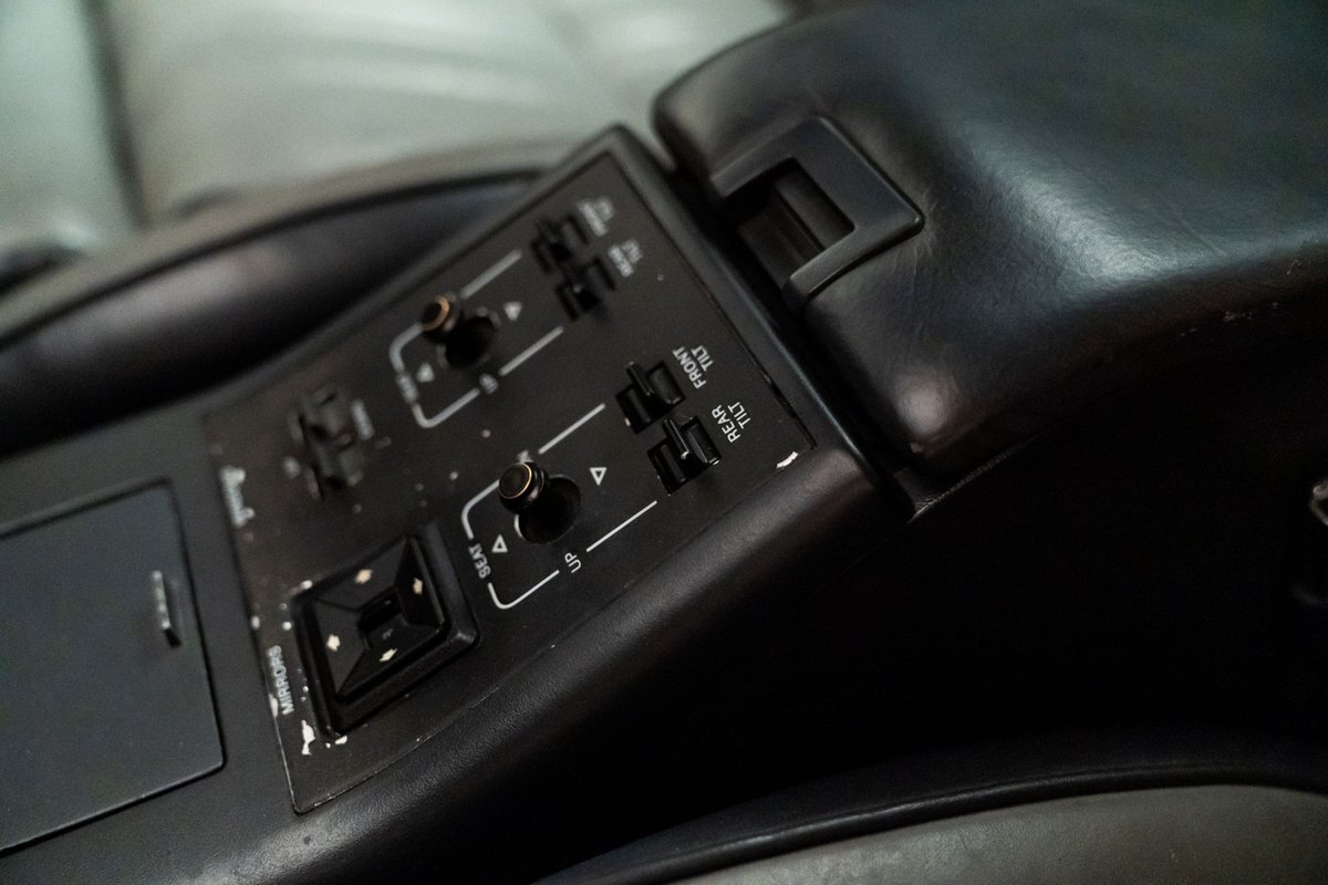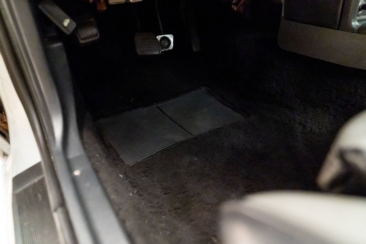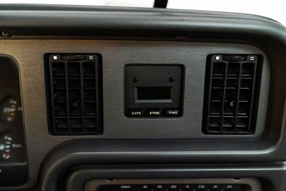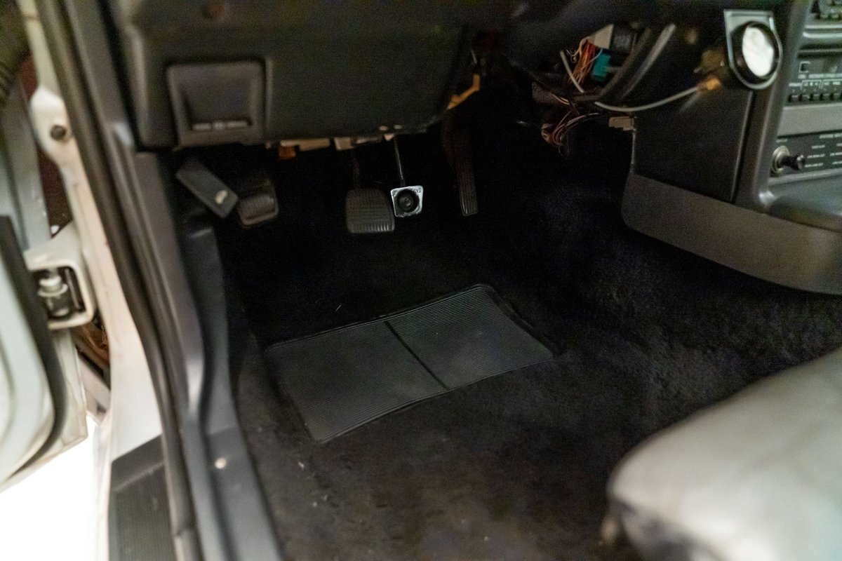The interior retains front and rear seats upholstered in Medium Gray leather, while the door panels have been removed. Other factory equipment includes air conditioning, power lumbar support for the driver, and a cassette stereo with a graphic equalizer. The Grant steering wheel fronts a 95-mph speedometer, a tachometer, and auxiliary gauges for oil pressure, coolant temperature, amperage, and fuel level. The six-digit odometer shows 174k miles, a Bosch boost pressure gauge has been added beneath the dash.