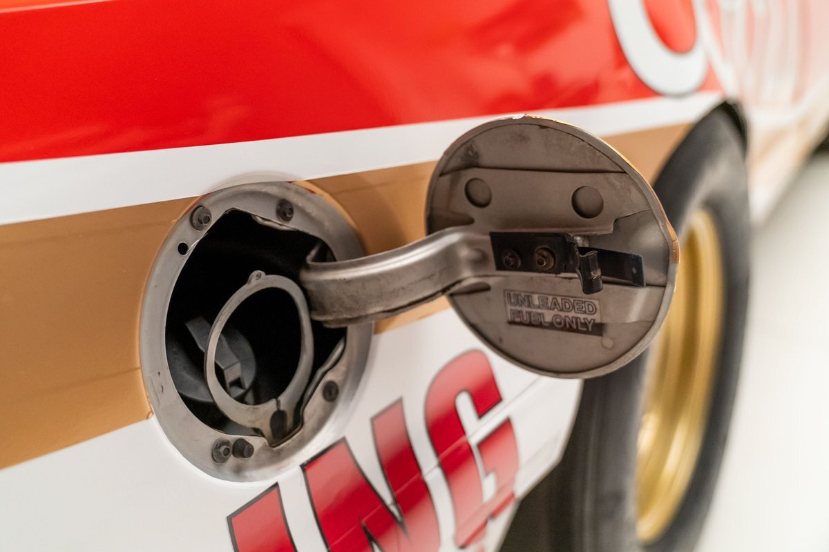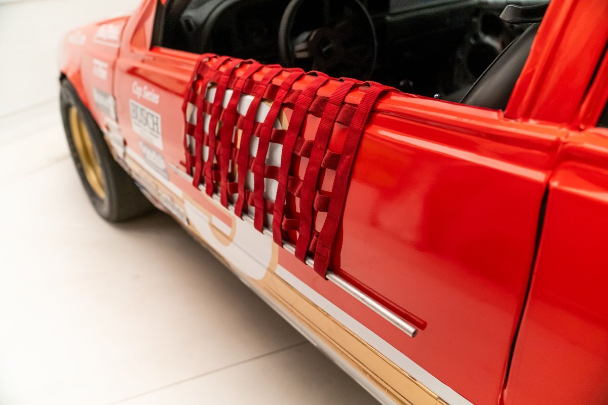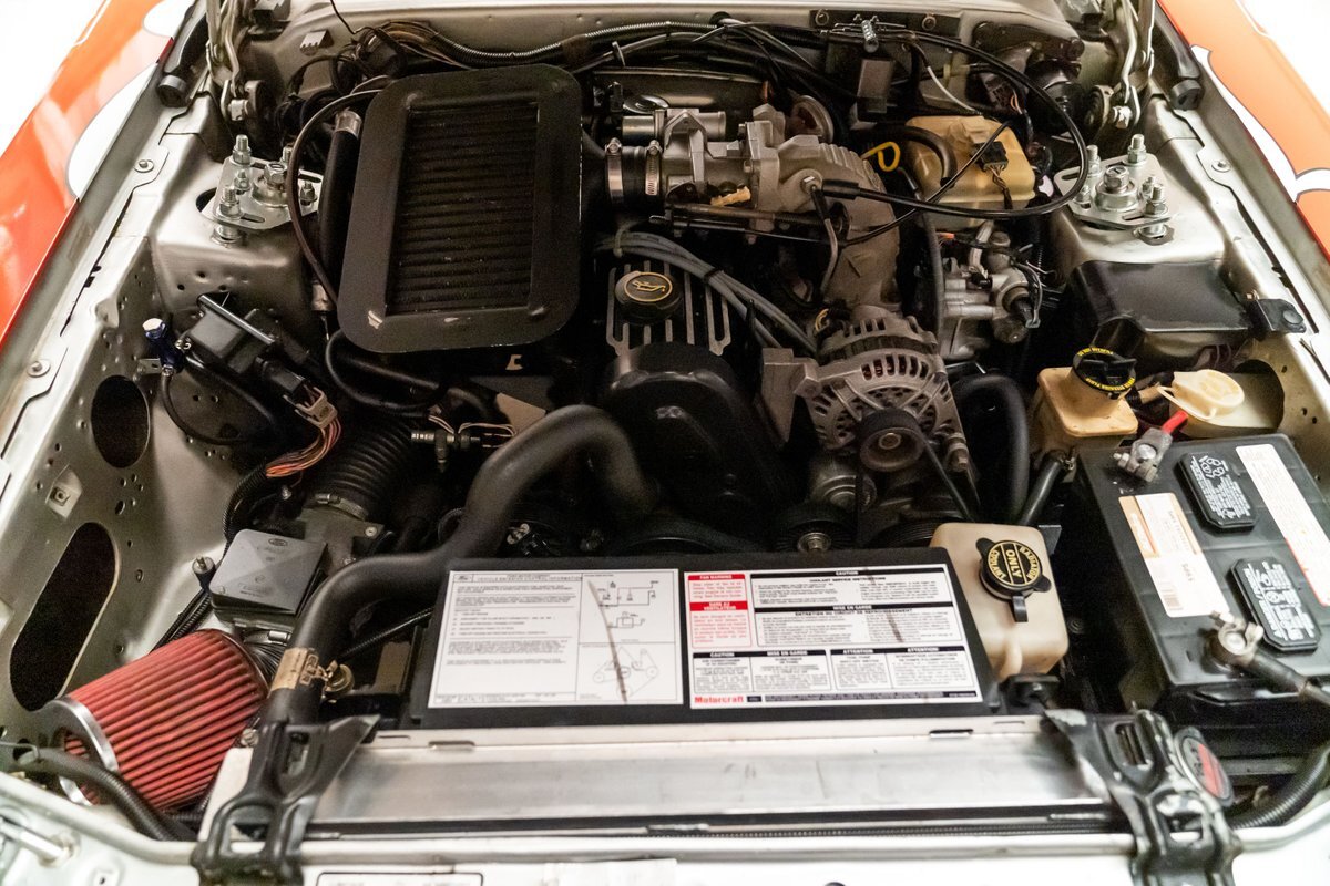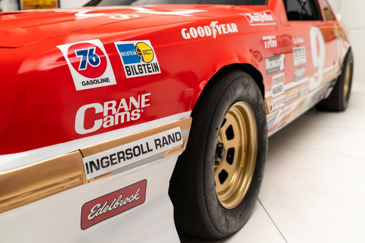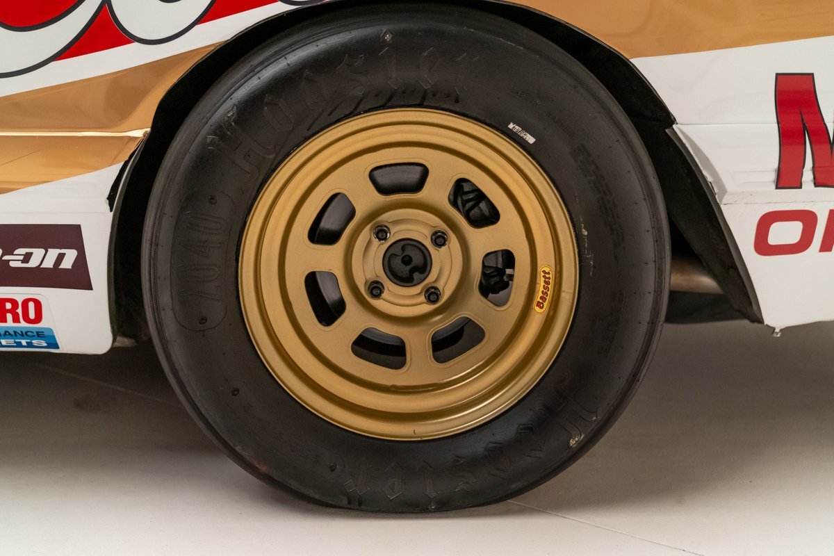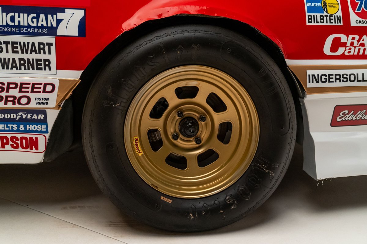 The turbocharged 2.3-liter inline-four was factory rated at 190 horsepower when paired with a five-speed manual transmission. A Champion aluminum radiator is fitted. Gold 15" Bassett wheels are mounted with a mix of Goodyear Eagle and Hoosier slick tires, some of which show cracking. Aftermarket adjustable coilovers have been installed along with adjustable camber plates, and braking is from discs all around.