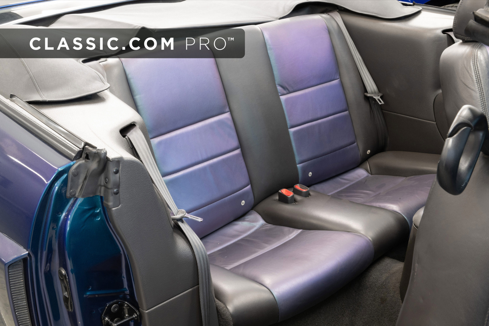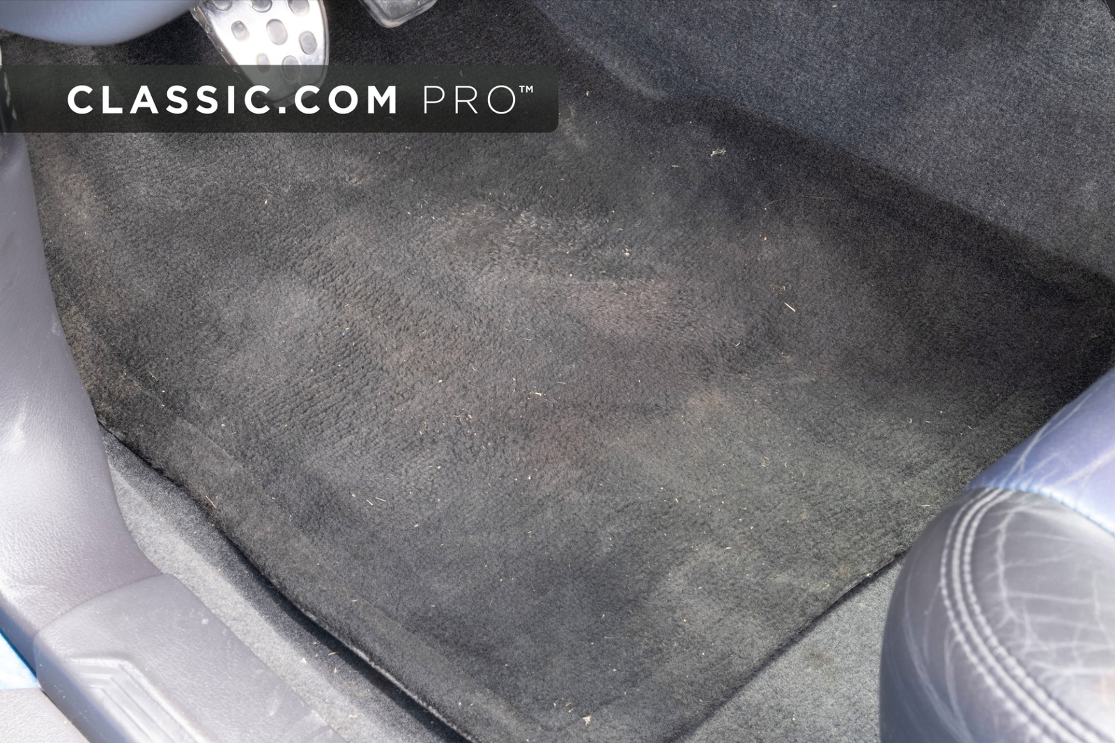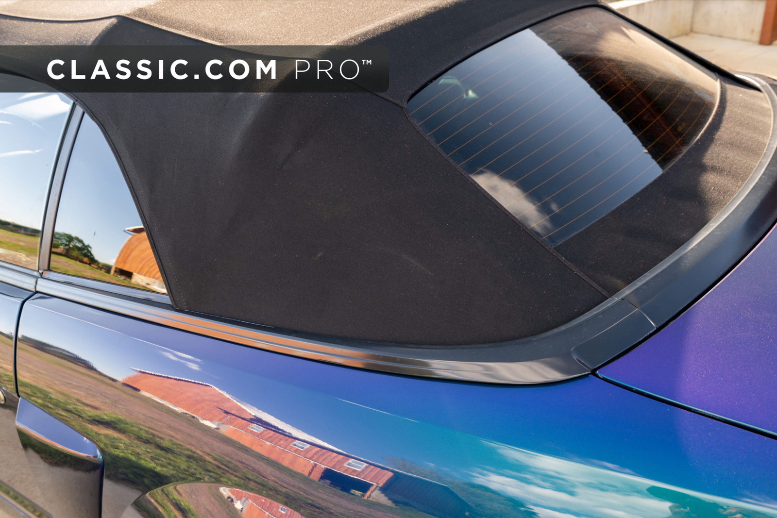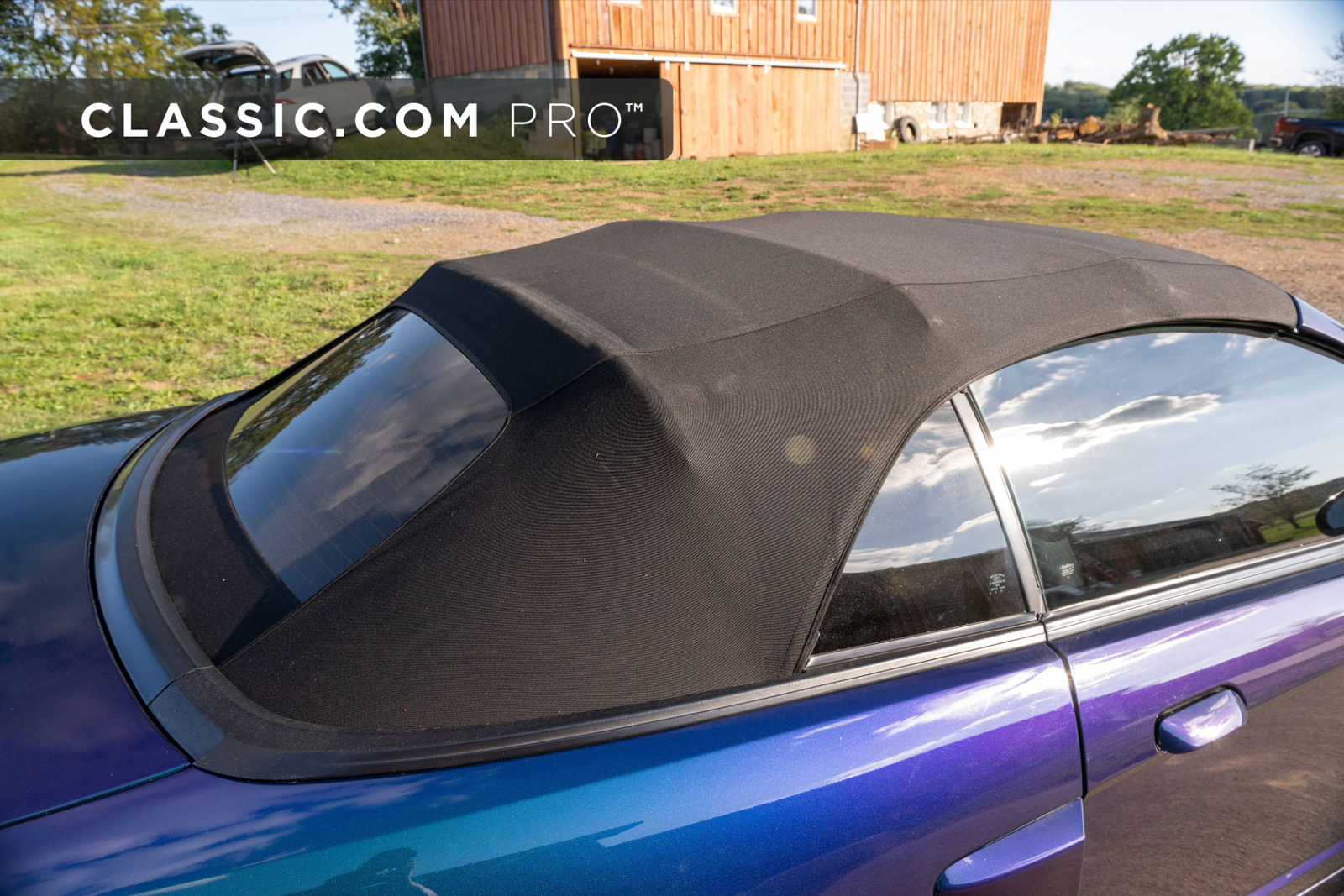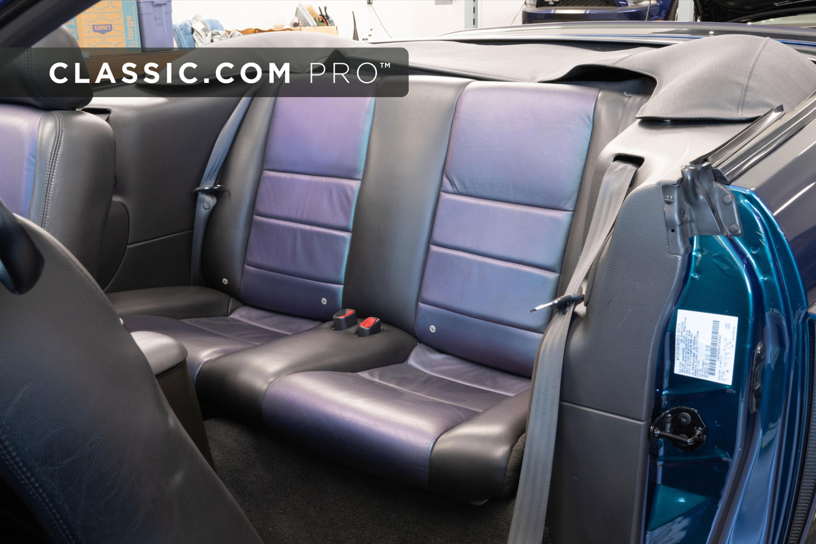 A third-party inspection and detailed photos document the original, low-mileage condition of the vehicle. The exterior paint shows minor paint chips and light scratches that are consistent with the age of the vehicle. There is a small dent on the front bumper that can be seen in the closeup images. The chrome wheels and the black convertible soft-top are found to be free of blemishes. The leather driver's seat shows some creasing and minor wear but the two-tone upholstery is otherwise in good condition. Photos show minor staining of the rear carpet but the vehicle shows light use overall. The accident-free CarFax shows dealership maintenance and an August 2017 entry shows the current mileage indicating the vehicle has been stored for the past six years. Included in the sale are one set of keys, a reproduction window sticker, the original owner's manual, and a wheel lock removal tool.