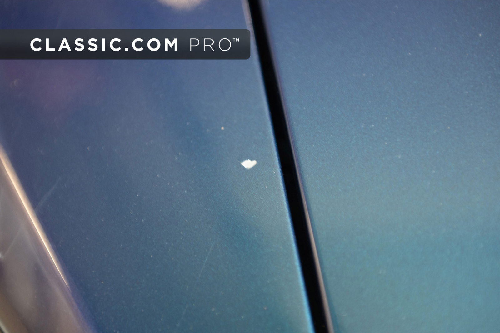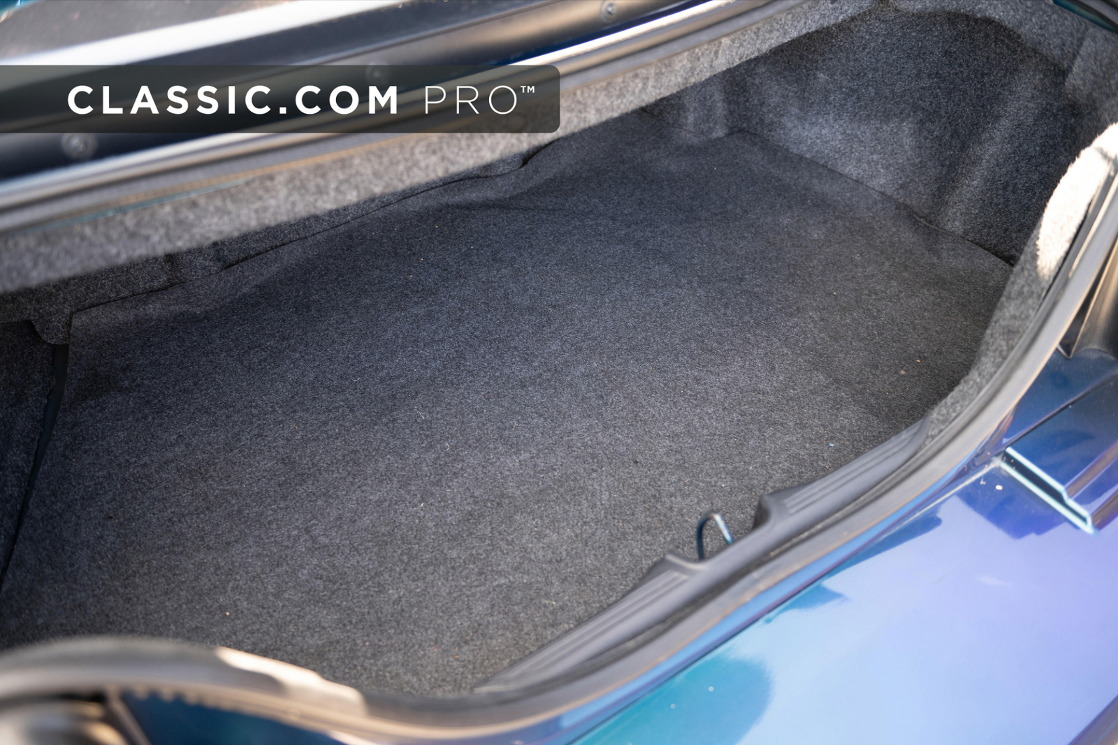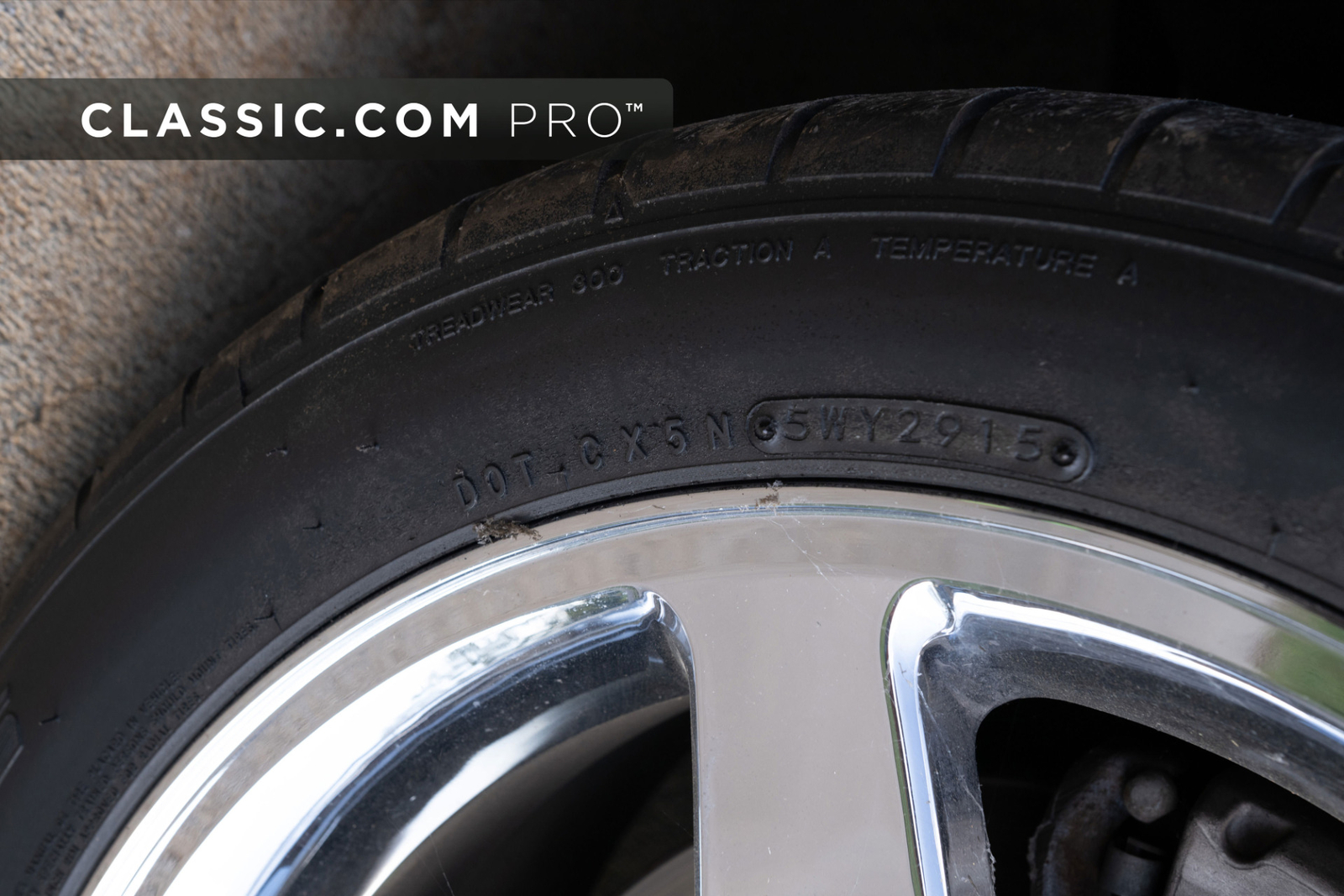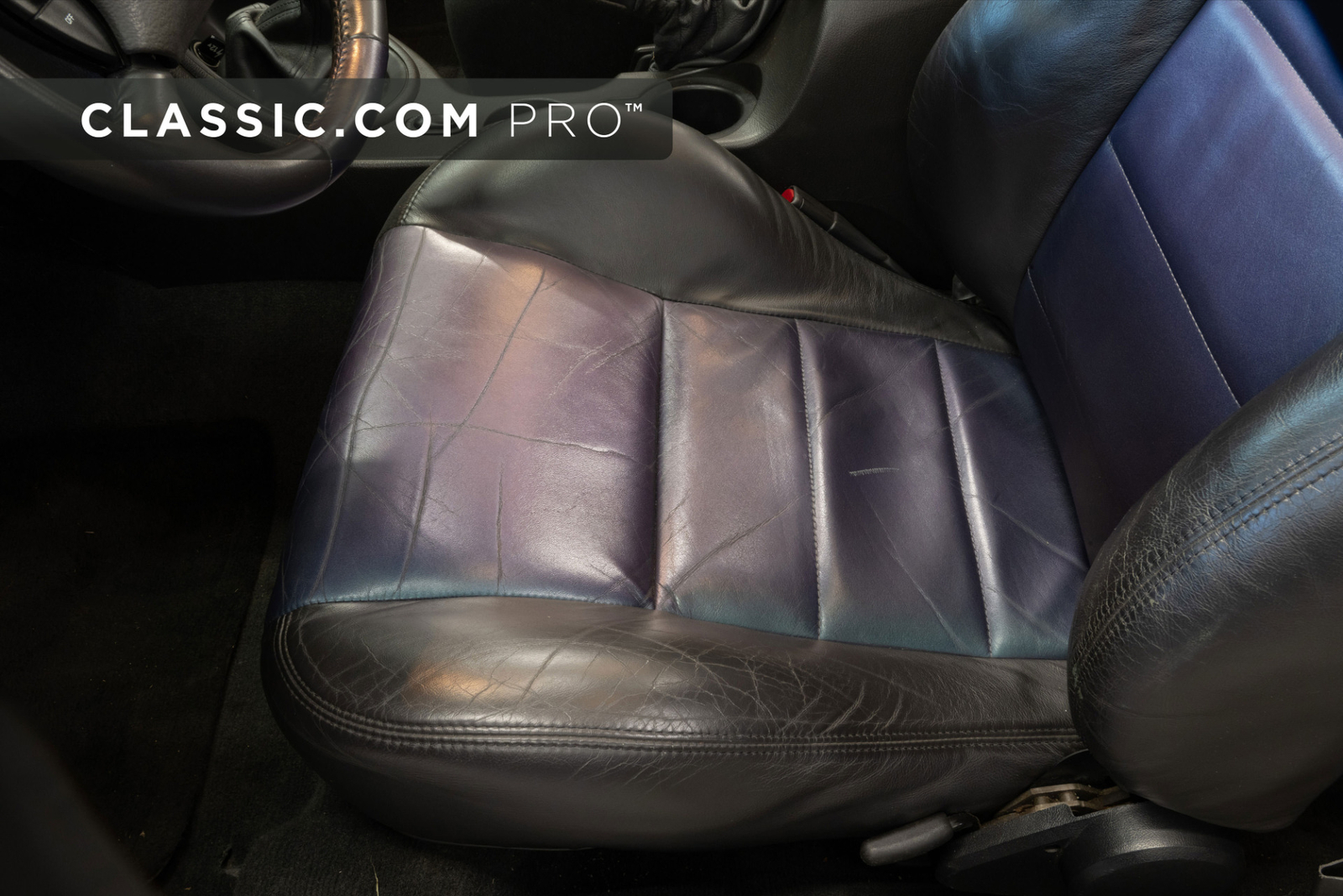 A third-party inspection and detailed photos document the original, low-mileage condition of the vehicle. The exterior paint shows minor paint chips and light scratches that are consistent with the age of the vehicle. There is a small dent on the front bumper that can be seen in the closeup images. The chrome wheels and the black convertible soft-top are found to be free of blemishes. The leather driver's seat shows some creasing and minor wear but the two-tone upholstery is otherwise in good condition. Photos show minor staining of the rear carpet but the vehicle shows light use overall. The accident-free CarFax shows dealership maintenance and an August 2017 entry shows the current mileage indicating the vehicle has been stored for the past six years. Included in the sale are one set of keys, a reproduction window sticker, the original owner's manual, and a wheel lock removal tool.