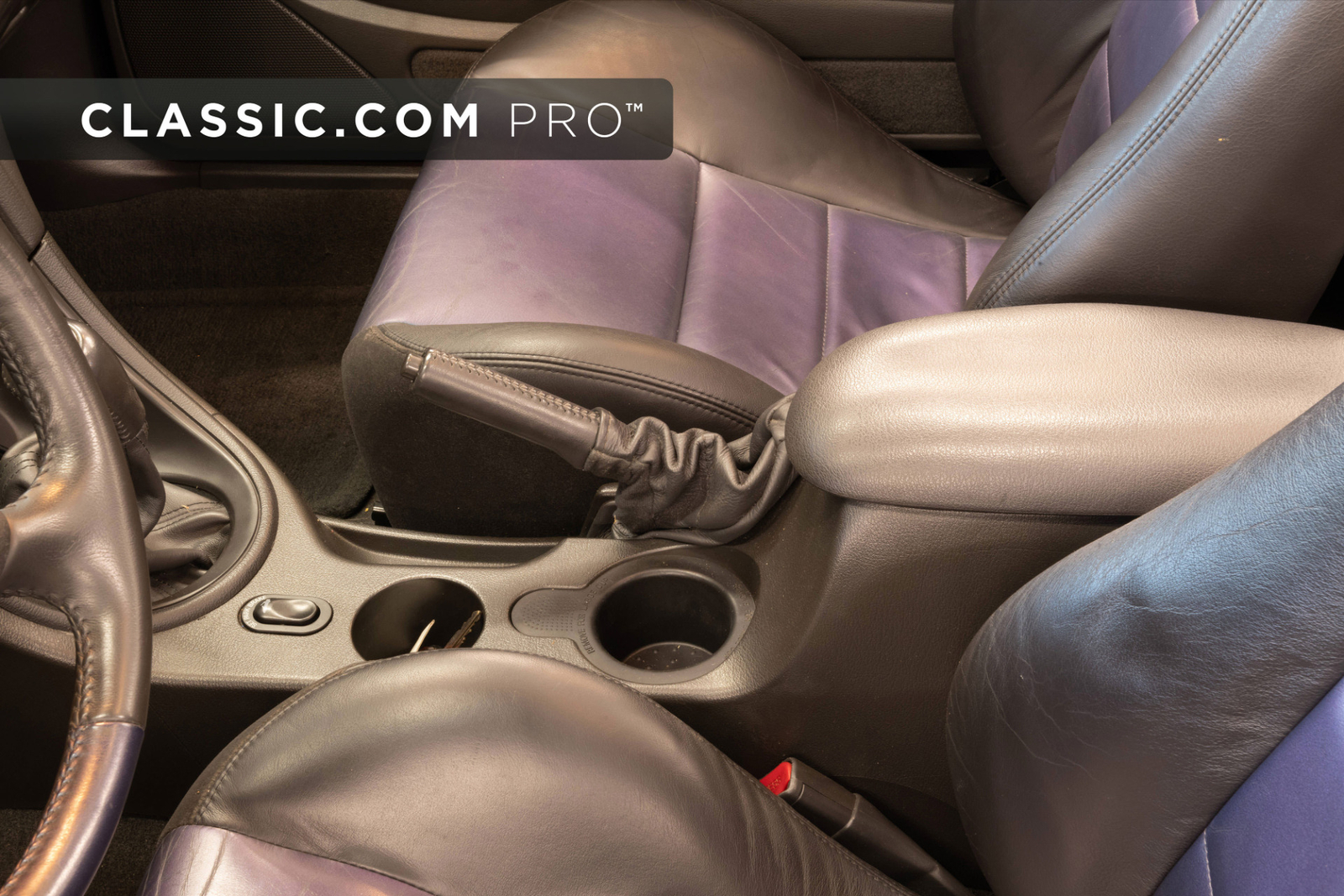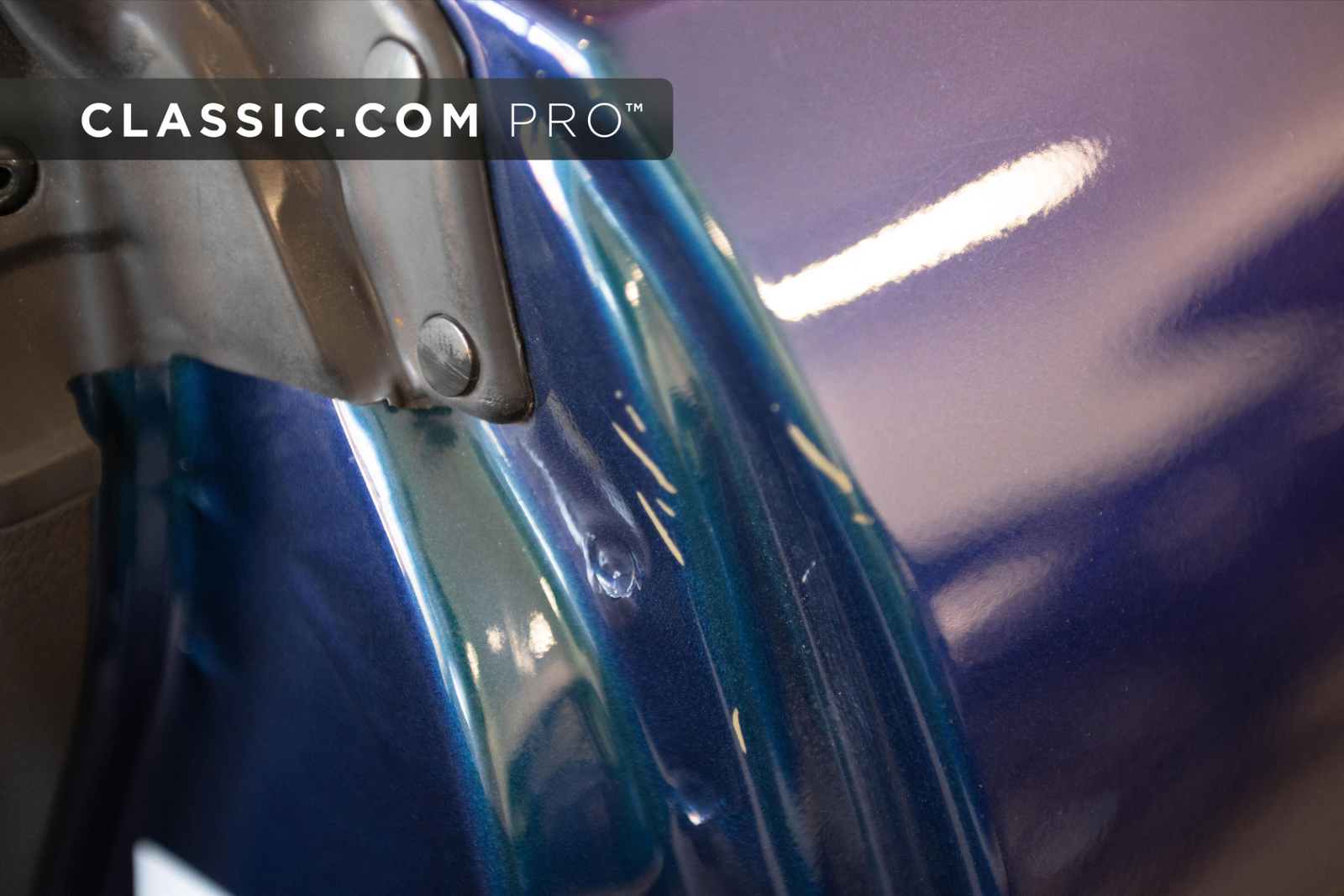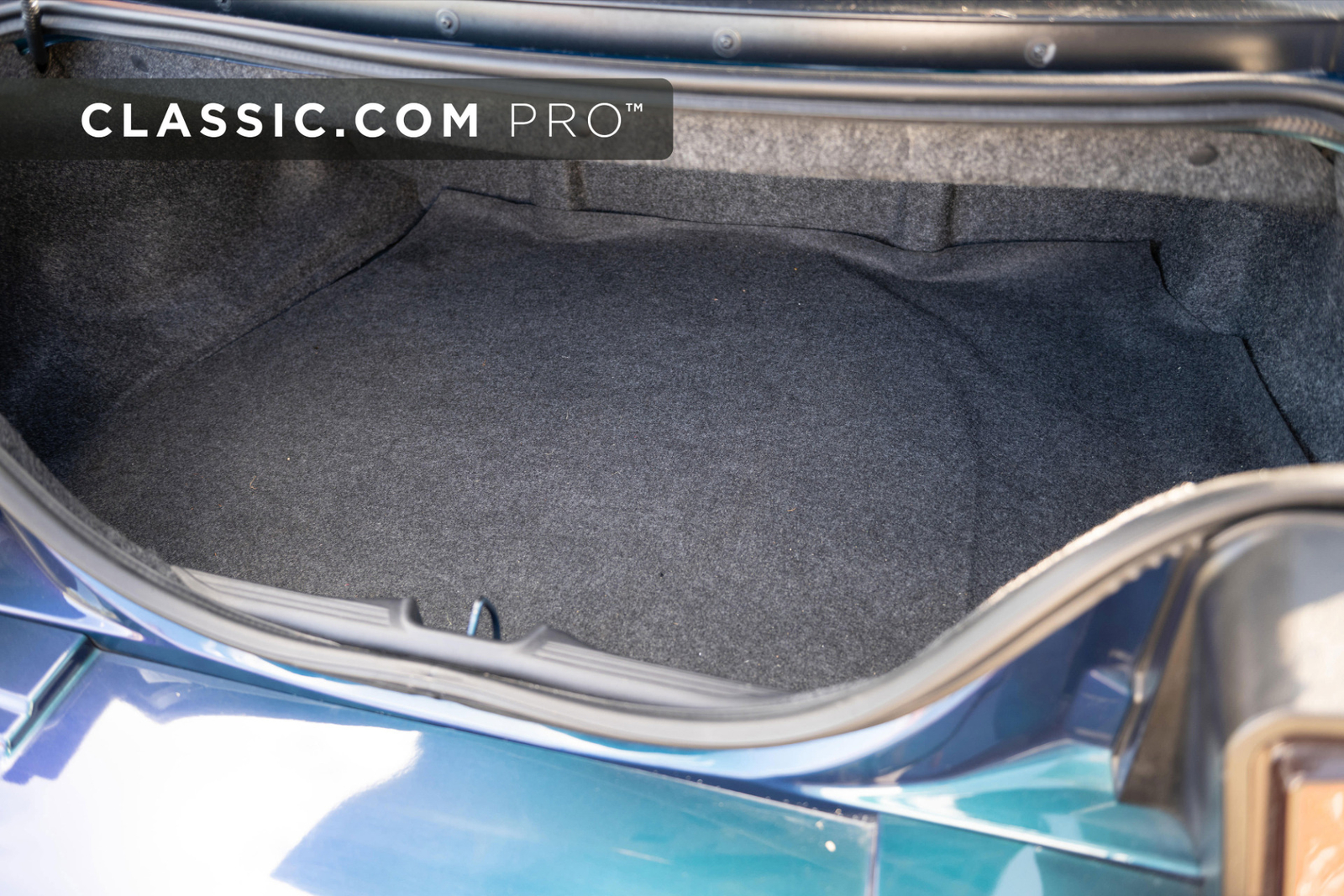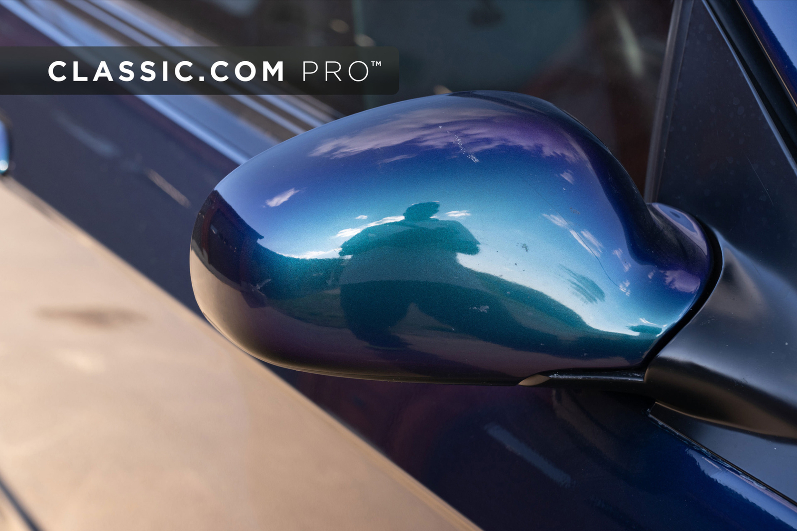 A third-party inspection and detailed photos document the original, low-mileage condition of the vehicle. The exterior paint shows minor paint chips and light scratches that are consistent with the age of the vehicle. There is a small dent on the front bumper that can be seen in the closeup images. The chrome wheels and the black convertible soft-top are found to be free of blemishes. The leather driver's seat shows some creasing and minor wear but the two-tone upholstery is otherwise in good condition. Photos show minor staining of the rear carpet but the vehicle shows light use overall. The accident-free CarFax shows dealership maintenance and an August 2017 entry shows the current mileage indicating the vehicle has been stored for the past six years. Included in the sale are one set of keys, a reproduction window sticker, the original owner's manual, and a wheel lock removal tool.