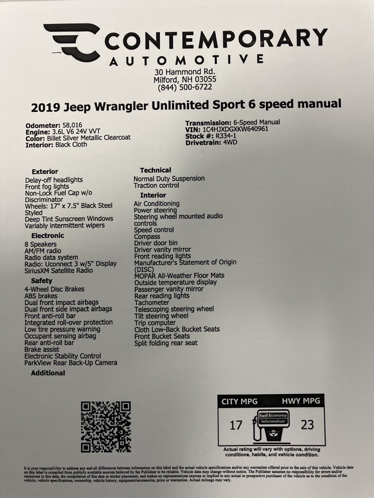 CONTEMPORARY CHRYSLER DODGE JEEP RAM is proud to present you with another True Market Priced Pre-Owned Vehicle. This 2019 Jeep Wrangler Unlimited Sport 6 speed manual is loaded with the following Factory Options: Quick Order Package 23B, 3.45 Rear Axle Ratio, 4-Wheel Disc Brakes, 8 Speakers, ABS brakes, Air Conditioning, AM/FM radio, Brake assist, Cloth Low-Back Bucket Seats, Compass, Deep Tint Sunscreen Windows, Delay-off headlights, Driver door bin, Driver vanity mirror, Dual front impact airbags, Dual front side impact airbags, Electronic Stability Control, Front anti-roll bar, Front Bucket Seats, Front Center Armrest w/Storage, Front fog lights, Front reading lights, Integrated roll-over protection, Low tire pressure warning, Manufacturer's Statement of Origin (DISC), MOPAR All-Weather Floor Mats, Non-Lock Fuel Cap w/o Discriminator, Normal Duty Suspension, Occupant sensing airbag, Outside temperature display, ParkView Rear Back-Up Camera, Passenger door bin, Passenger vanity mirror, Power steering, Radio data system, Radio: Uconnect 3 w/5 Display, Rear anti-roll bar, Rear reading lights, SiriusXM Satellite Radio, Speed control, Split folding rear seat, Steering wheel mounted audio controls, Tachometer, Telescoping steering wheel, Tilt steering wheel, Traction control, Trip computer, Variably intermittent wipers, and Wheels: 17 x 7.5 Black Steel Styled!!