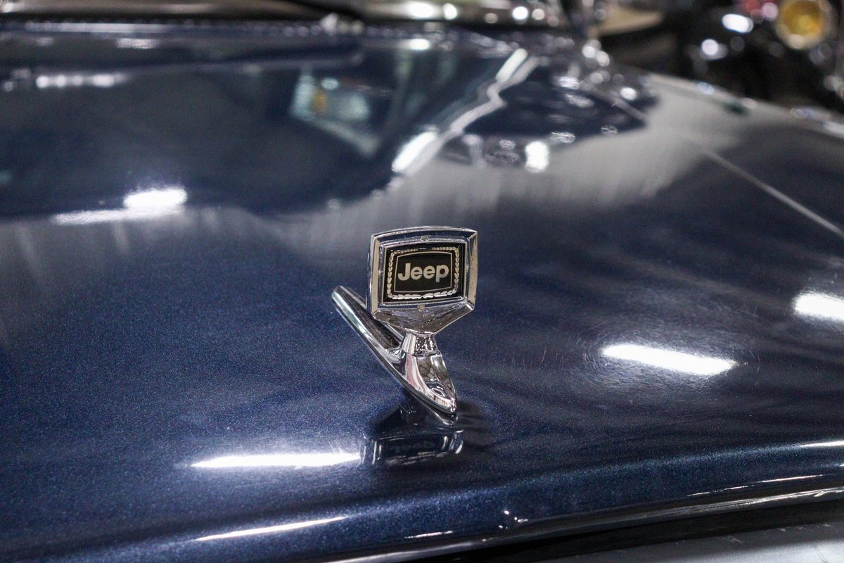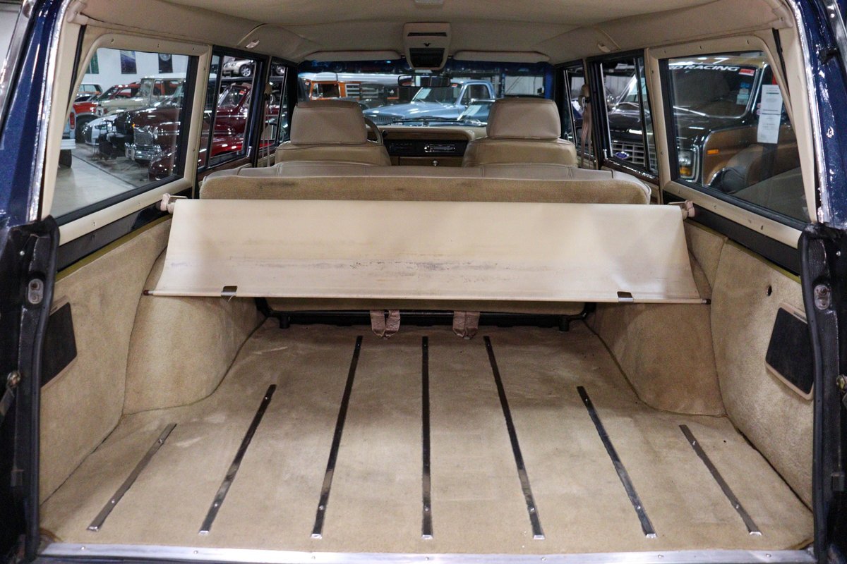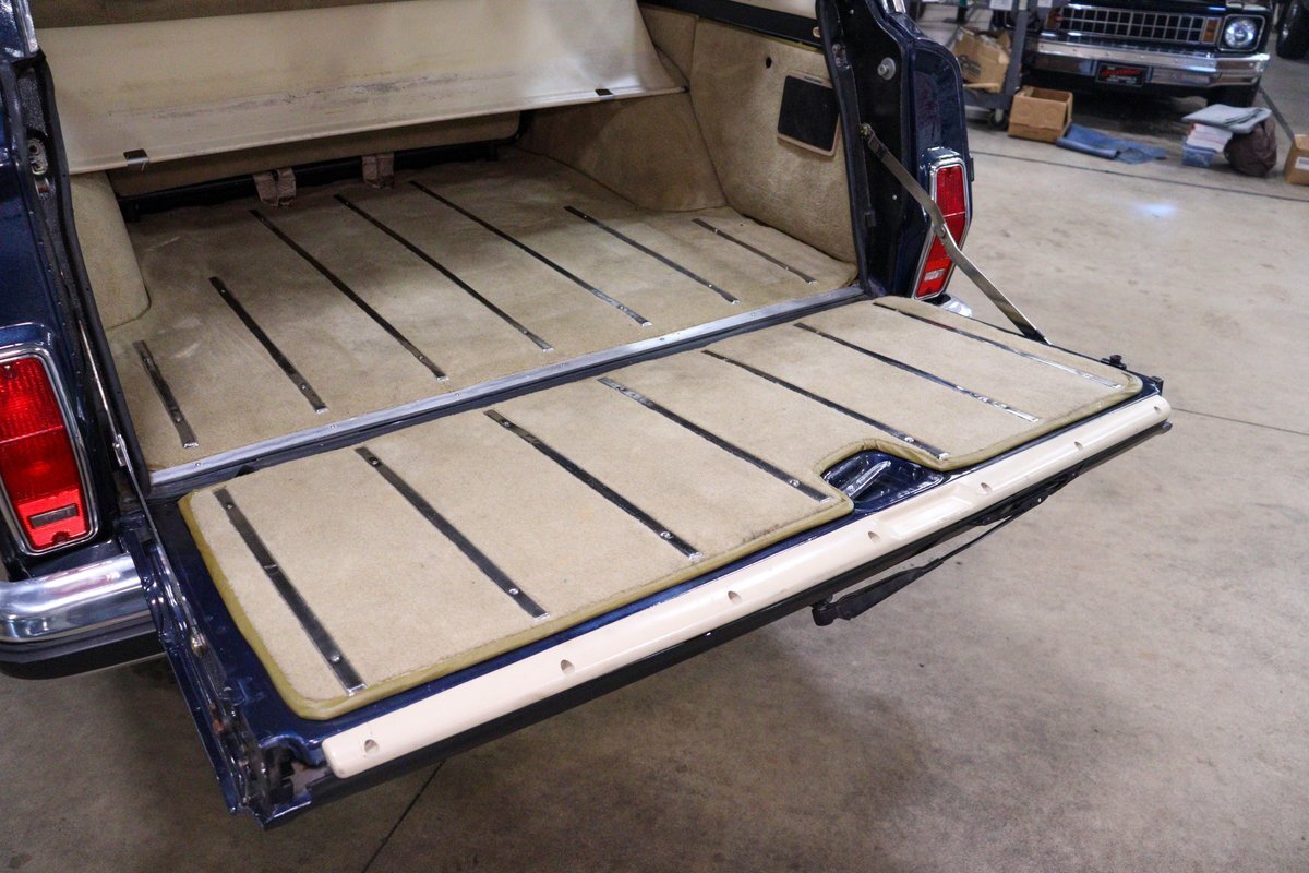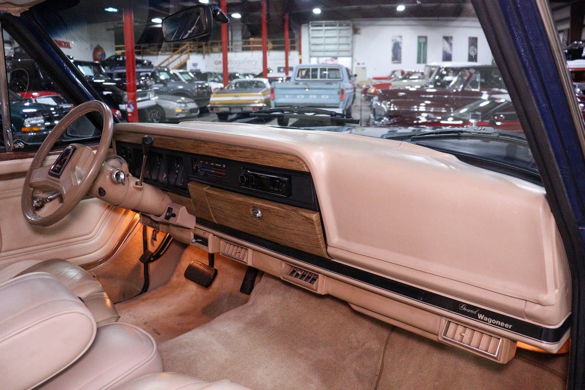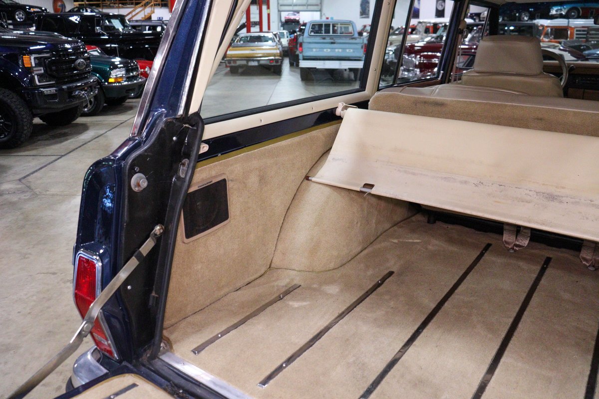The exterior of this Grand Wagoneer gleams in a fresh Baltic Blue Metallic paint job, beautifully accented by new wood grain sides. During the restoration, any signs of oxidation were meticulously cut out and replaced with solid sheet metal, ensuring a solid body. The polished metal trims have been buffed to shine, and new weather stripping has been installed throughout. This Jeep also features a rear power window and a rear storage cover for added convenience.